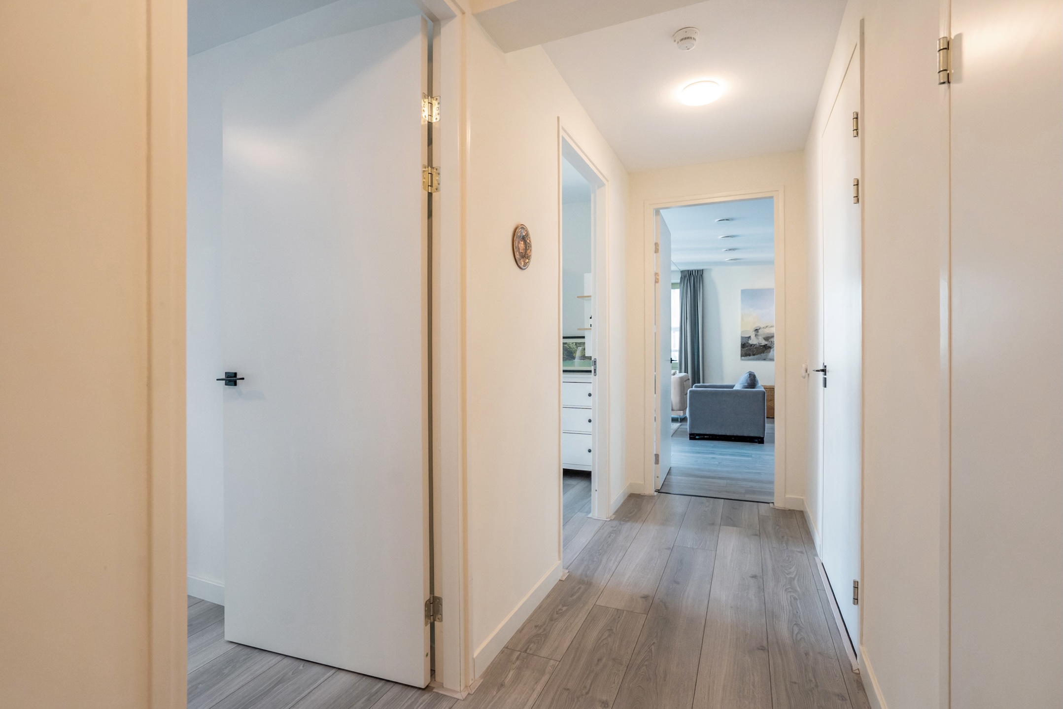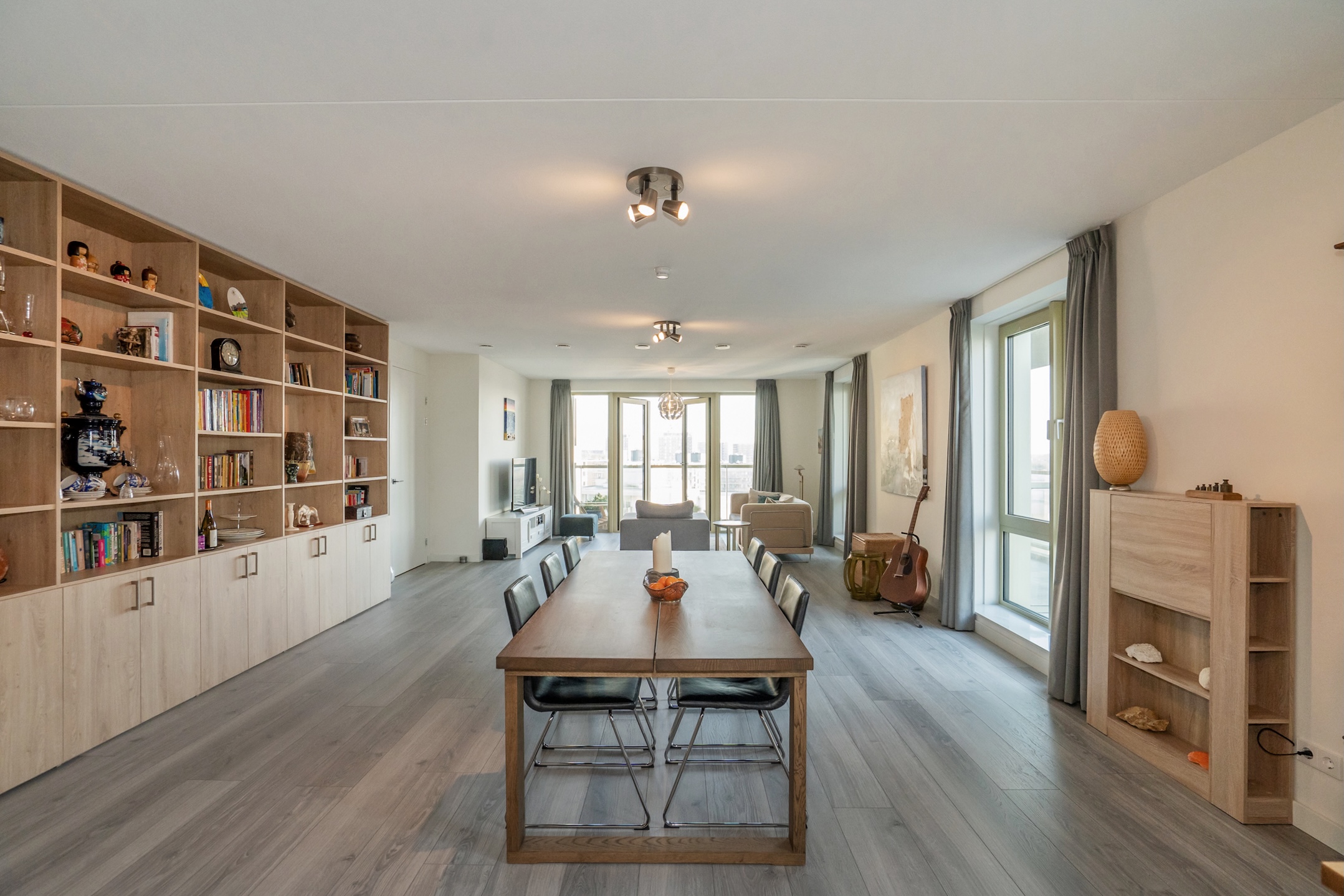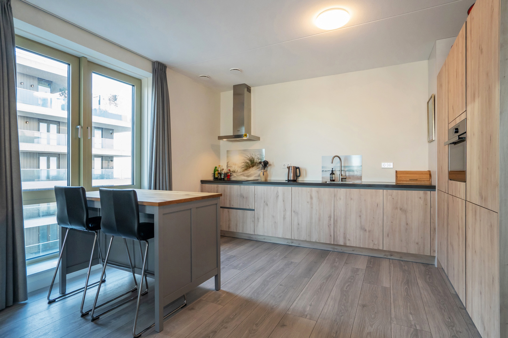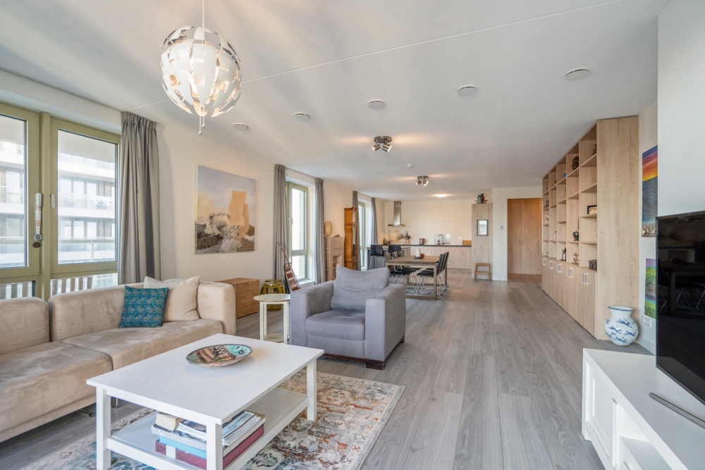 Behind the front door, you enter a spacious entrance hall with a wide closet wall for coats and shoes. There is also access to a separate deep toilet. Through a closed door, you enter the impressive living room with large floor-to-ceiling windows and the open kitchen, together creating a pleasant living space. A neat kitchen arranged along the width, equipped with all necessary built-in appliances such as a refrigerator, freezer, induction cooktop, combination microwave, and dishwasher. From the living room and kitchen, you always have a diagonal view of the sea.