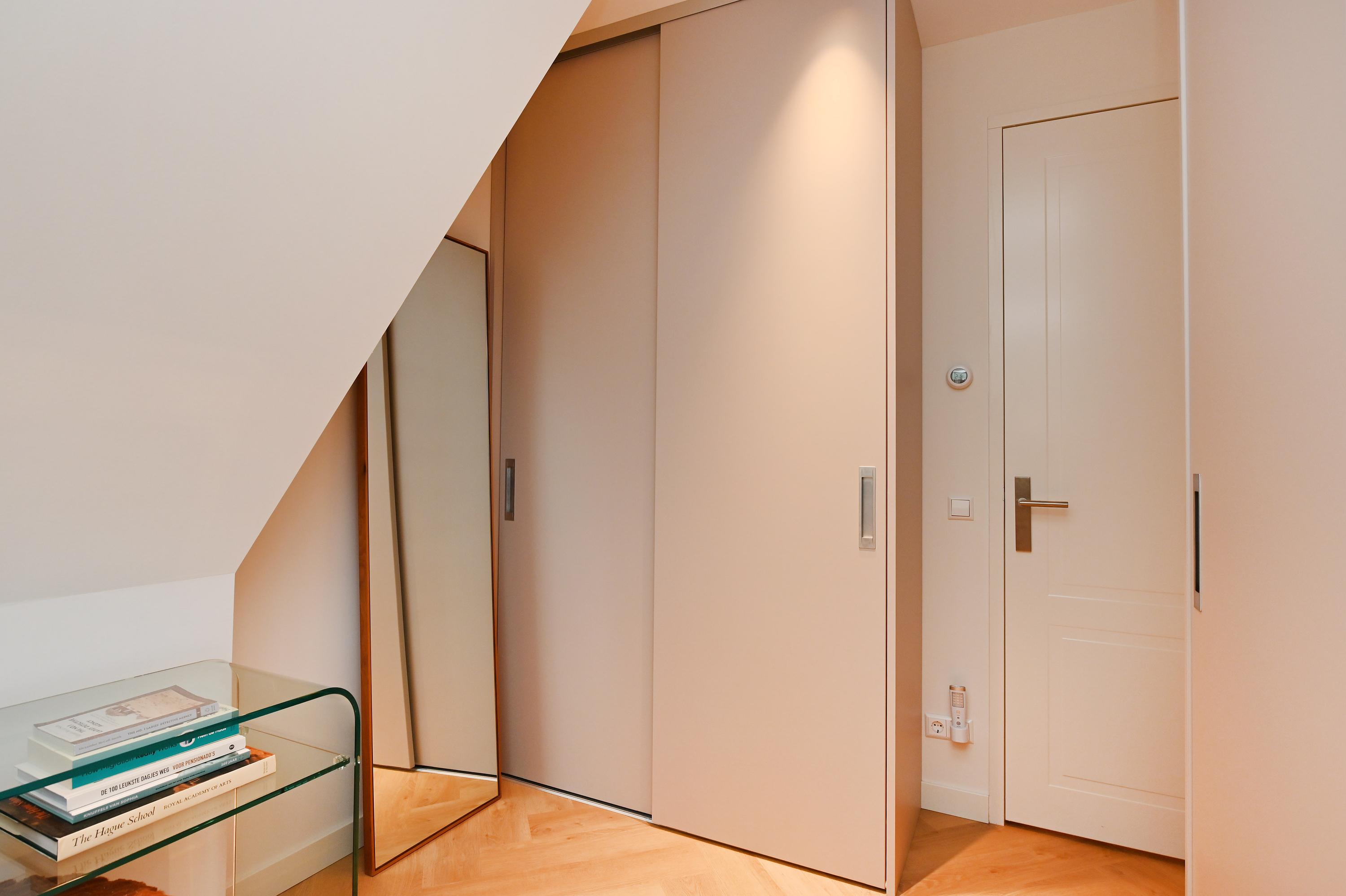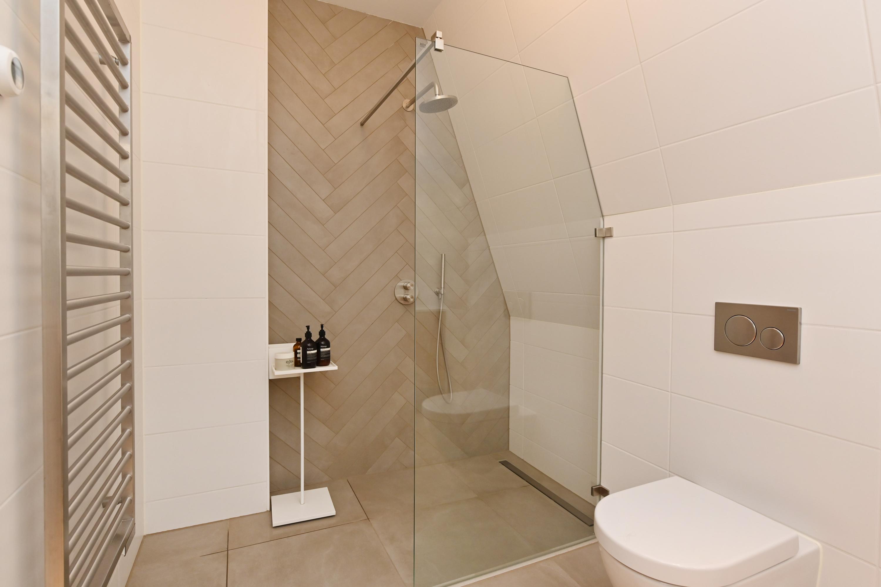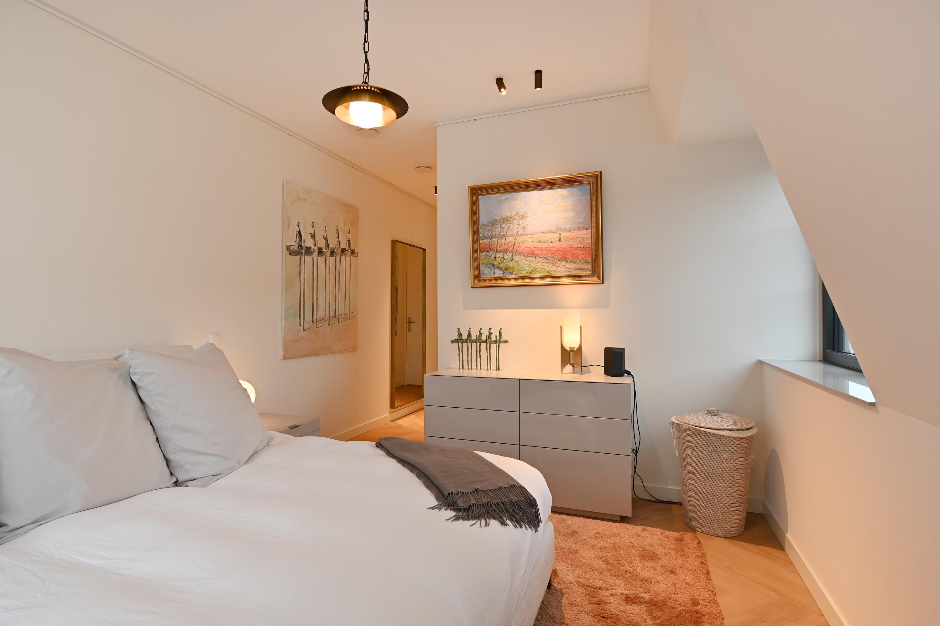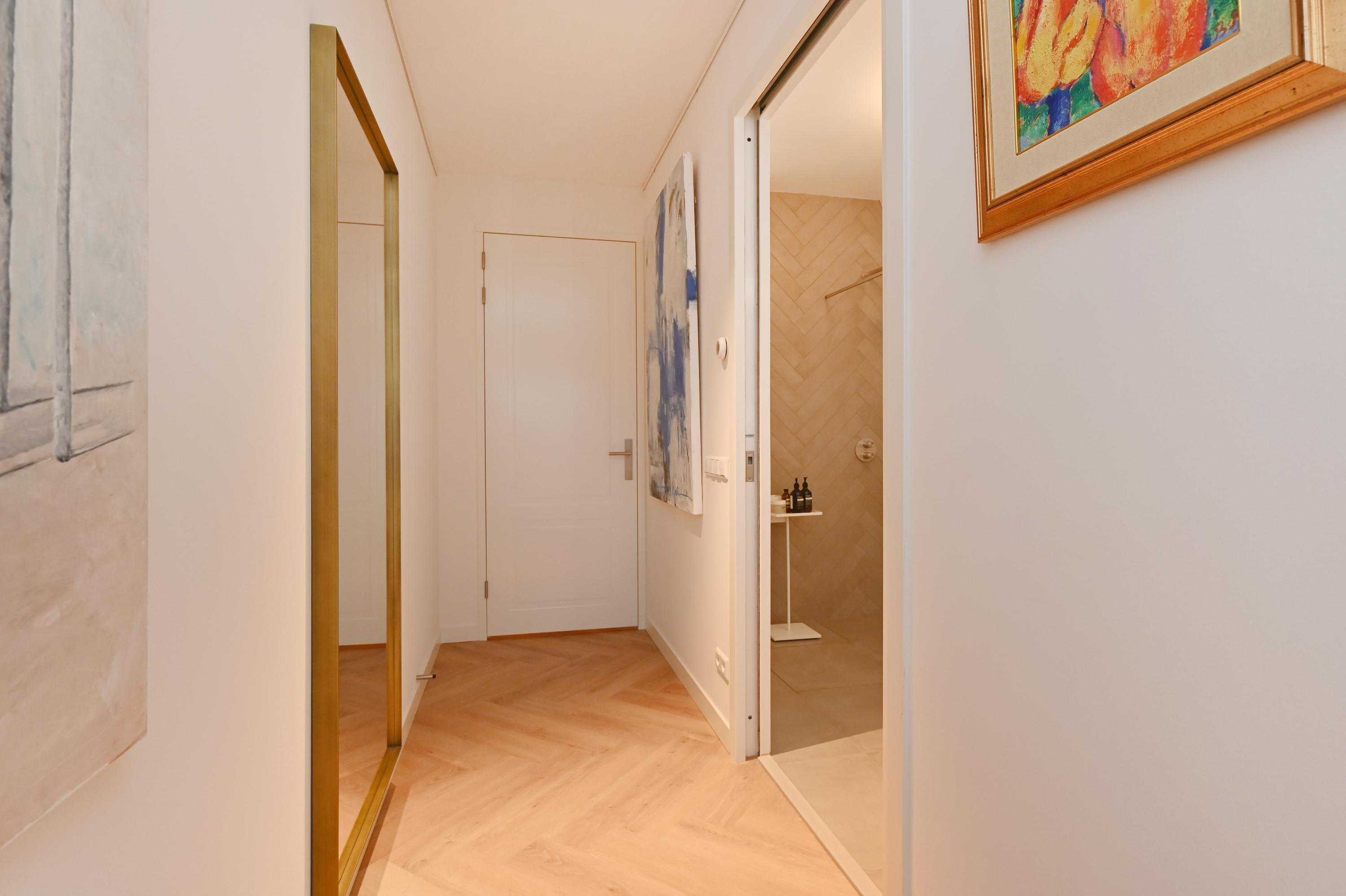 Staircase with elevator, central hall, spacious and bright living room with an L-shaped Poggenpohl kitchen featuring modern built-in appliances (such as an induction hob, oven, and Quooker) and an adjoining seating bar. Through a double sliding door, the living room provides access to the spacious terrace (approx. 13.5 m²) with afternoon and evening sun, unobstructed views, and modern finishes. Spacious master bedroom with an en-suite bathroom featuring a rain shower, toilet, and double sink. 2nd spacious bedroom with built-in wardrobe and 3rd bedroom with built-in wardrobes. Both of these bedrooms can also be used as office or hobby spaces. Modern and spacious bathroom with rain shower, double sinks, and mirror lighting. Separate toilet in the hallway.