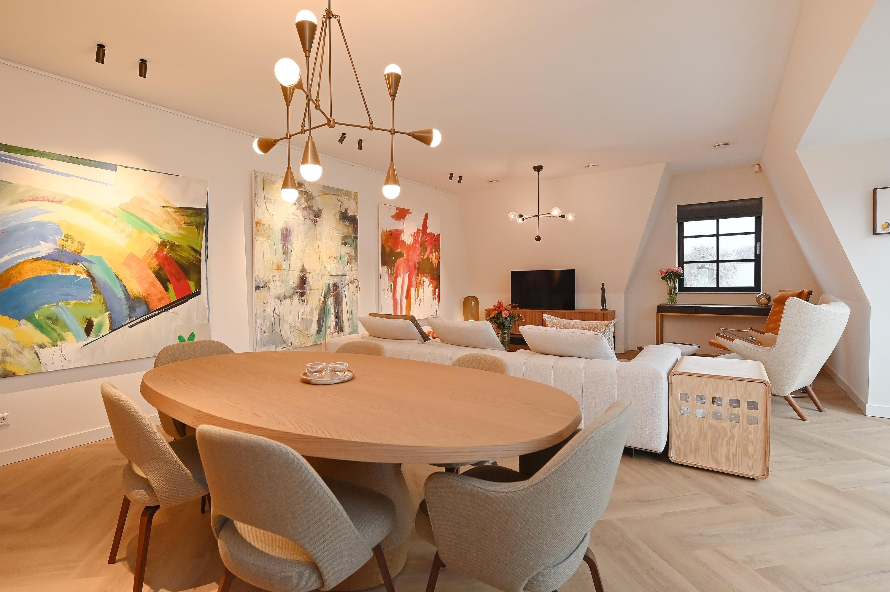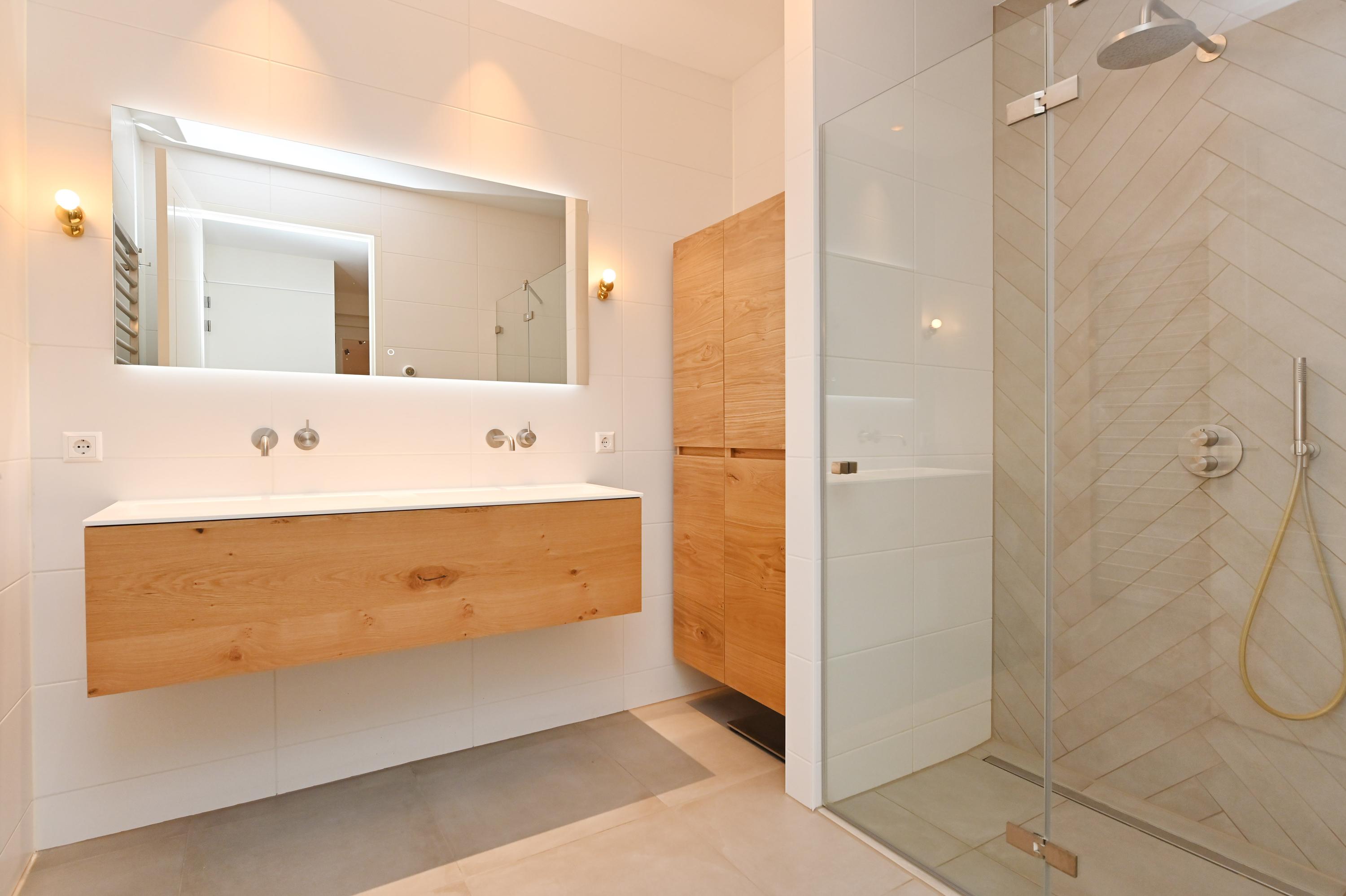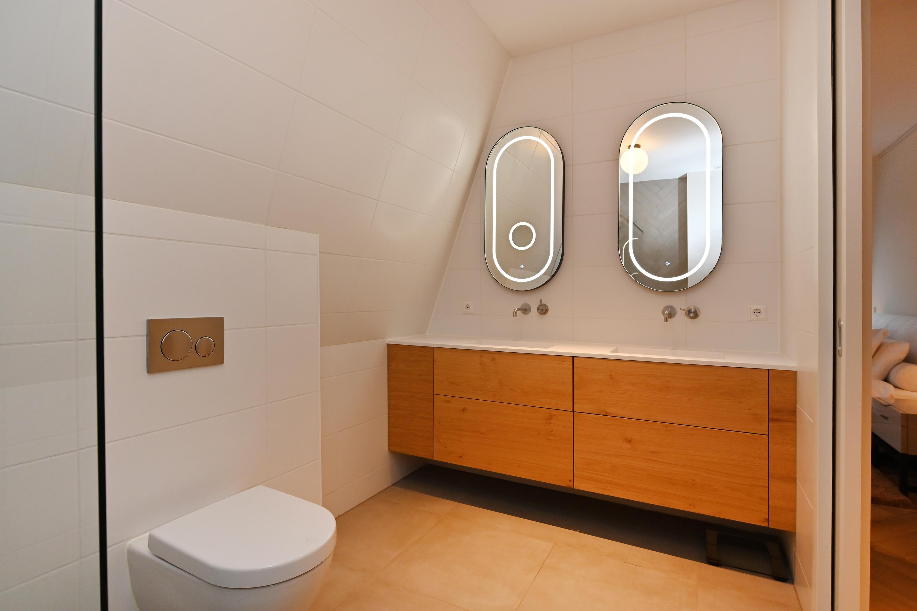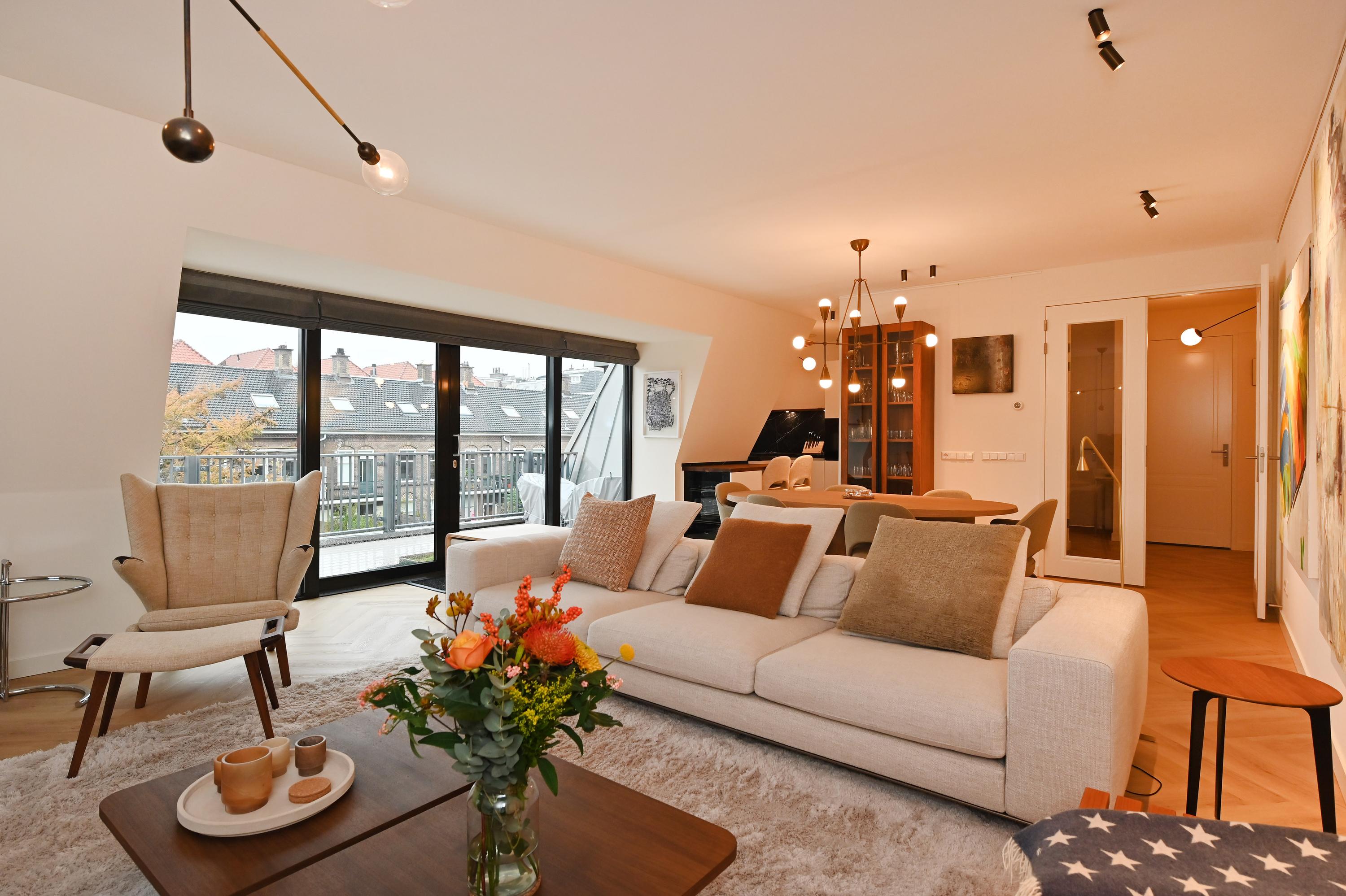Staircase with elevator, central hall, spacious and bright living room with an L-shaped Poggenpohl kitchen featuring modern built-in appliances (such as an induction hob, oven, and Quooker) and an adjoining seating bar. Through a double sliding door, the living room provides access to the spacious terrace (approx. 13.5 m²) with afternoon and evening sun, unobstructed views, and modern finishes. Spacious master bedroom with an en-suite bathroom featuring a rain shower, toilet, and double sink. 2nd spacious bedroom with built-in wardrobe and 3rd bedroom with built-in wardrobes. Both of these bedrooms can also be used as office or hobby spaces. Modern and spacious bathroom with rain shower, double sinks, and mirror lighting. Separate toilet in the hallway.