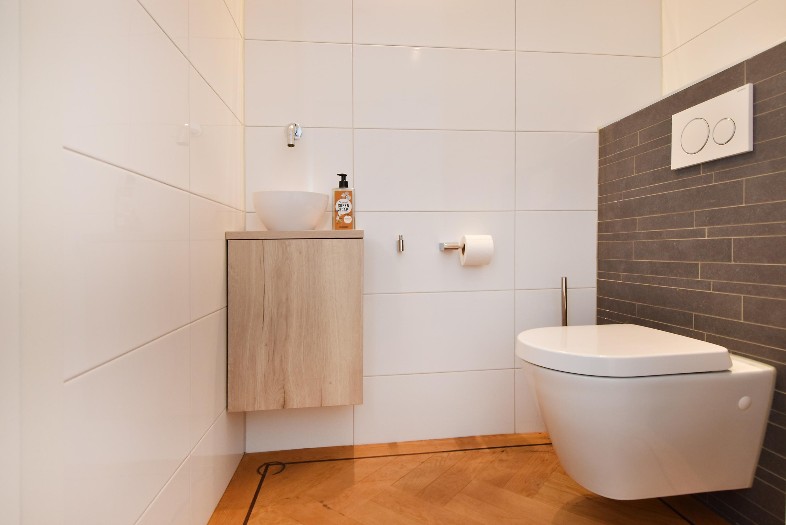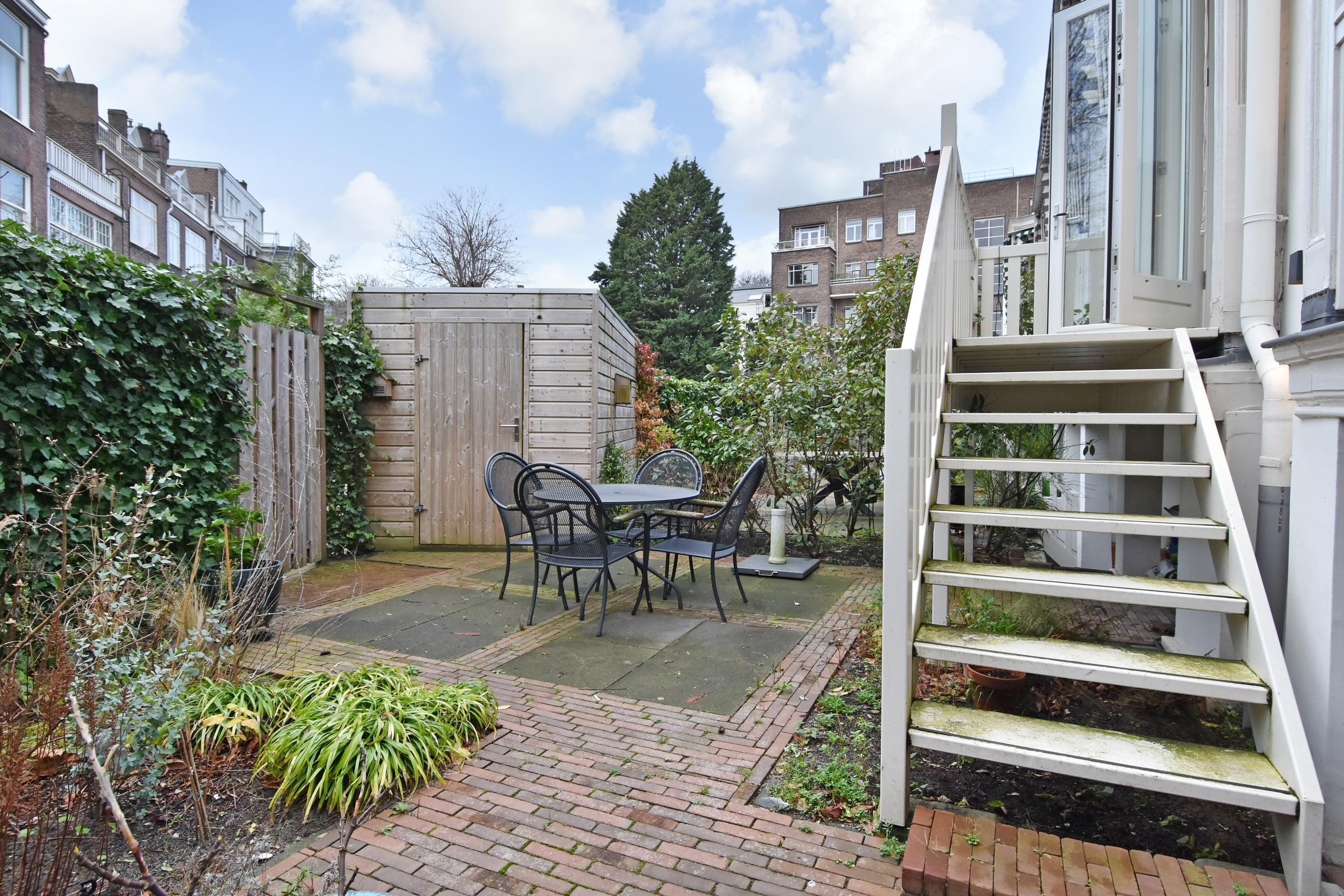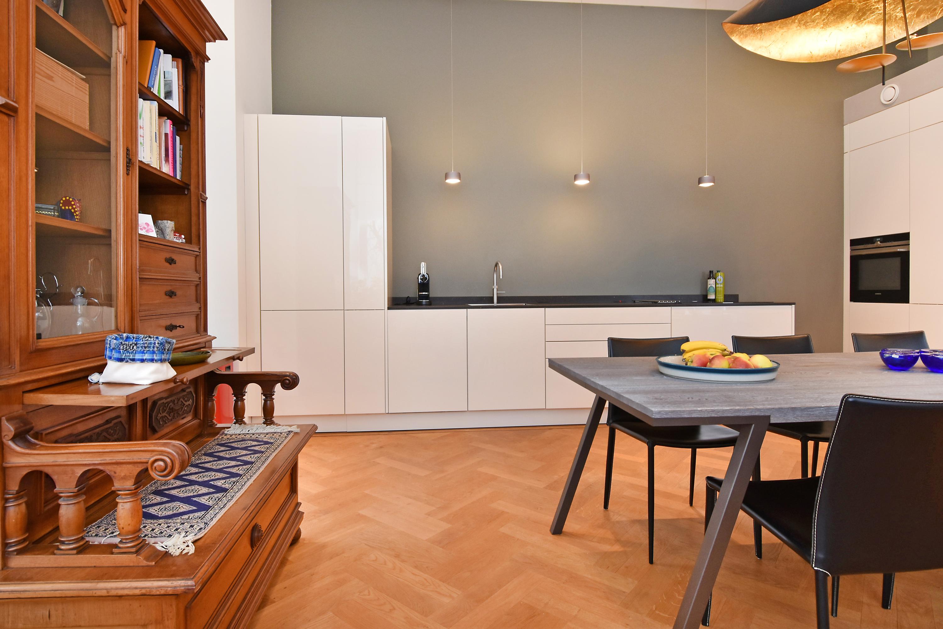 The elevated ground floor hosts the inviting living and dining space, marked by an oak herringbone parquet with underfloor heating and ceilings close to four metres. An open-plan kitchen is equipped with integrated appliances, including an induction cooktop, Quooker, and design lighting. The flow leads out to a balcony and sunlit south-facing garden with storeroom and private exterior entrance.