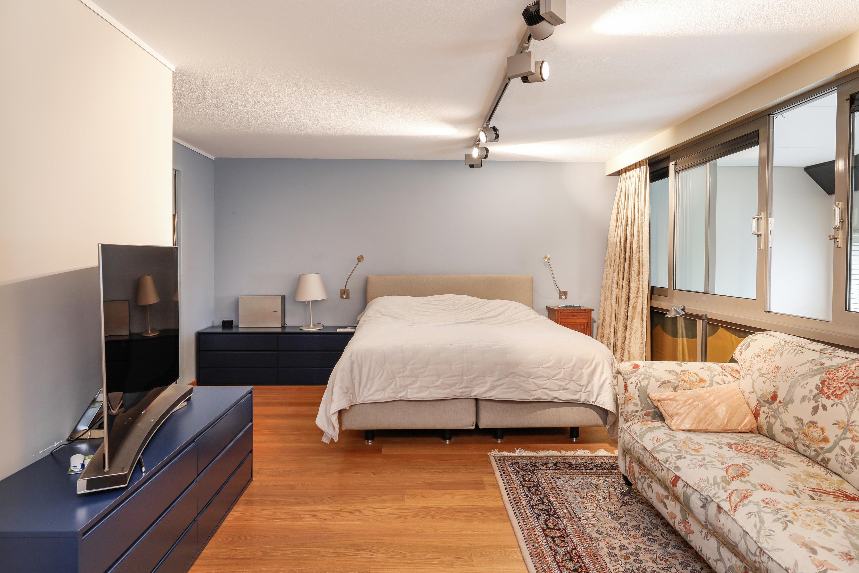 The bedroom is designed so that you'll have everything you need right at your fingertips. Naturally, there's plenty of space for the bed and bedside tables. Through the sliding door into the living room and further through the tall windows in the living room, you have a beautiful view of the courtyard. The bathroom and walk-in dressing room are en suite to this bedroom. There's also plenty of room for a sofa and TV. The walk-in dressing room was created from an originally planned mezzanine. A truly wonderful and very rewarding space. The dressing room is fully equipped for organized and practical storage of all your clothes.