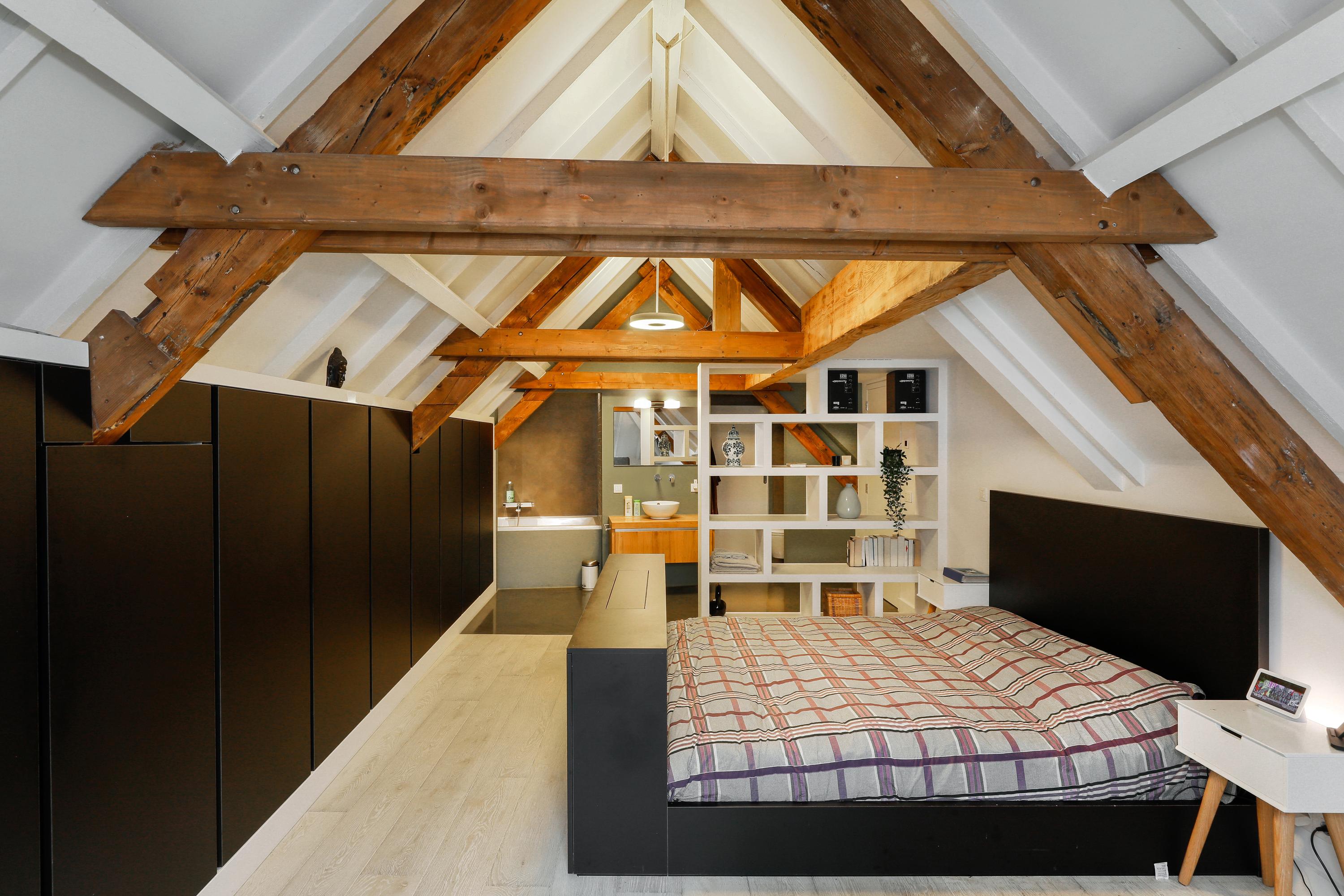 This was once an upstairs and downstairs apartment. By combining the two, a staircase could be removed. The current staircase is beautifully concealed behind a sliding door. We recognize this architect by the banister, but also by the interplay of lines on this staircase and the light line between the wall and the sloping surface. Laundry appliances are concealed in a cupboard on the spacious landing.