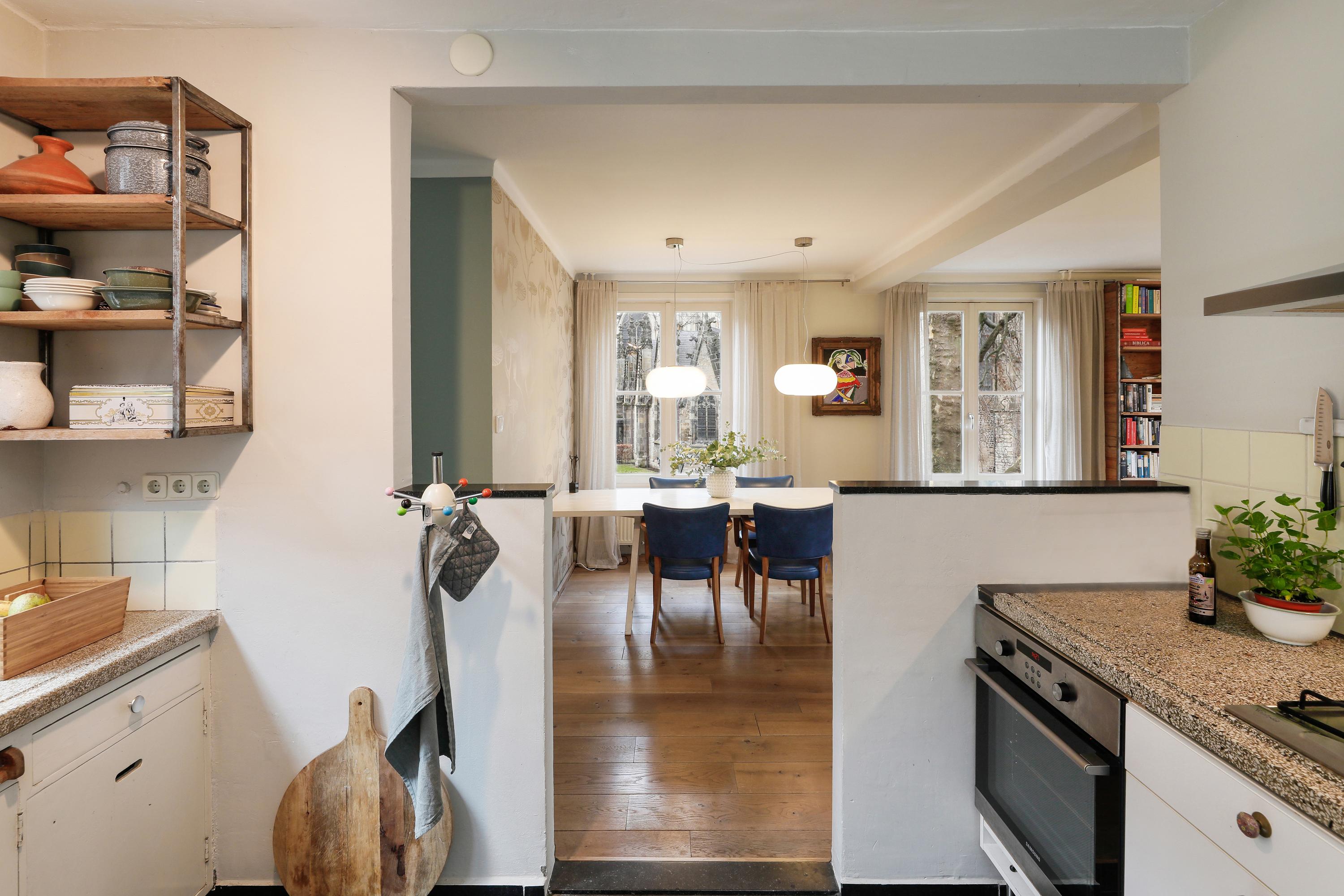 The living room is situated on the corner, offering a beautiful view of St. John's Cathedral and the adjacent square. The semi-open kitchen is connected without feeling like you're cooking in the living room. In addition to the roof terrace, this floor also features an additional room, ideal as a study or guest room.