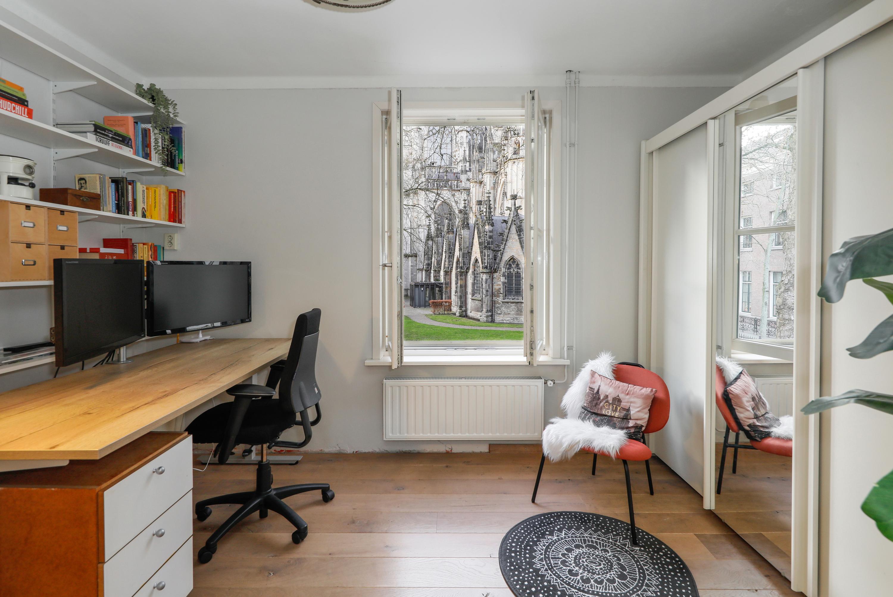 Located in the idyllic Sint Janskerkhof, right next to St. John's Cathedral, is this spacious and characterful upstairs apartment of approximately 125 m² with a roof terrace. A unique combination of tranquility, history, and city life, right in the heart of the city center yet surprisingly quiet.