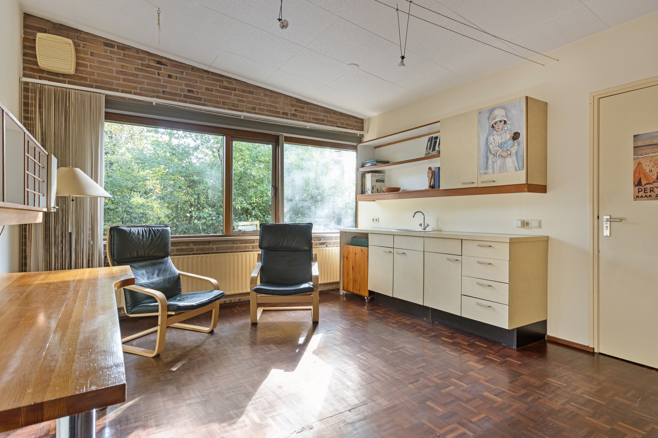 De royale woonkamer met grote raampartijen, schuifpui en open haard biedt een sfeervolle leefruimte met prachtig zicht op de tuin. Aansluitend de eetkamer en de halfopen keuken, uitgerust met onder andere een oven, vaatwasser, elektrische kookplaat en koelkast. De houten plafondafwerking zorgt voor een warme, karakteristieke uitstraling.