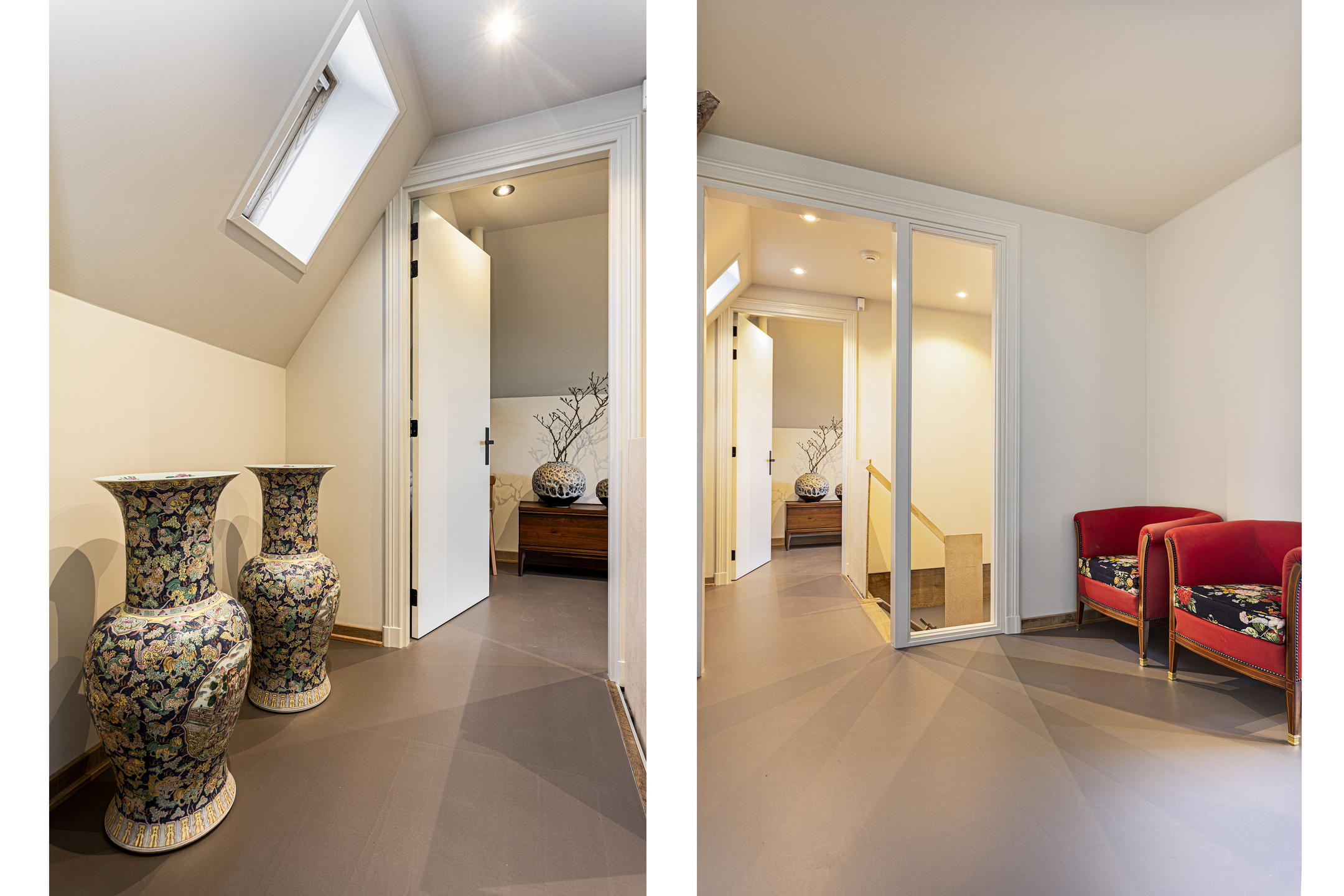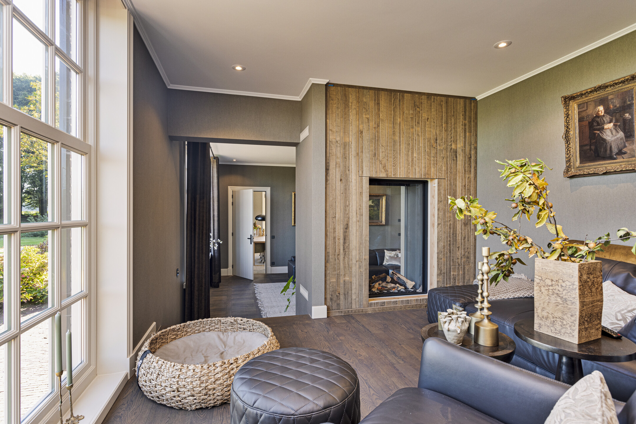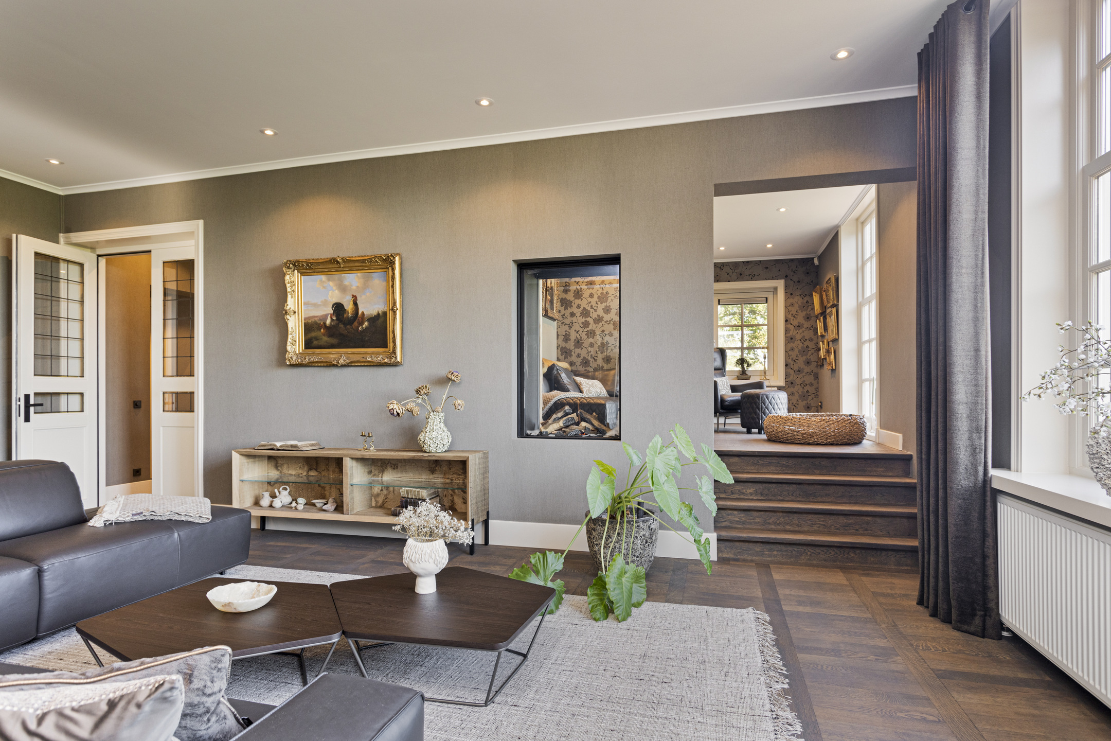 The living room has a magnificent floor; it is an old castle floor from the French chateau of the previous owners. The current residents had it beautifully sanded and coated with a refined gray floor oil, blending seamlessly into the contemporary interior. The music room is a room en-suite, separated from the living room by sliding doors, and now has the role of an old-fashioned art cabinet, but one whose indoor climate can be adjusted entirely as desired. If you do not have a Steinway or art collection to display here, then this is a wonderful study, library, cinema or dining room. To the left, overlooking the garden and side terrace, is the upstairs room, which shares a gas fireplace with the living room. A lovely corner to crawl away with a good book.