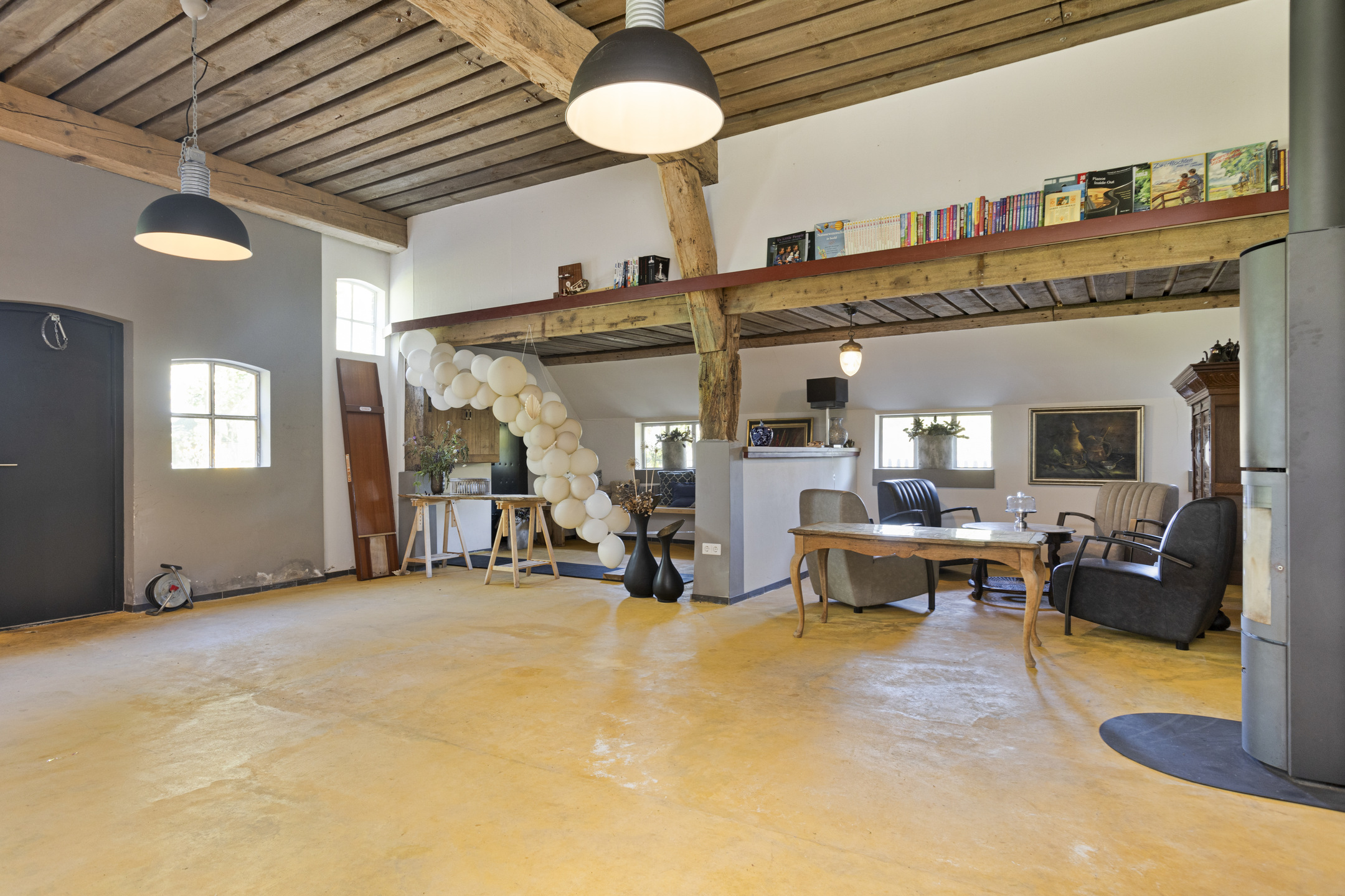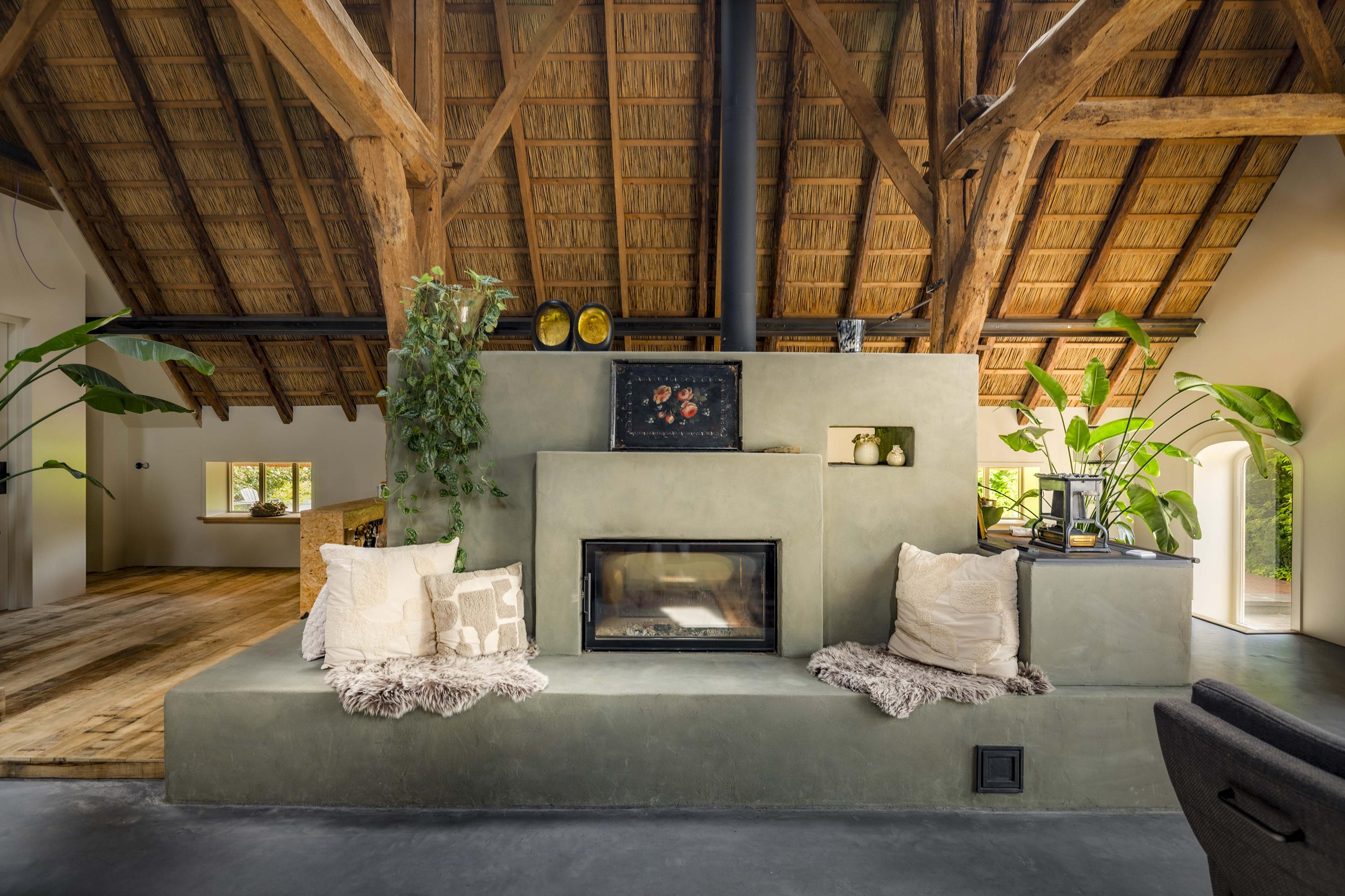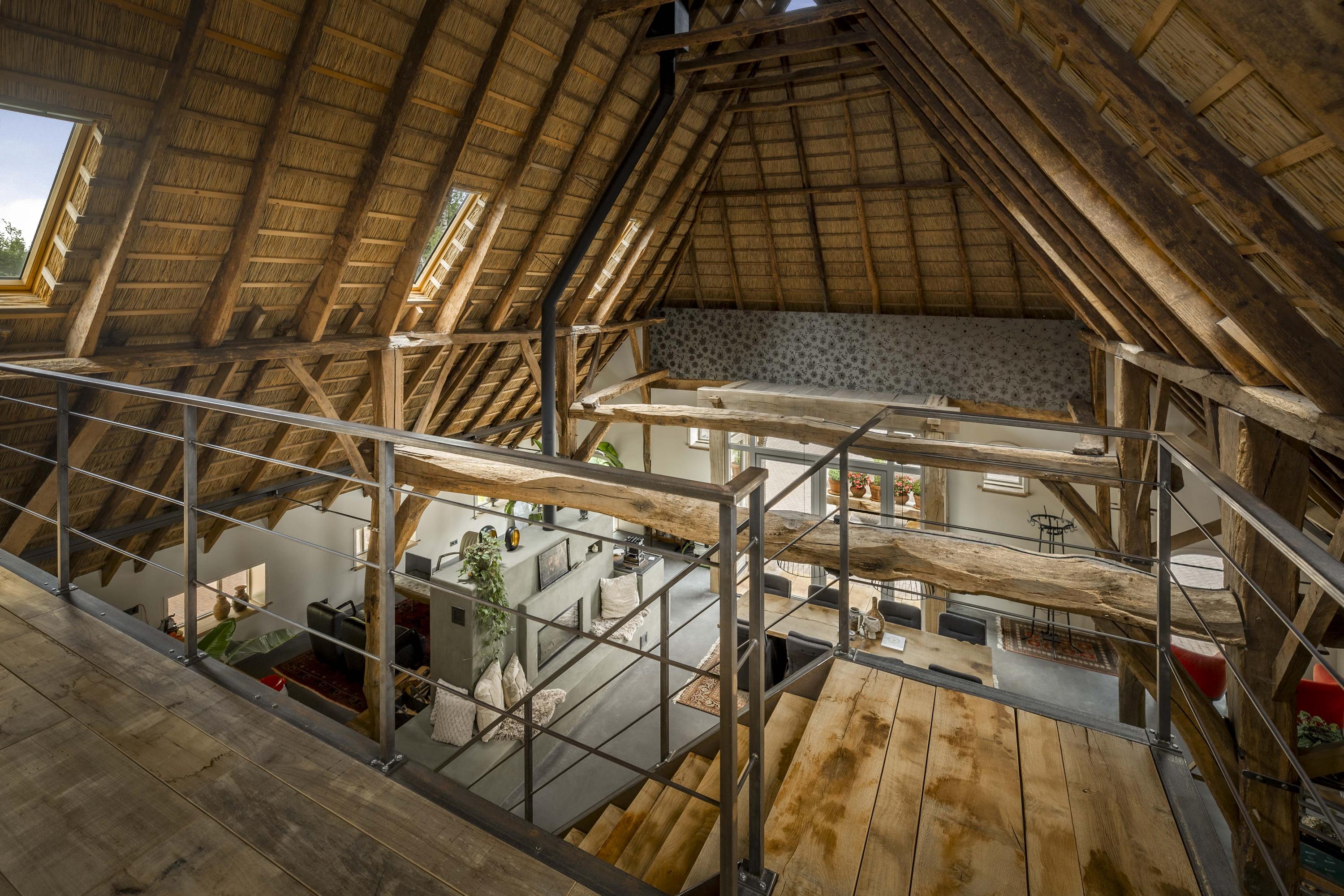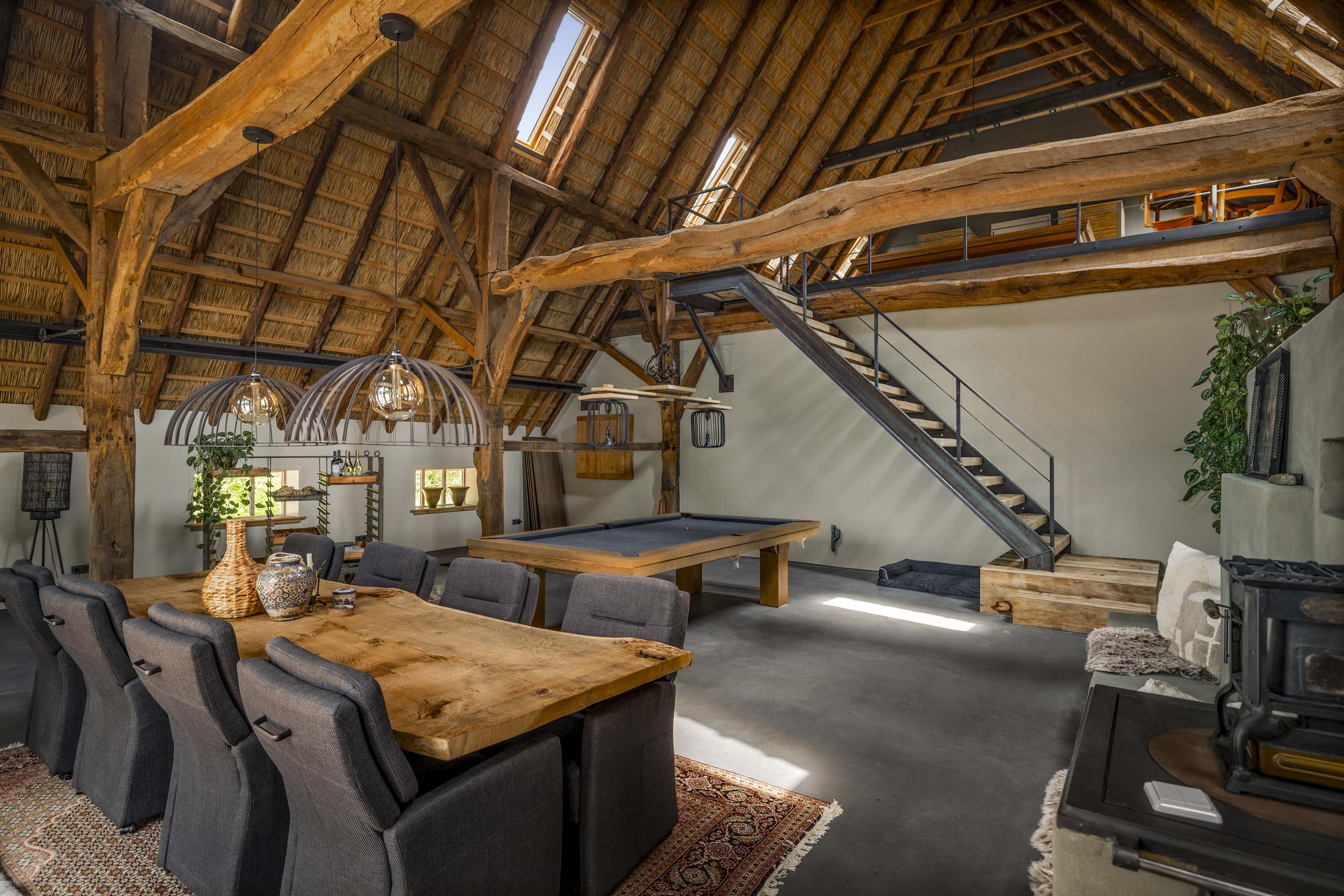 The part, where the cows used to ruminate, has been transformed into a super cool space; the rafters and the thick reed package (there is still insulation material in between) have been left in sight and the space is nice and light through the skylights. The concrete floor - ready for the installation of floor heating -, the beautiful loam stove and the staircase (forge Oldenhave from Vorden) give it a raw, industrial edge. Downstairs, two separate toilets have been installed. Upstairs, the billiard room will be realized.