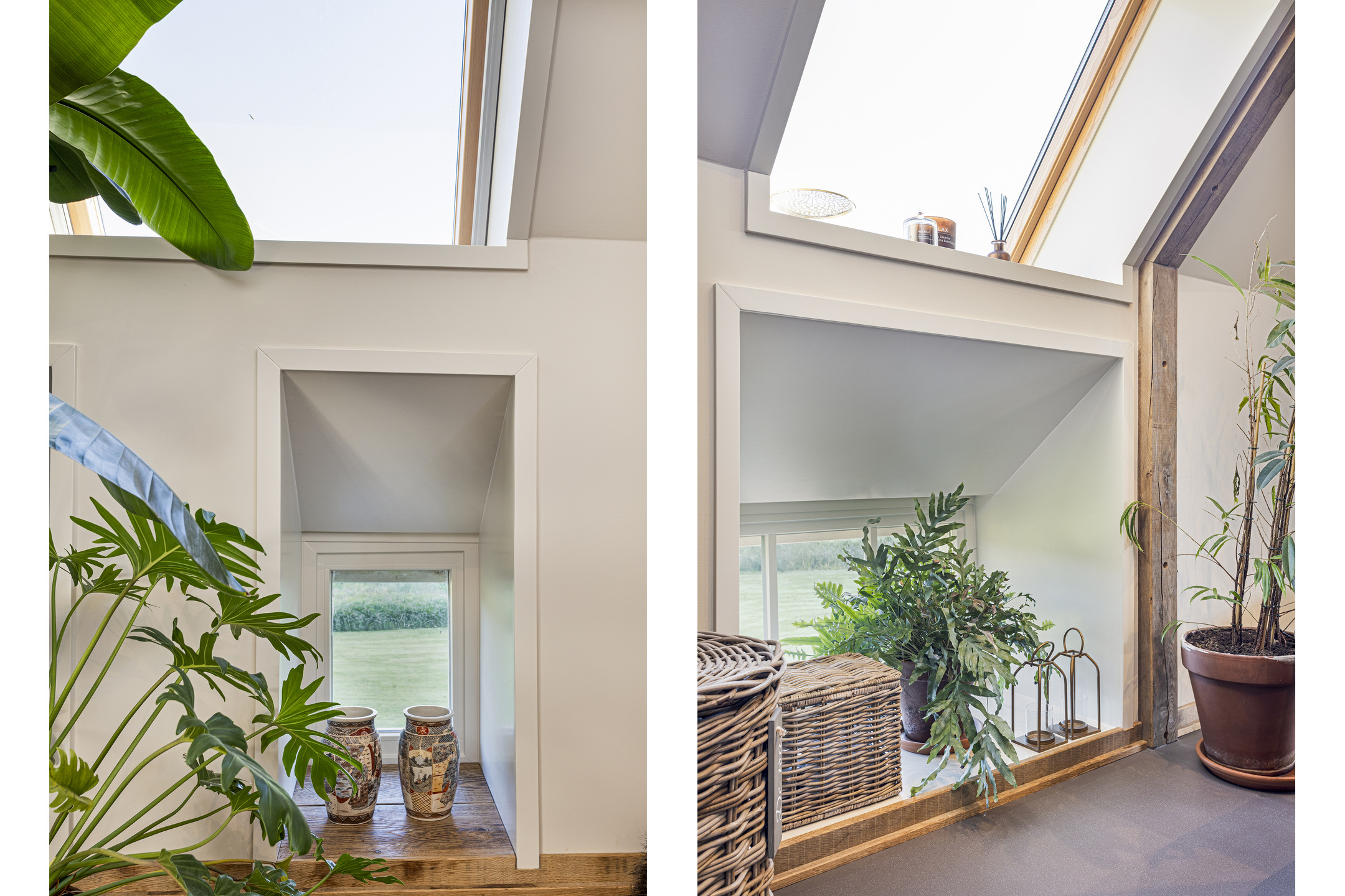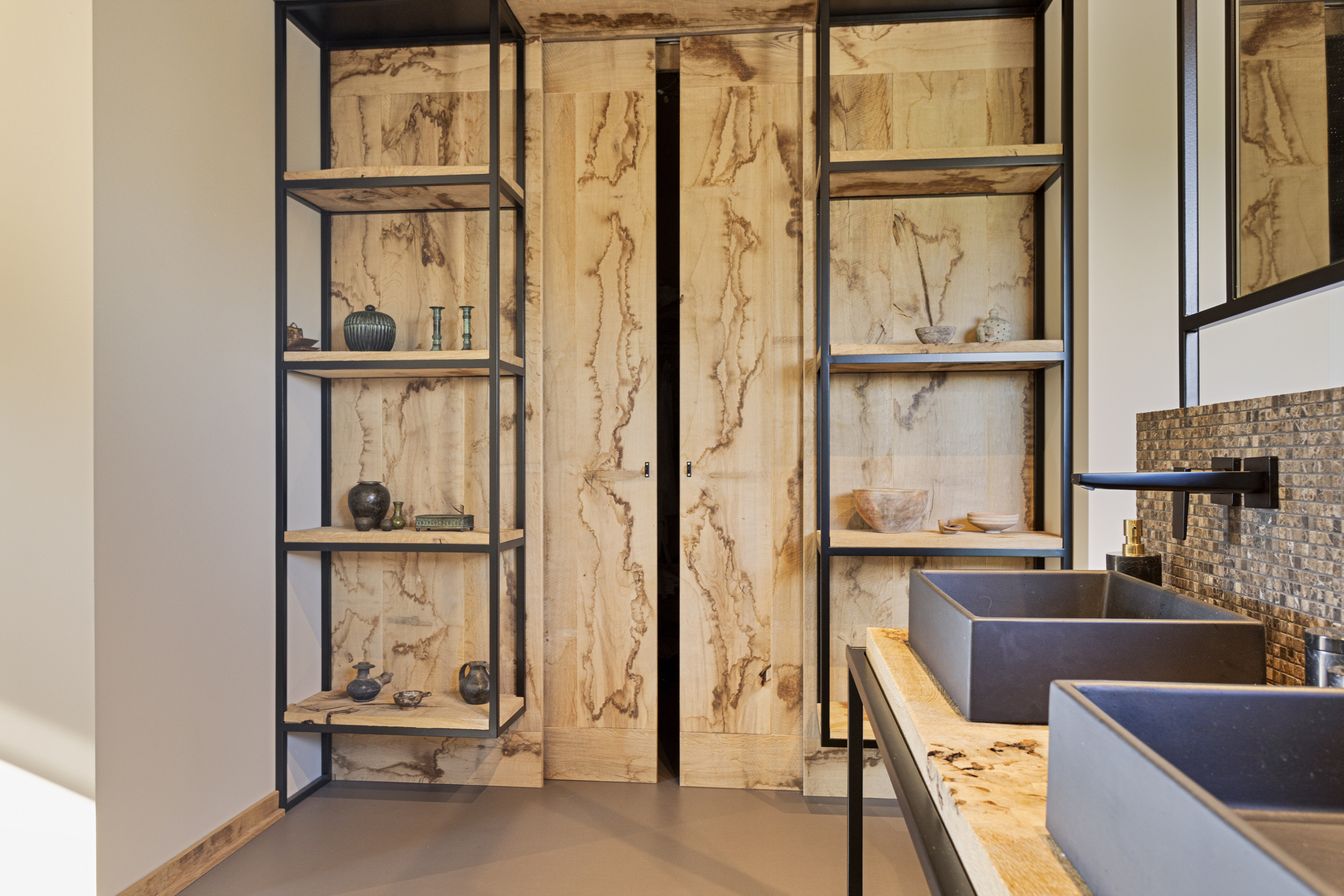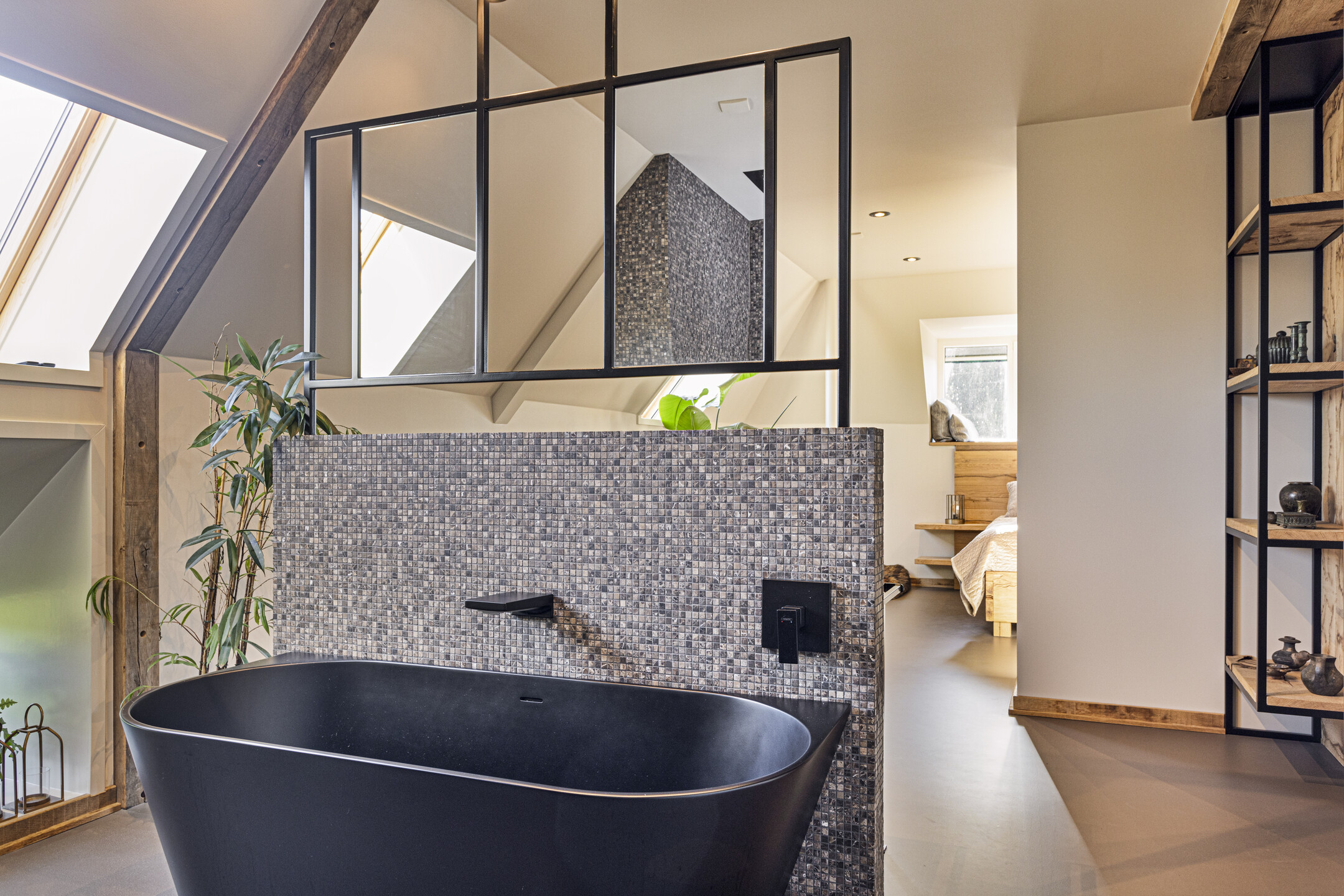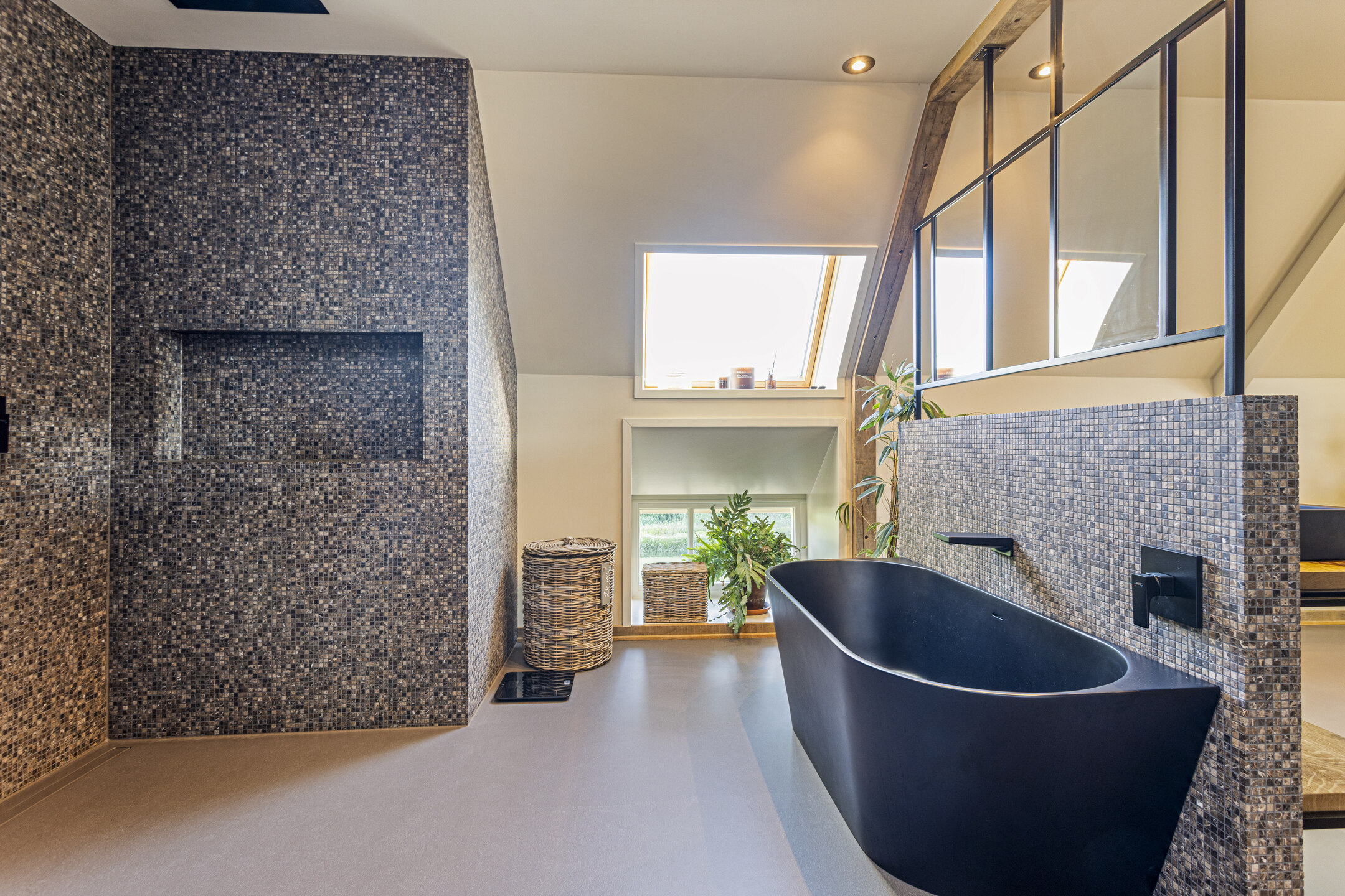 The part, where the cows used to ruminate, has been transformed into a super cool space; the rafters and the thick reed package (there is still insulation material in between) have been left in sight and the space is nice and light through the skylights. The concrete floor - ready for the installation of floor heating -, the beautiful loam stove and the staircase (forge Oldenhave from Vorden) give it a raw, industrial edge. Downstairs, two separate toilets have been installed. Upstairs, the billiard room will be realized.