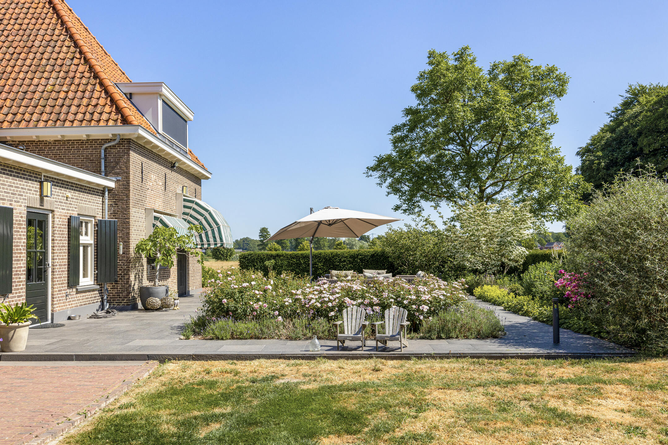 In front of the kitchen is the lovely sun terrace, with rose bed and yew hedge. Perfect for sunny lunches and dinners, or just lounging all day in the lounge set.