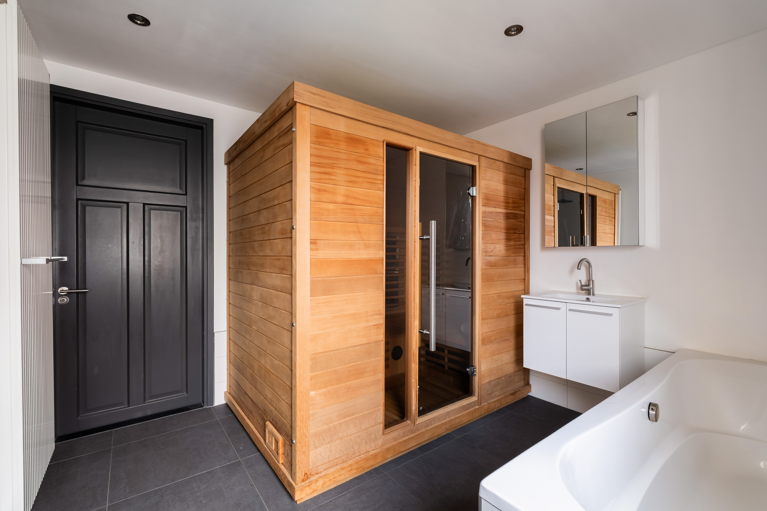The bathroom is designed as a luxurious wellness space, featuring a bathtub, a spacious walk-in shower with rain shower, a large Finnish sauna with infrared function, and a washbasin unit with mirrored cabinet and additional storage. A wonderful place to fully unwind.