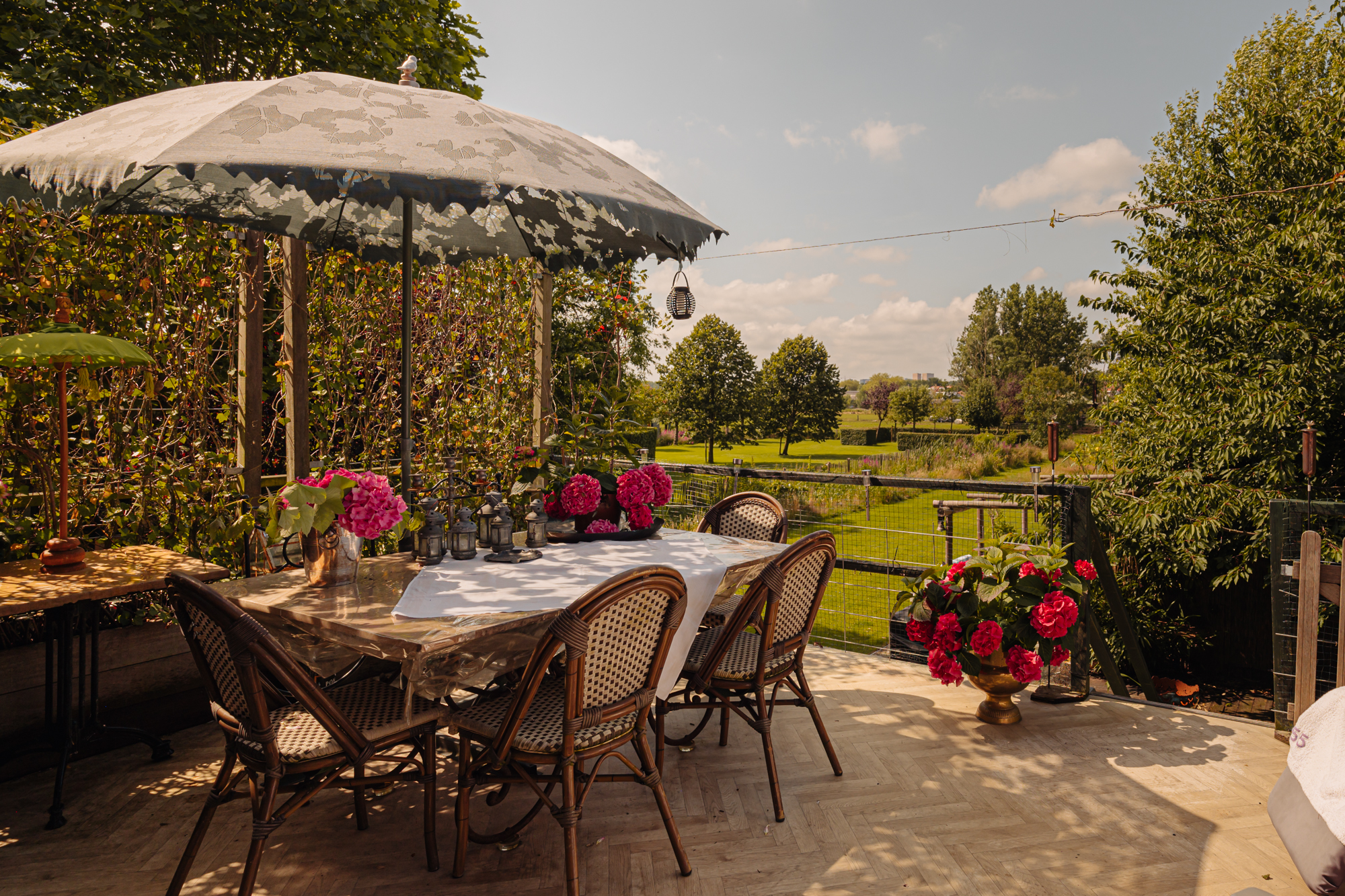 Distinctive features include four open fireplaces, handmade oak doors, and a thatched, insulated roof. The semi detached house Amstelveen invites versatile living, with space for family, flexible work arrangements, or hospitality. Outside, the vast garden and terraces offer rare privacy, with direct access to a private mooring on the Amstel. This is a home where tranquility, architectural detail, and access to both city amenities and nature converge with confidence.