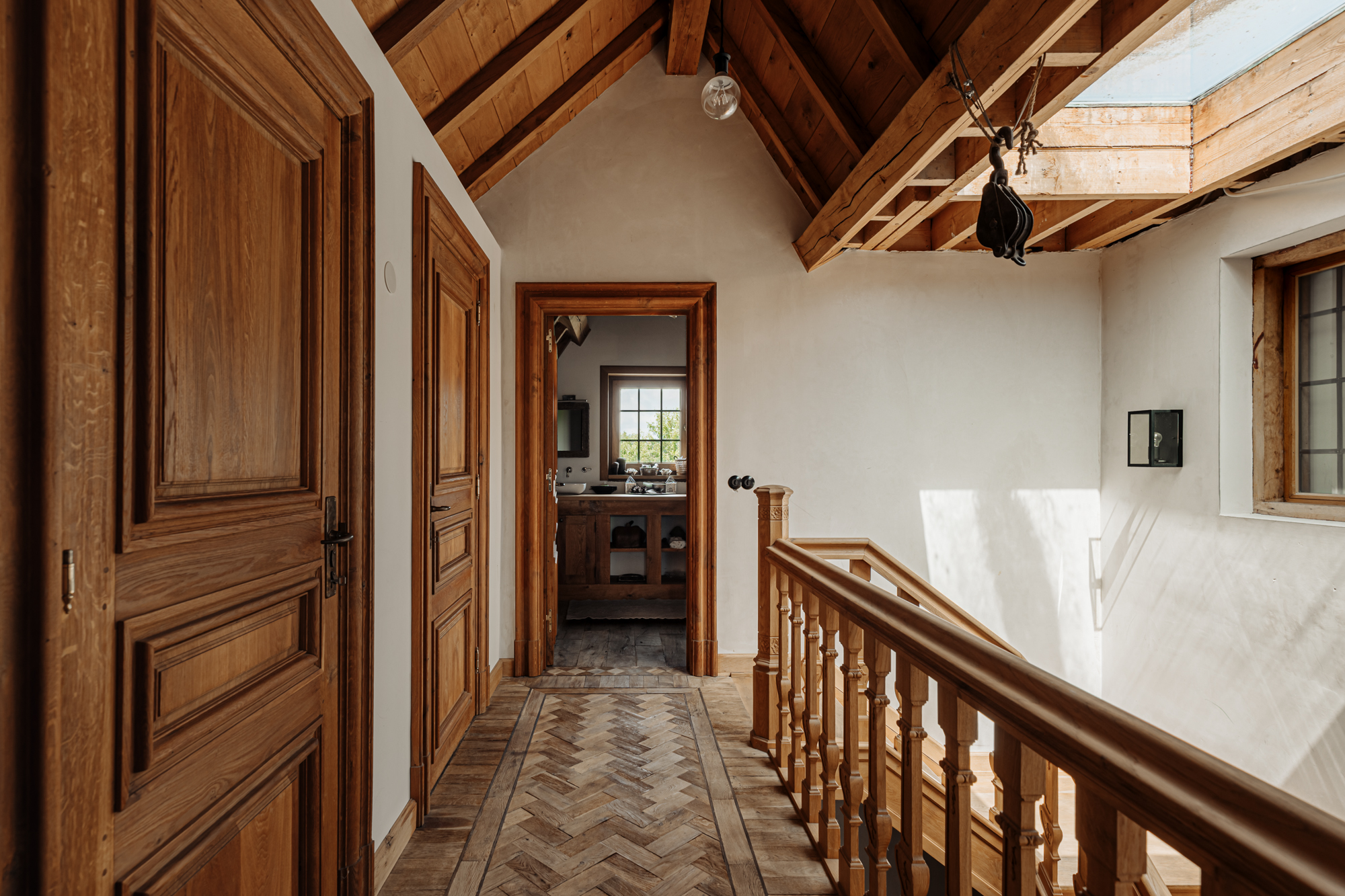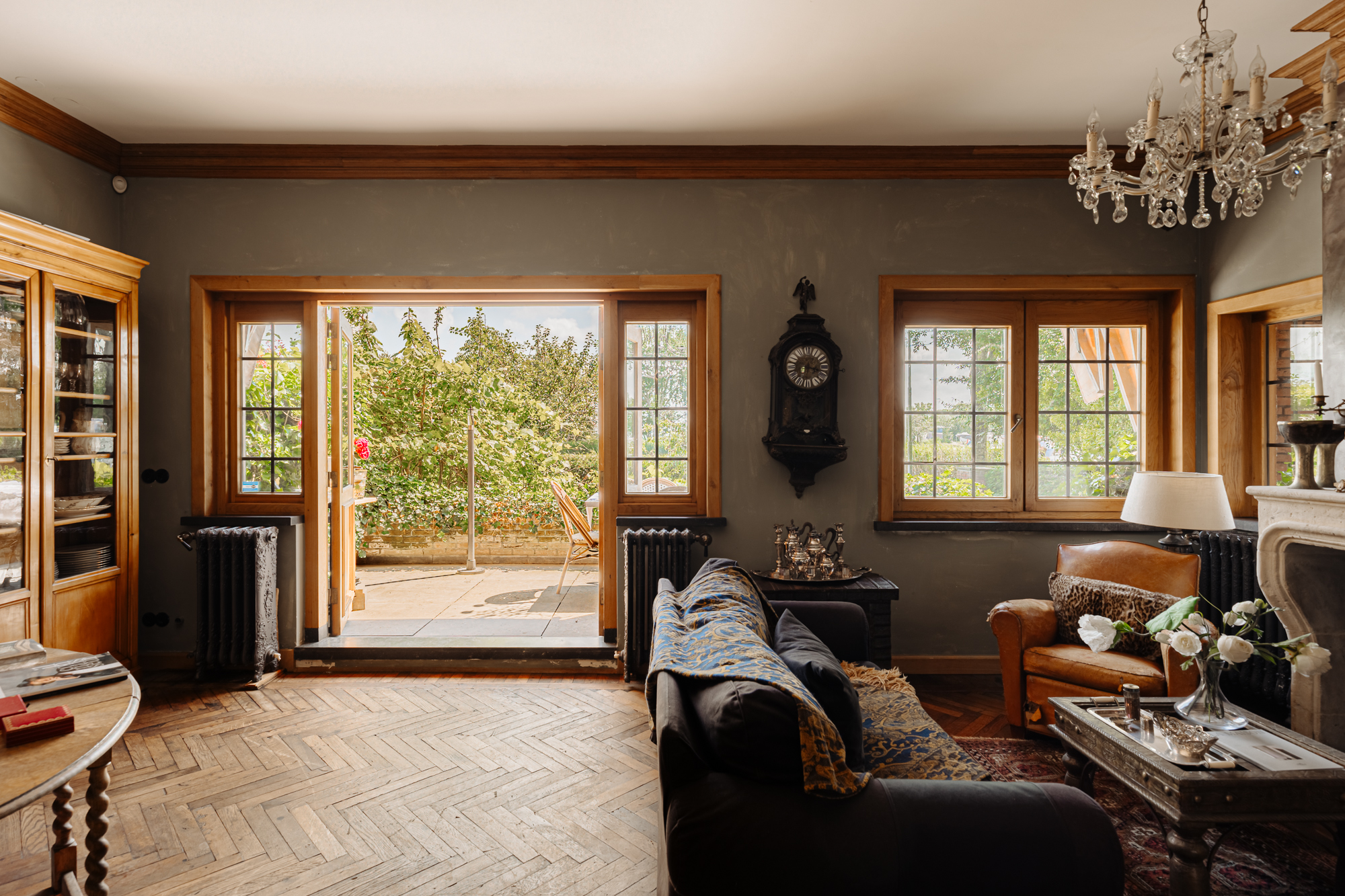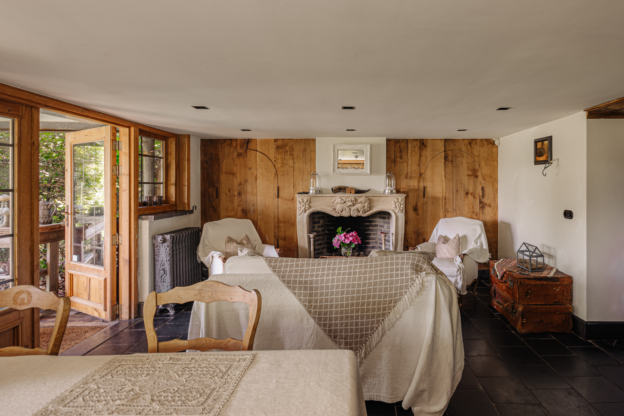 Inside, the house is defined by refined heritage, from stained glass windows originating from the Peace Palace to robust wooden floors reclaimed from historic barracks. Each of the four bedrooms and three bathrooms delivers considered comfort, illuminated by natural light and garden or river views.