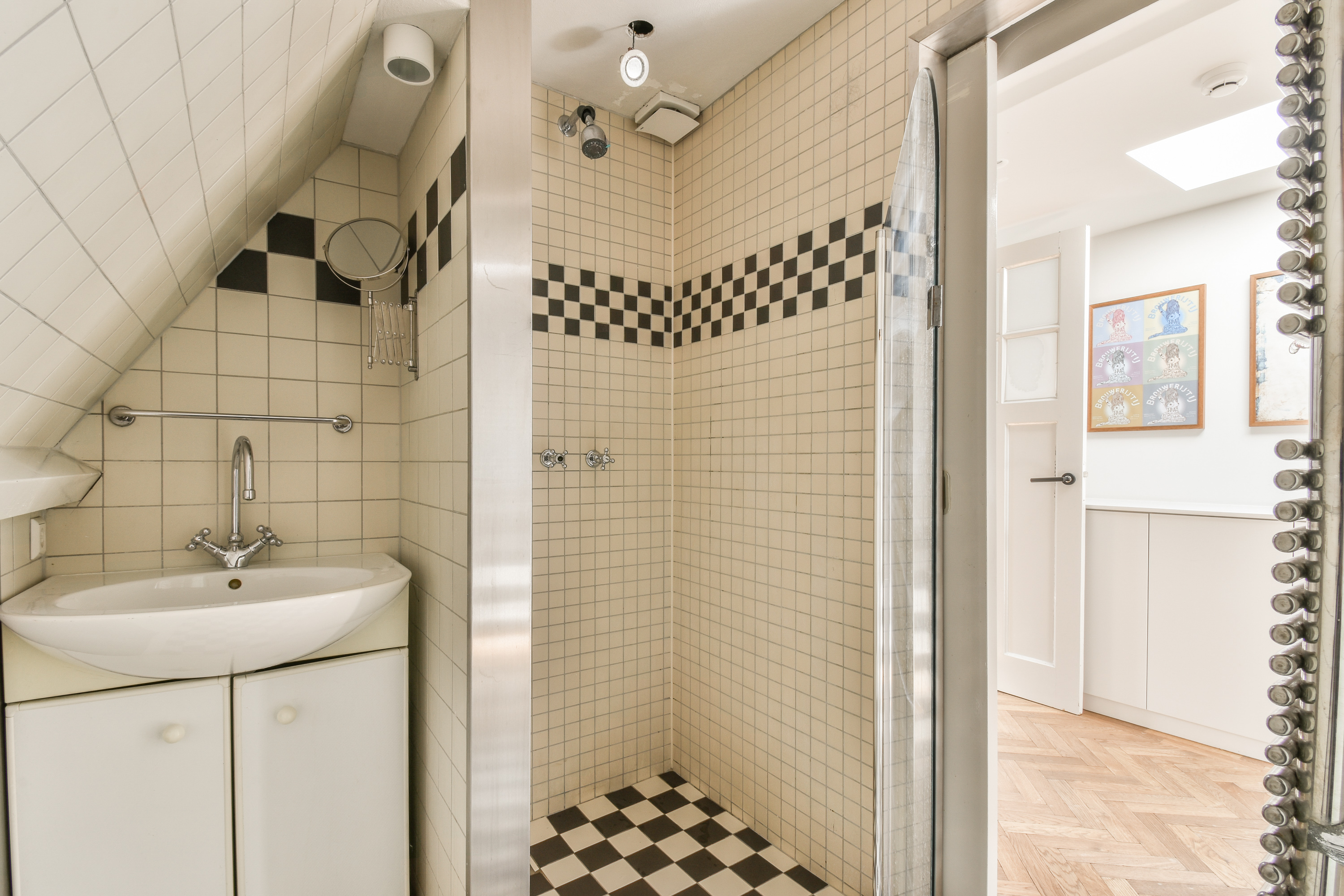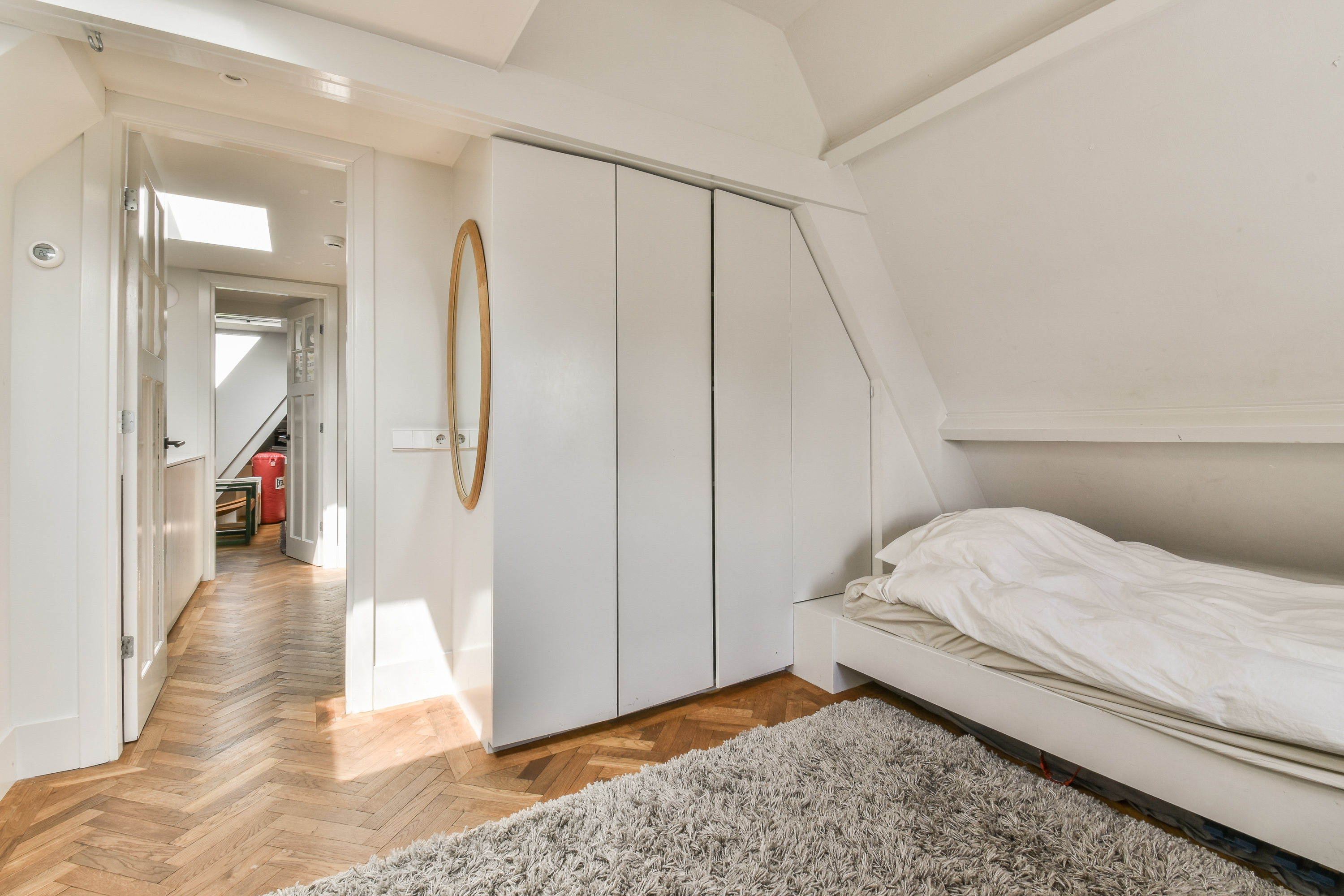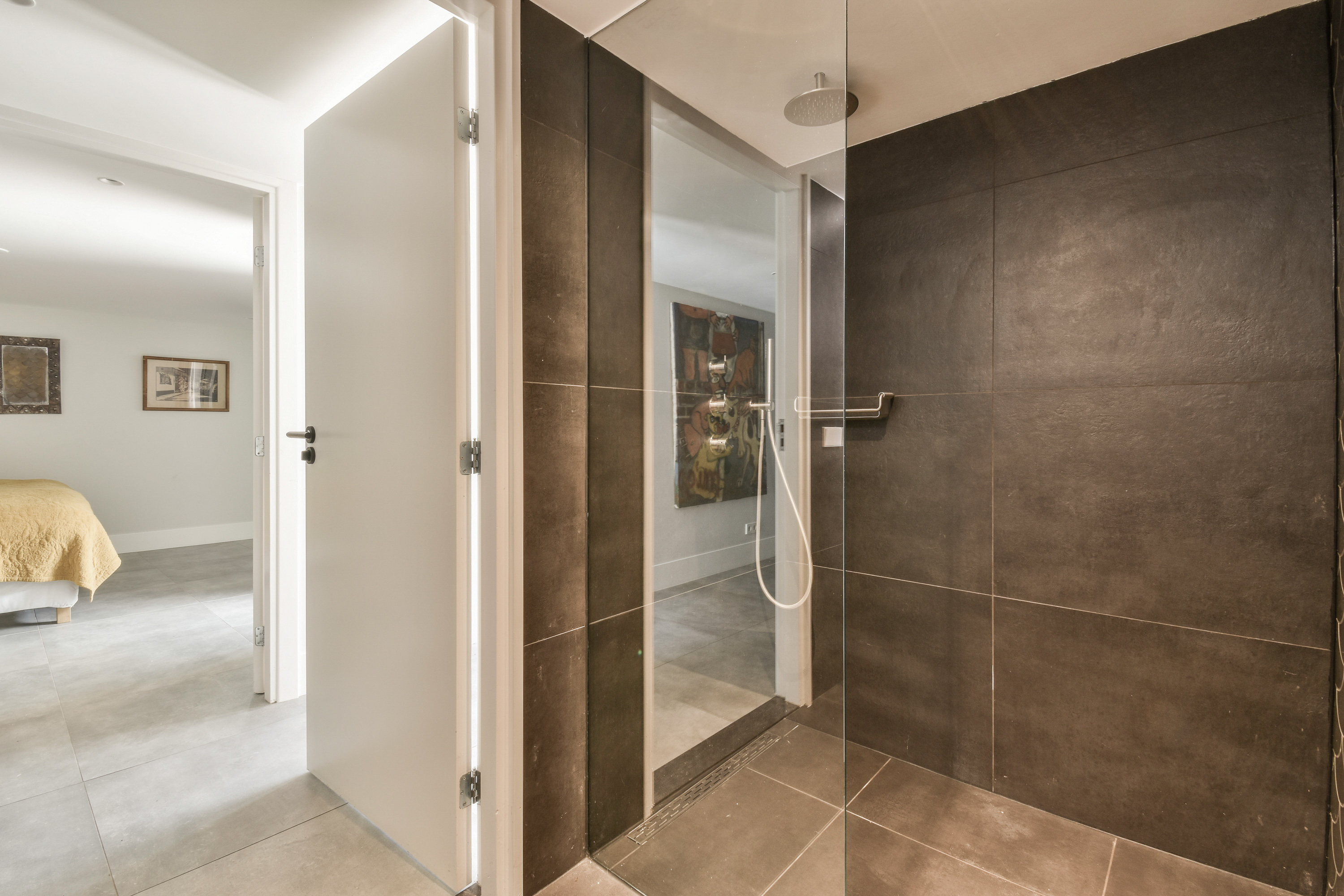 A staircase leads to the first floor, where peace and privacy are key. At the front of the home is the spacious bedroom, offering panoramic views of the Amstel. This room includes a large walk-in closet and a luxurious en-suite bathroom with a freestanding bathtub, double vanity, walk-in shower and toilet. At the rear is a second large bedroom, also with an en-suit bathroom. This bathroom is equipped with a double sink, walk-in shower and toilet. A bright landing connects the rooms and enhances the overall sense of space and refinement.