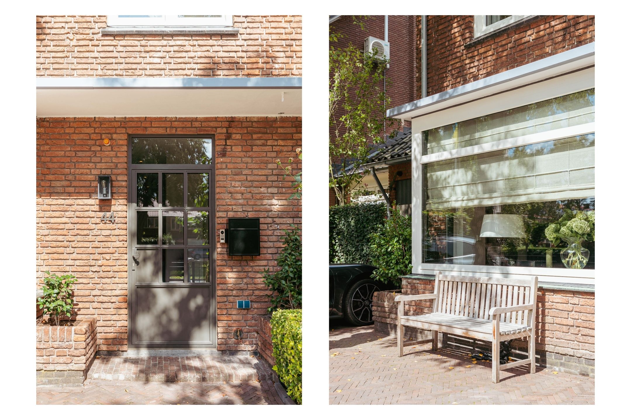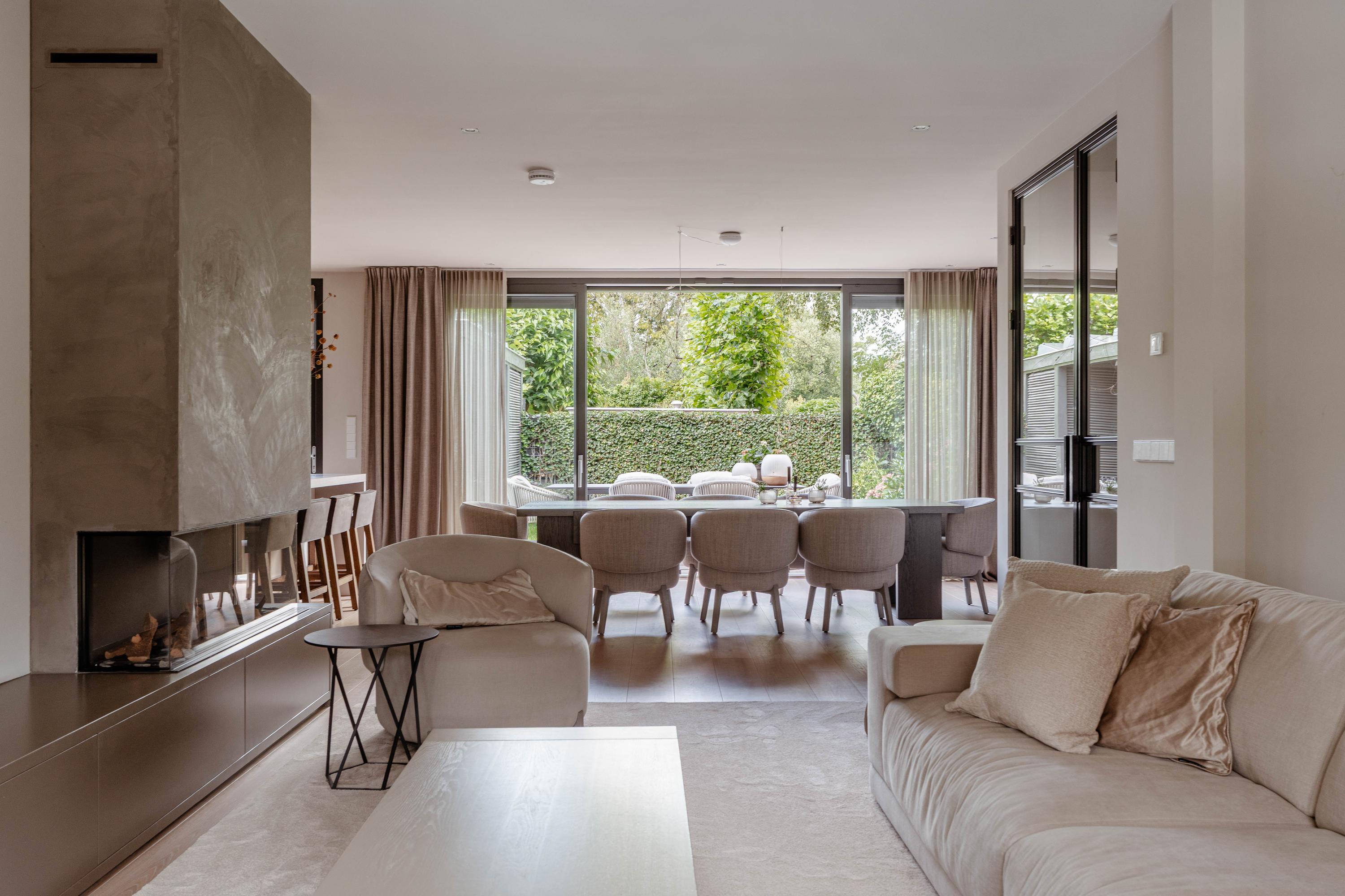 The front garden radiates elegance, with a private driveway secured by an anthracite-grey electric sliding gate. Upon entry, it becomes immediately clear that every detail has been carefully considered. The steel front door—an anthracite-grey classic, adapted to modern insulation standards—sets the tone for what lies inside. The hallway features a custom-built wardrobe with light wood veneer doors, a designer toilet with Piet Boon COCOON faucet, and an oak staircase with steel railings. From here, tall pivot doors lead you into the living room.