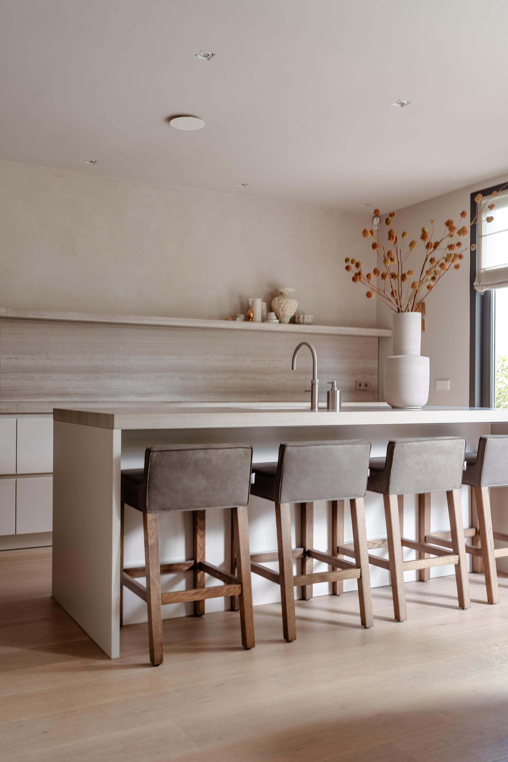 Adjacent to the living room is the dining area, with sliding doors opening directly onto the terrace. A custom Piet Boon wooden cabinet, including a Liebherr wine climate cabinet, makes this the perfect setting for extended dinners and intimate gatherings. The adjoining kitchen is a masterpiece of both design and functionality, anchored by a striking marble island. Outfitted with premium Miele appliances—including an oven, combi-oven/microwave, fridge-freezer, and a Quooker Cube (providing instant boiling, chilled, and sparkling water)—the kitchen is as practical as it is refined. The wall unit, with six wide soft-close drawers in light wood veneer, offers abundant storage while enhancing the serene design.