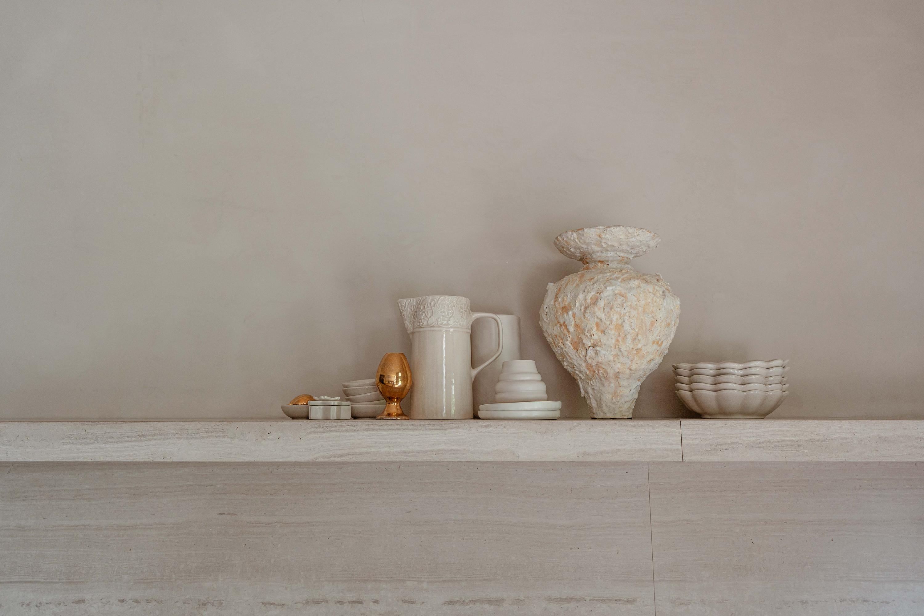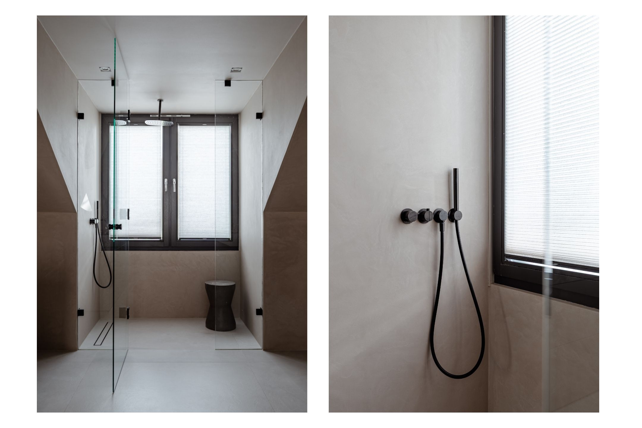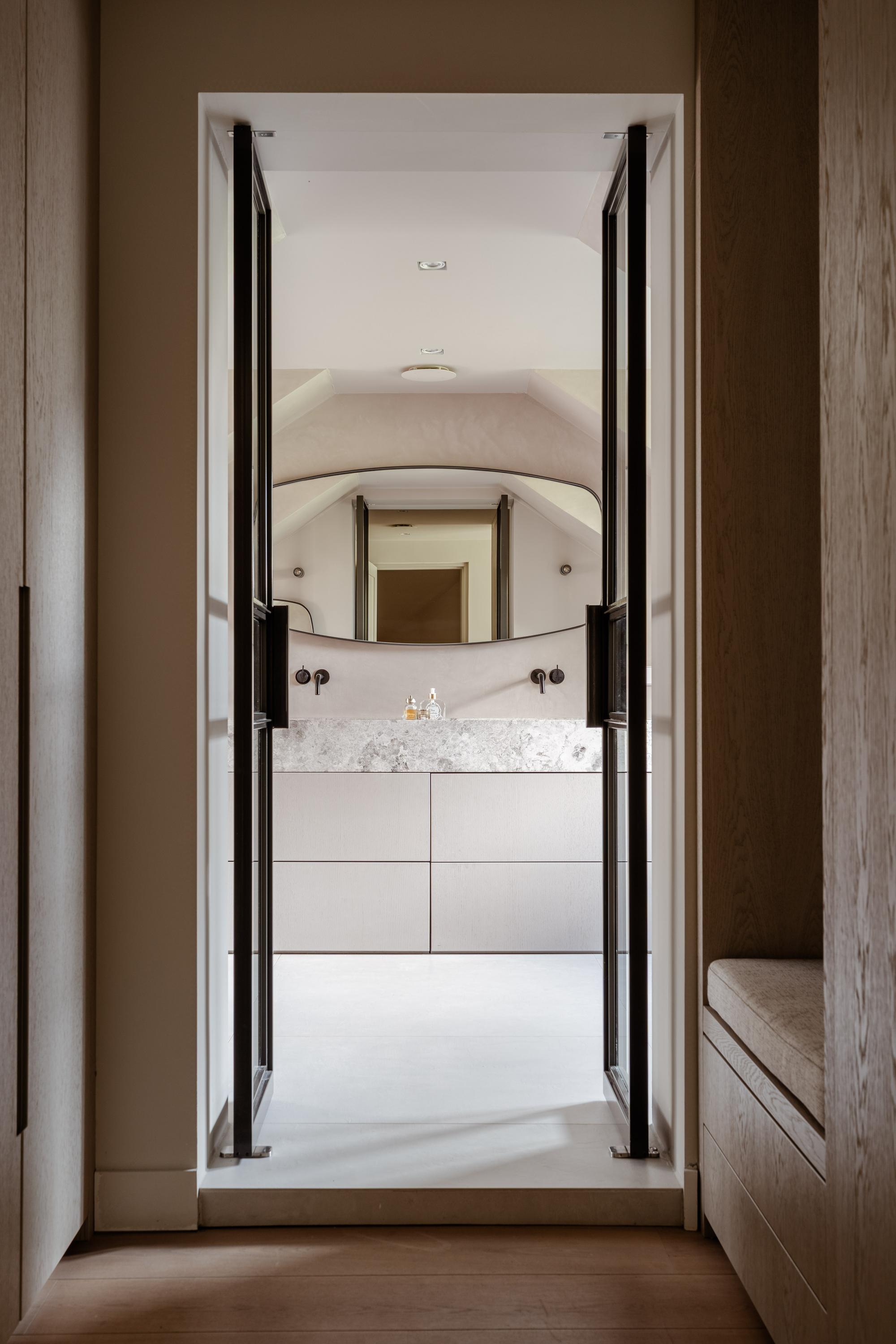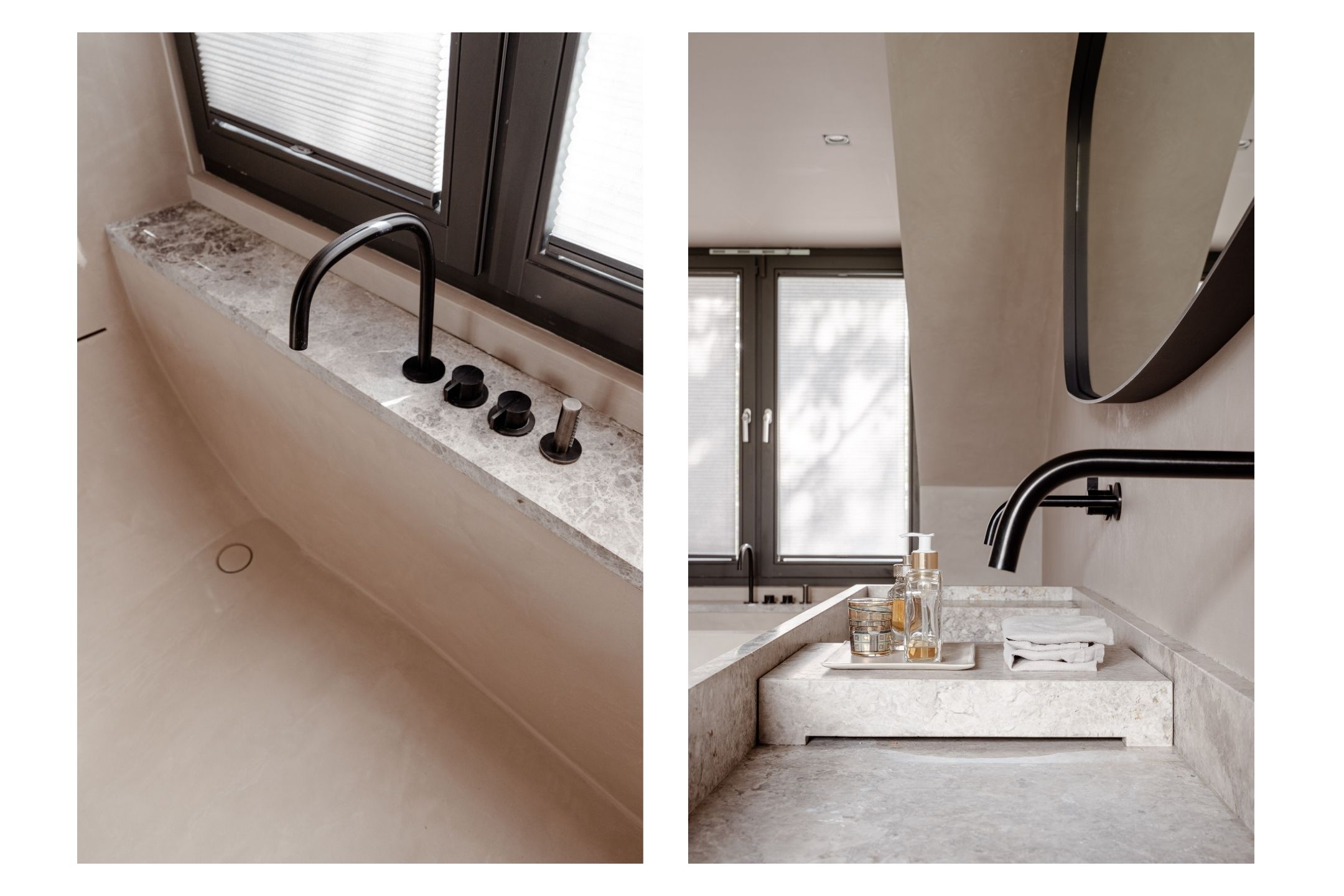The master bathroom, designed by Piet Boon, is finished in exclusive materials: a double sink in Portuguese marble with COCOON built-in faucets, a béton ciré bathtub, and a large walk-in rain shower with glass door all combine to create a spa-like experience at home.