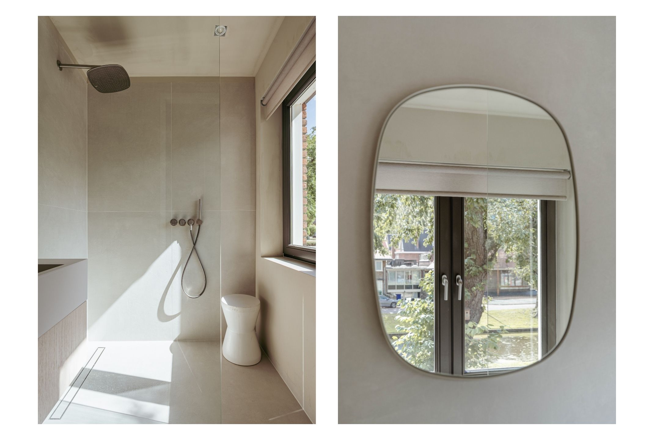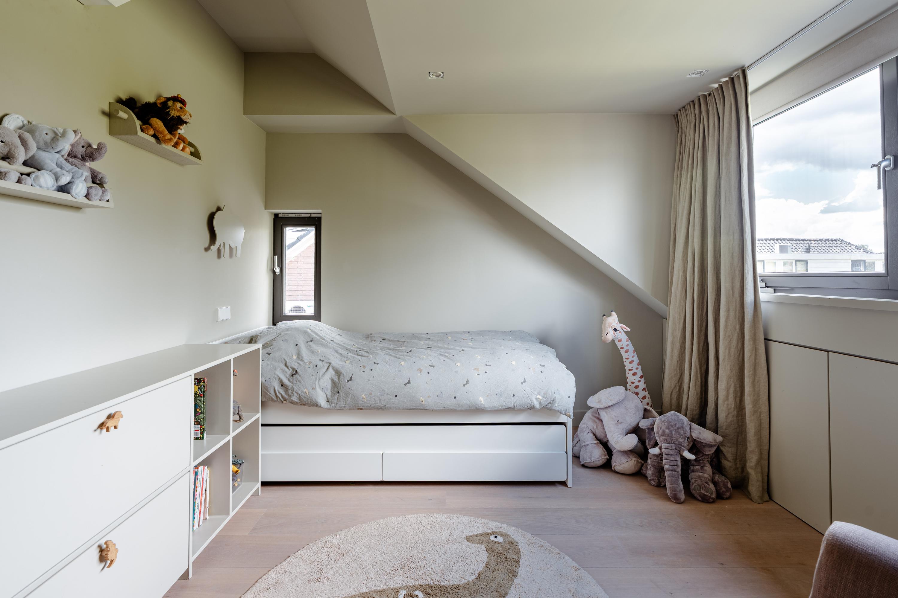 The top floor offers two further bedrooms, both with bespoke cabinetry. One of the rooms includes a specially designed built-in closet with a child-friendly layout. A third bathroom—again in Piet Boon design—features 120x120 cm tiles, built-in faucets, and a sleek vanity.