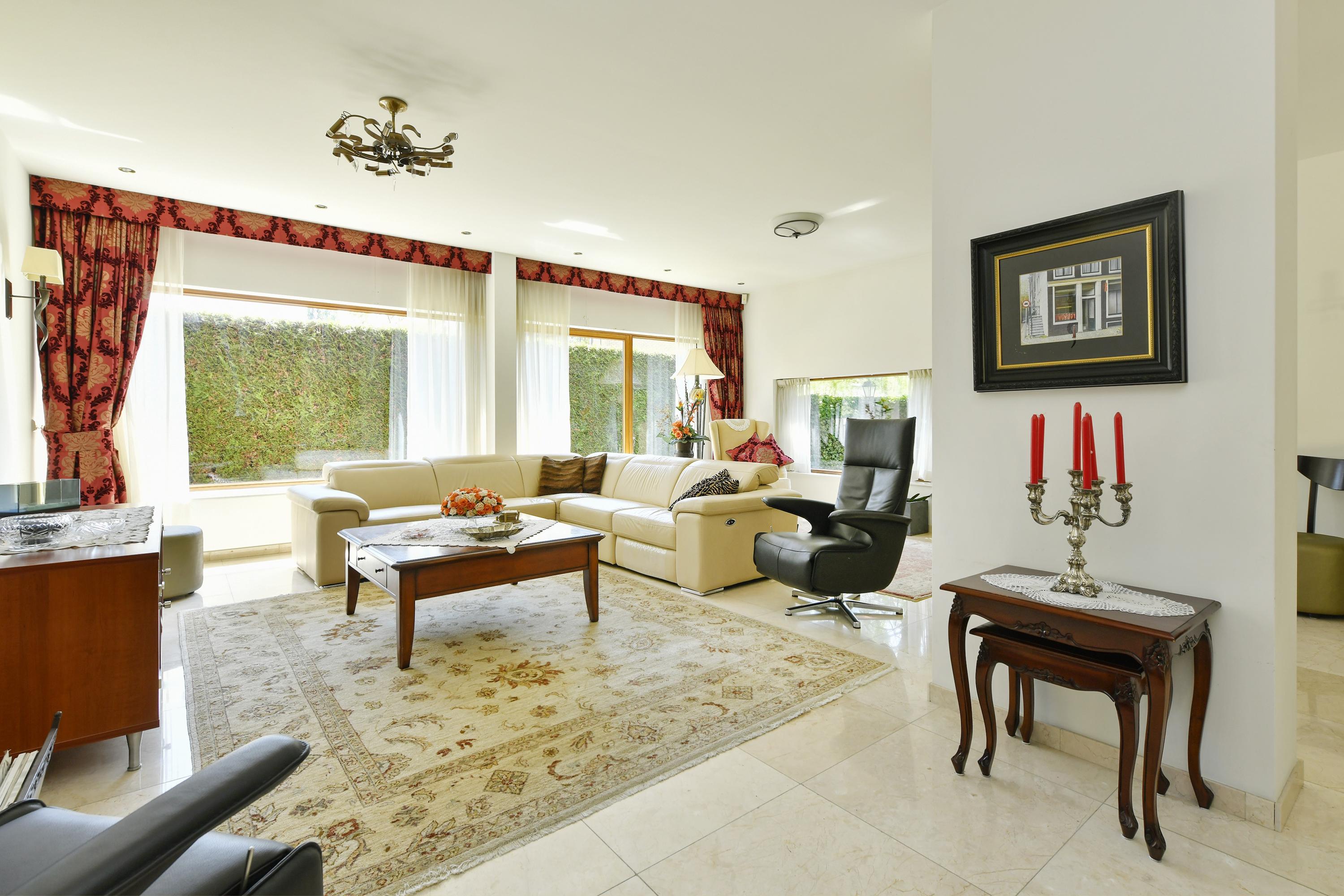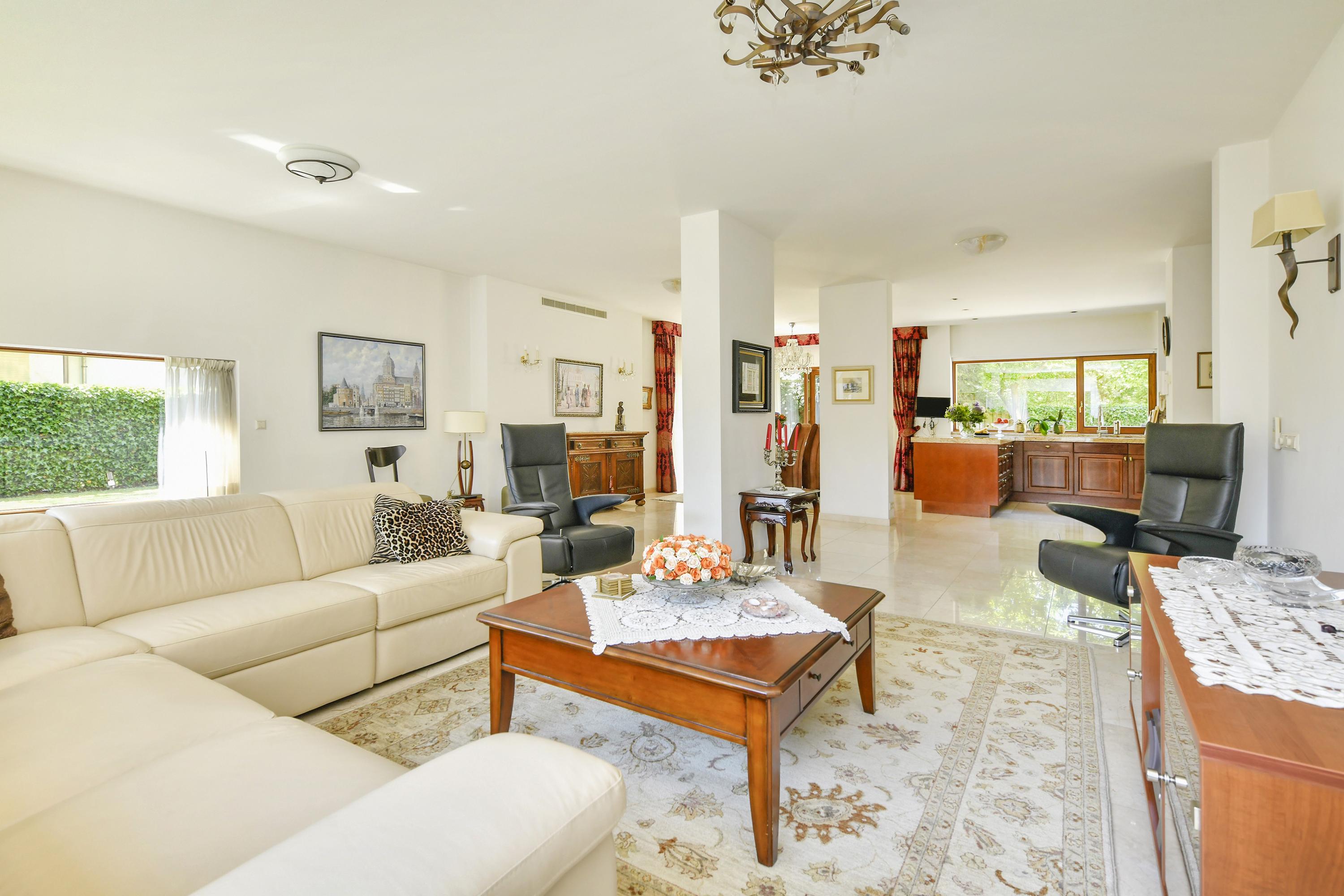 Through the broad front door you enter the spacious hallway with cloakroom and toilet. From here you walk through an open connection into the living room with open-plan kitchen. The bright living room extends across the full width of the house and features large windows and French doors opening onto the garden. Its southwest orientation allows you to enjoy natural light throughout the day as well as beautiful views of the garden.