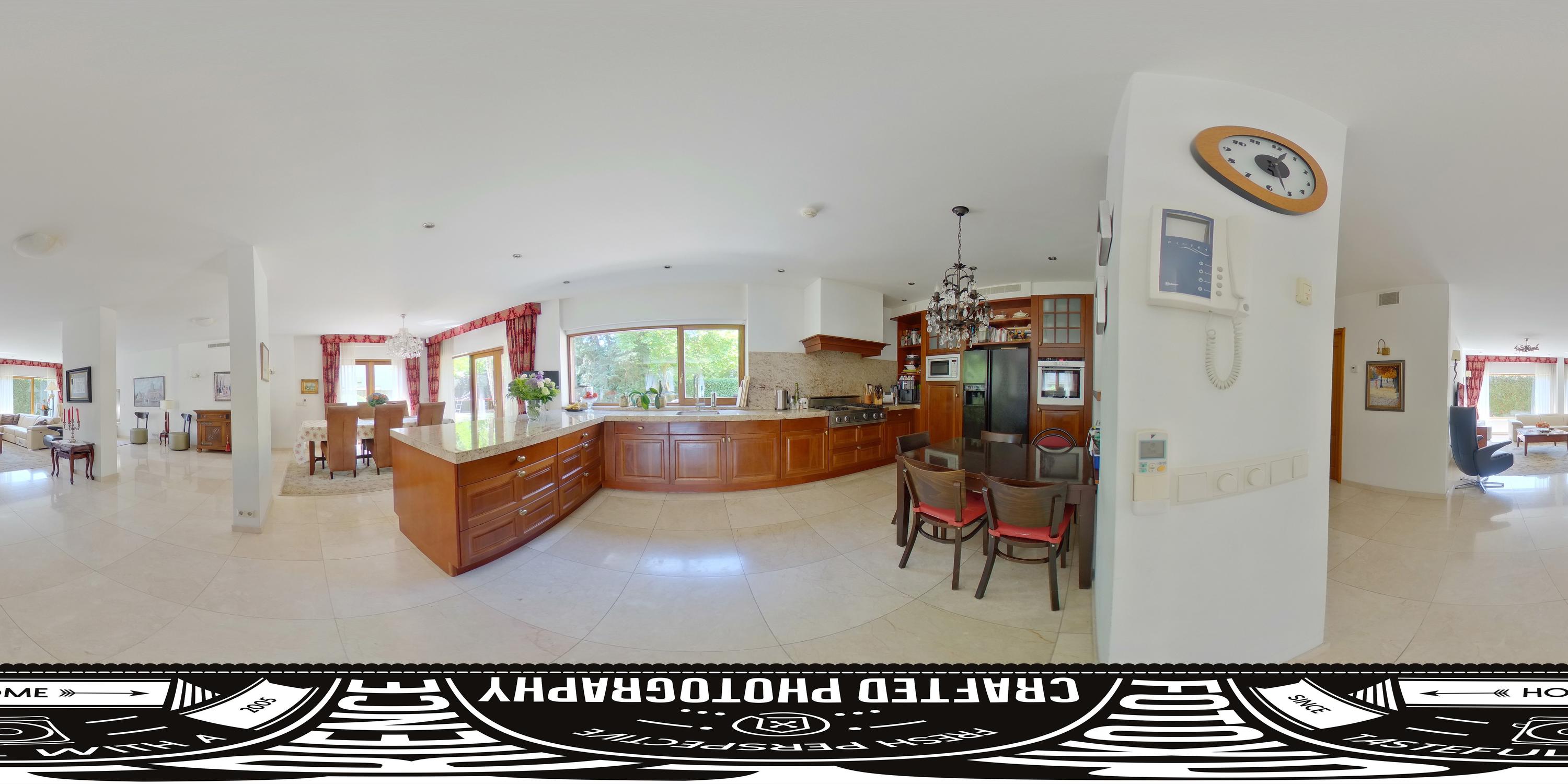 The open kitchen is equipped with built-in appliances. Its spacious and open design creates an inviting living area where cooking, dining and spending time together blend seamlessly.