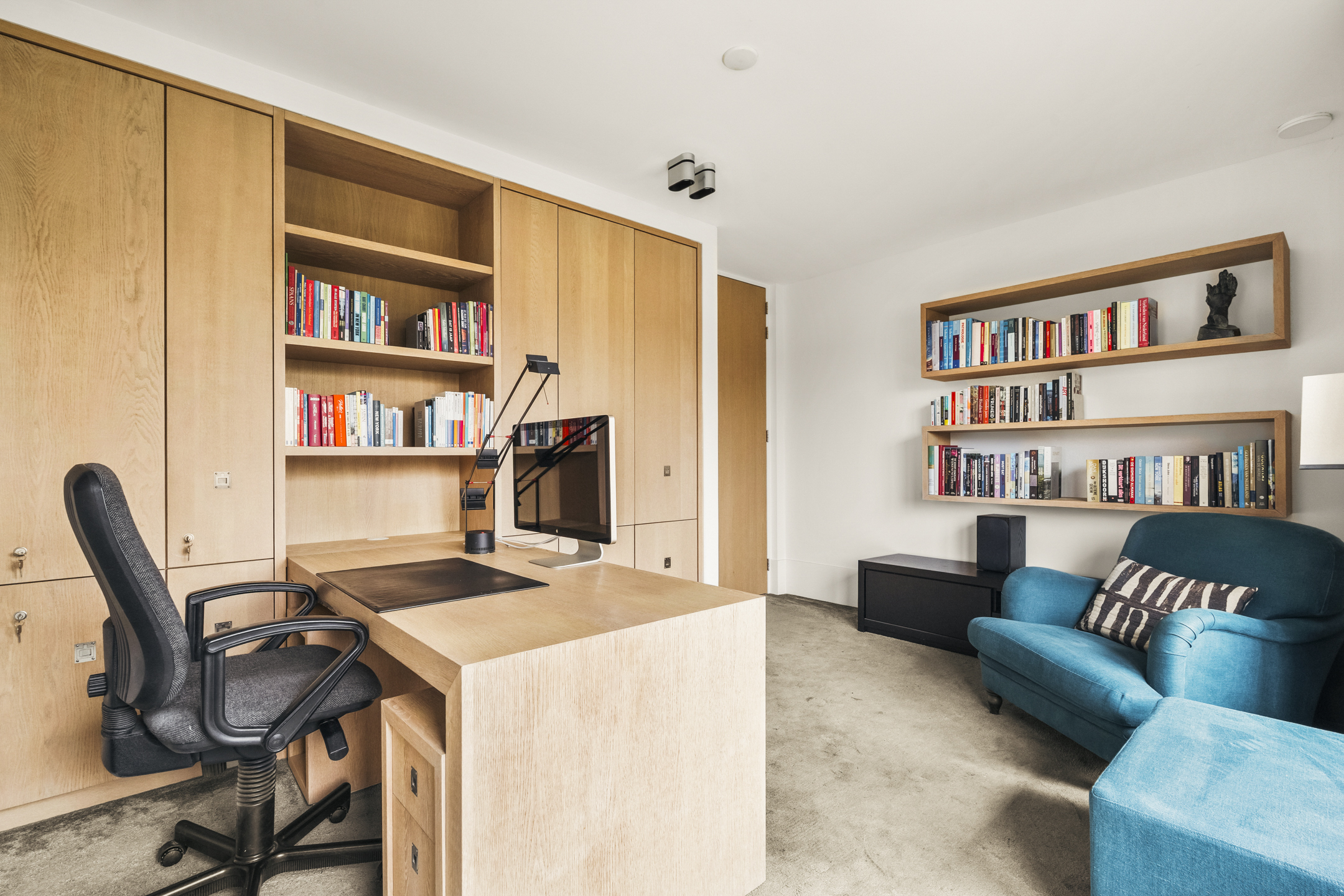 Also at the rear is a bedroom currently used as a study. This room features bespoke cabinetry and provides access to the west-facing balcony overlooking the garden.