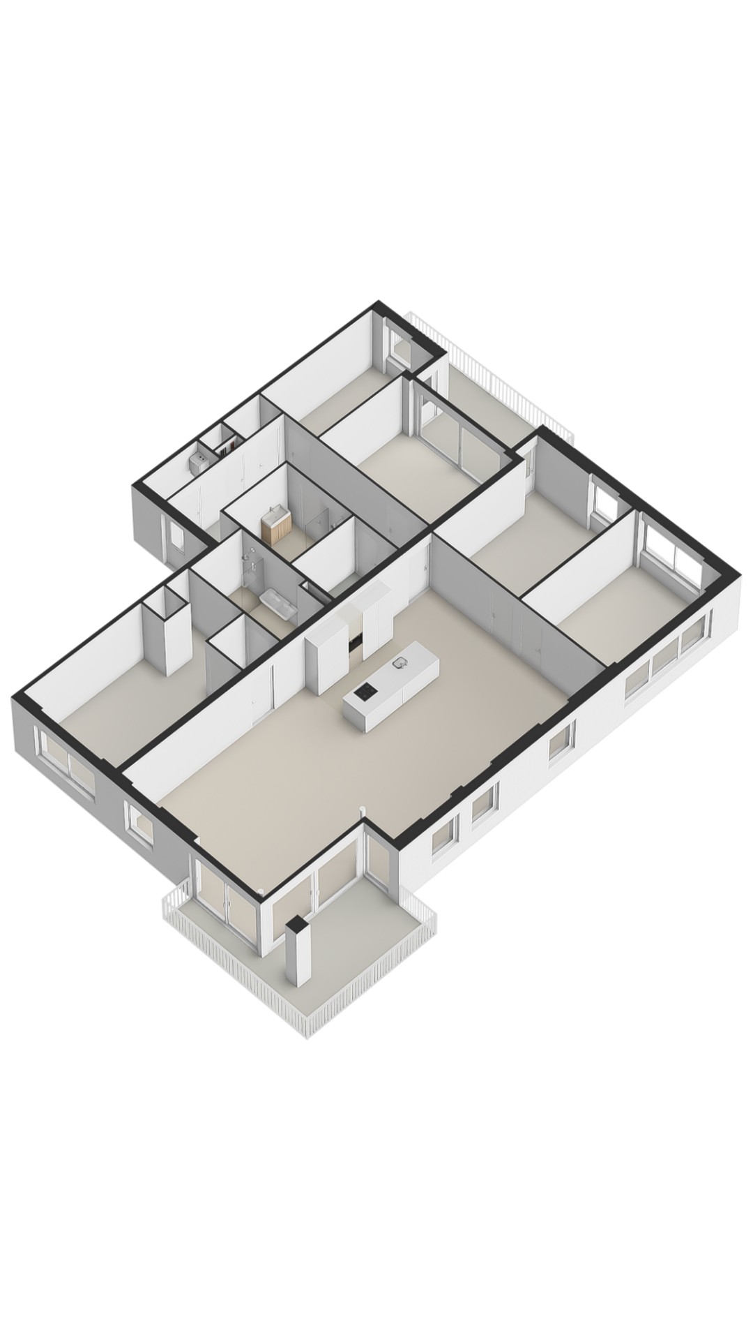 The impressive living room of about 120 m² includes a modern Siematic kitchen. Large sliding doors connect the living area to the terraces, creating a beautiful indoor-outdoor atmosphere. Furthermore, the apartment offers five spacious bedrooms, two luxurious bathrooms, and, thanks to its corner position, enjoys exceptional natural light.