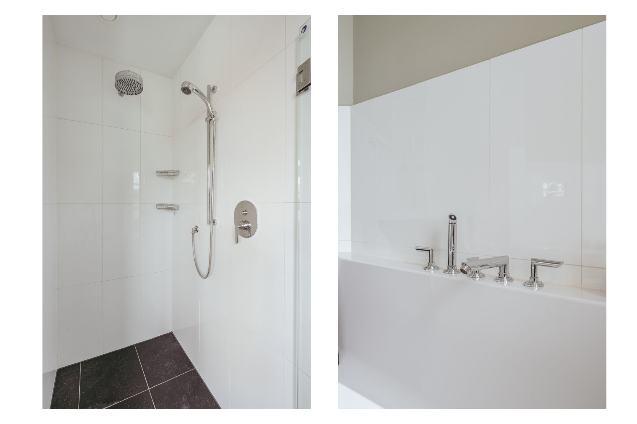 The master bedroom of approx. 25 m² offers access through French doors to the balcony and adjoins a generous bathroom, fitted with a bathtub, walk-in rain shower, toilet, bidet and double washbasin.