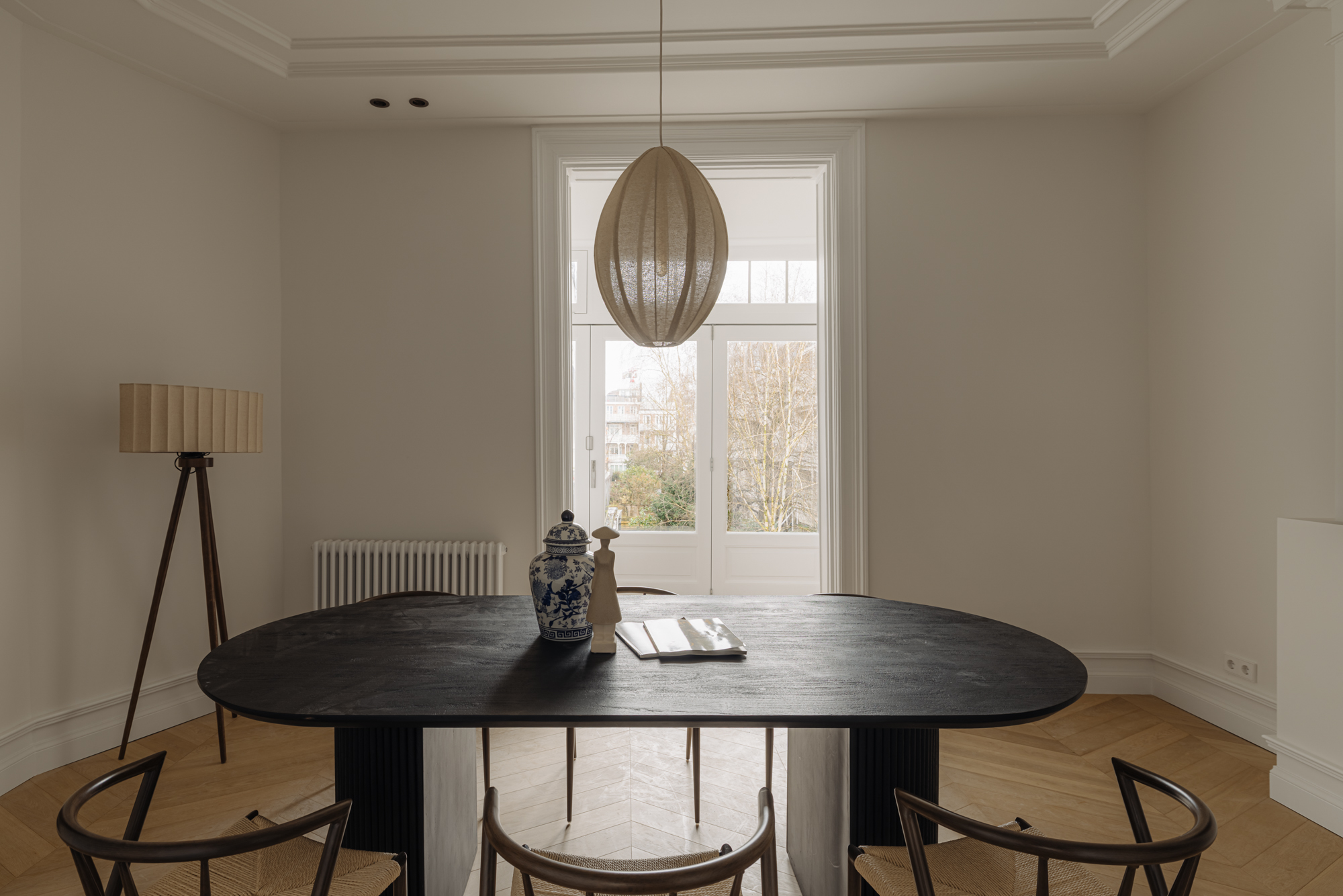 The monumental staircase leads to the landing of the first floor. At the rear is the classic dining room with access to a second internal balcony. This balcony features a folding glass façade, seamlessly connecting indoor and outdoor living. Thanks to its favourable position, you can enjoy the sun here well into the evening. At the front is the spacious kitchen-diner with cooking island—without doubt the centrepiece of the home. The kitchen is finished in beautiful dark oak and complemented by an elegant composite worktop. It is equipped with high-end Siemens StudioLine appliances, a Bora cooktop, and a Quooker tap. The island also features a welcoming bar area. With a width of nearly 7 metres and three large windows, the kitchen enjoys wonderful open views towards Jan Luijkenstraat. From both the kitchen and the landing, the fourth (bed)room can be accessed, which is ideal as a home office or study.