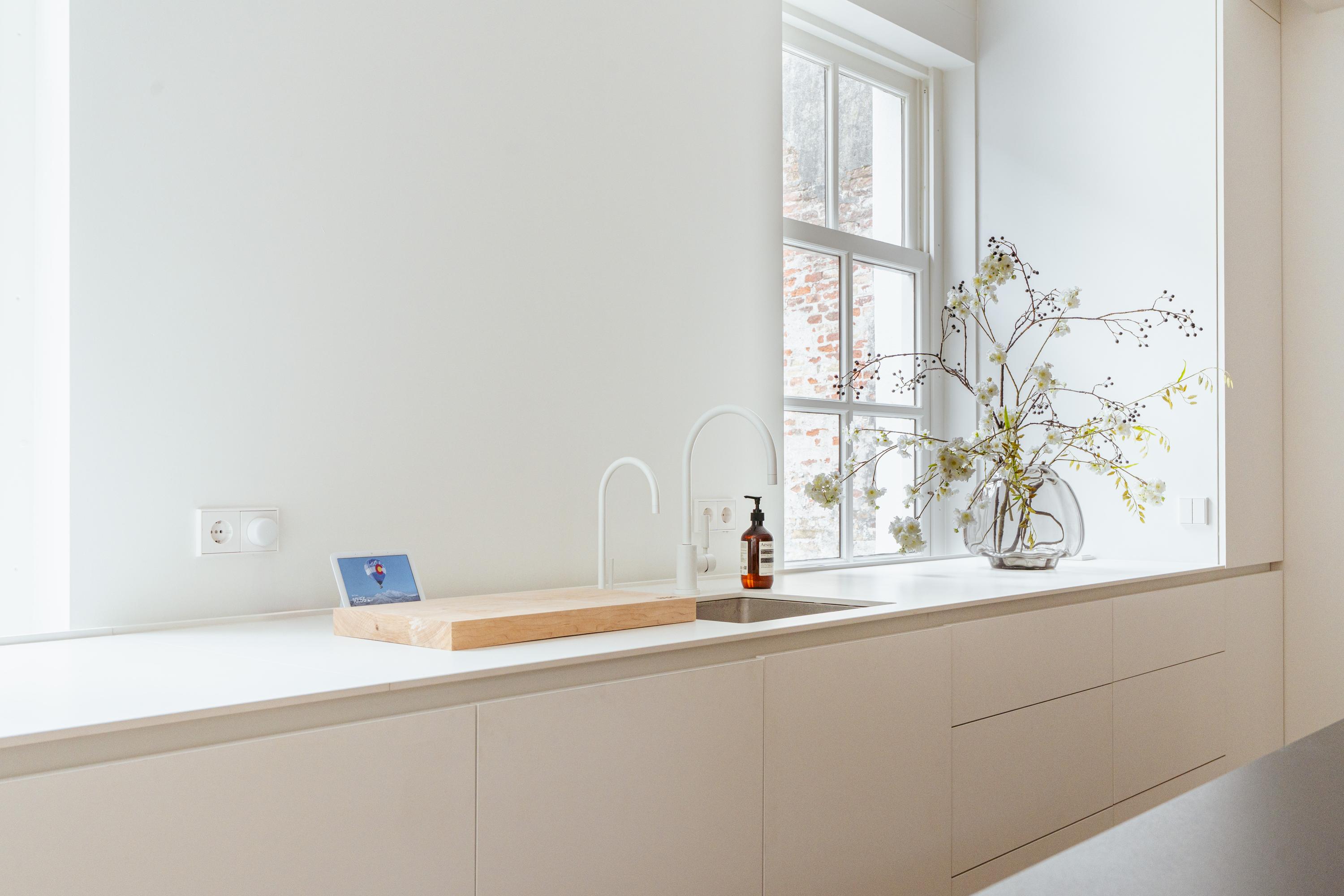 The entrance provides access to both the residence and the multifunctional commercial space on the ground floor. This space is finished with great attention to detail, exuding character through wooden elements, exposed ceiling beams, and high-quality materials. Large double doors at the front can be fully opened, creating an inviting look and allowing for ample natural light. Inside, the space is practical yet stylishly arranged. A compact but luxuriously finished kitchenette, a neat toilet, and a separate laundry and technical room complete this floor. A large skylight at the rear brings in abundant daylight, adding to the open and airy feel. Rear access to a private outdoor space is available, as well as a second entrance directly from the street — providing flexibility for use as a studio, home office, or practice space.