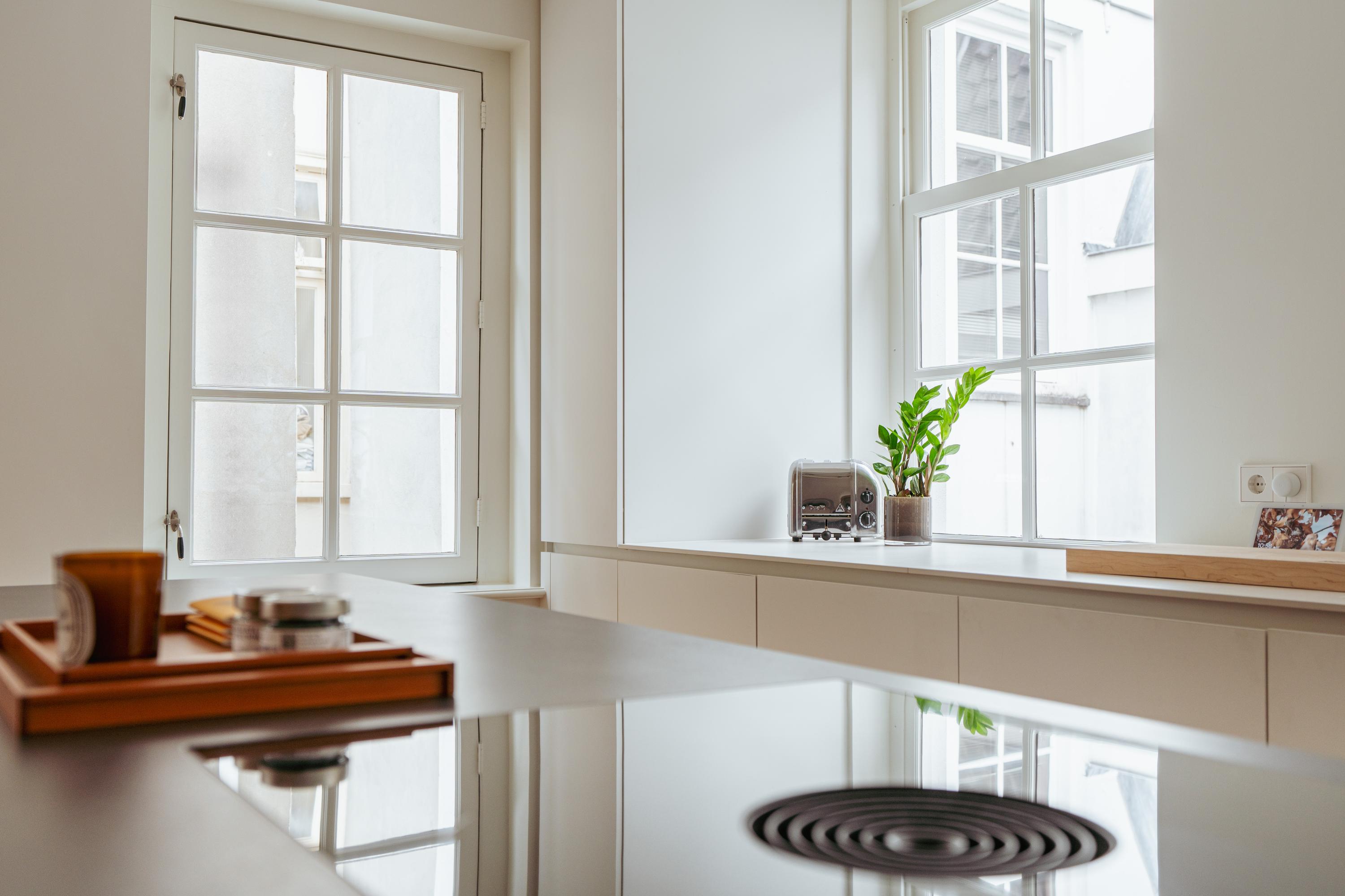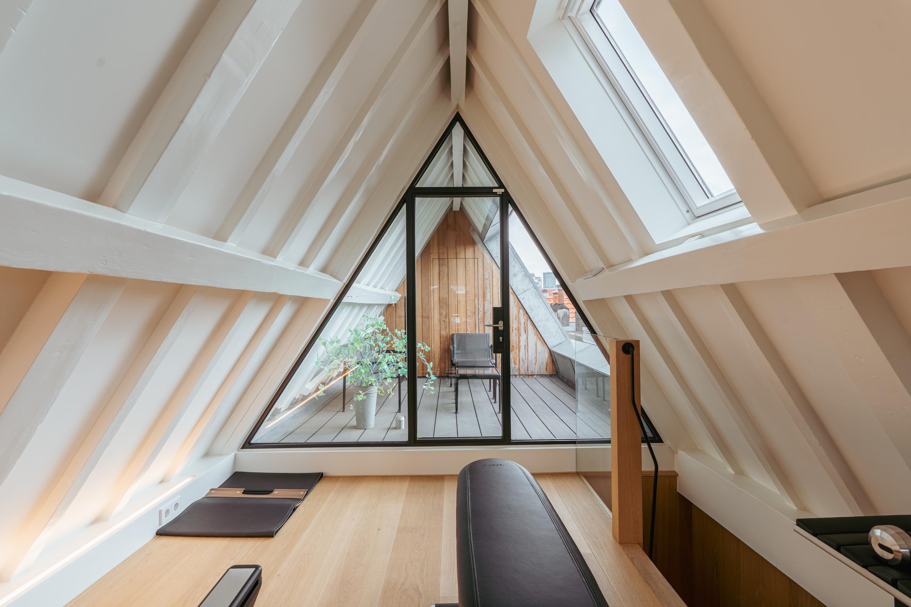 Located in the roof, this top floor is currently used as a gym. Thanks to the open mezzanine, there’s a visual connection with the master bedroom below, contributing to a feeling of space and cohesion. The sloped rooflines add character, while generous ceiling height and large windows ensure a bright and pleasant ambiance. This is a flexible space, easily converted into an office, creative studio, additional bedroom, or relaxation area. French doors at the rear lead to a quiet and private balcony, a peaceful spot to unwind and enjoy the sun in the heart of the city.