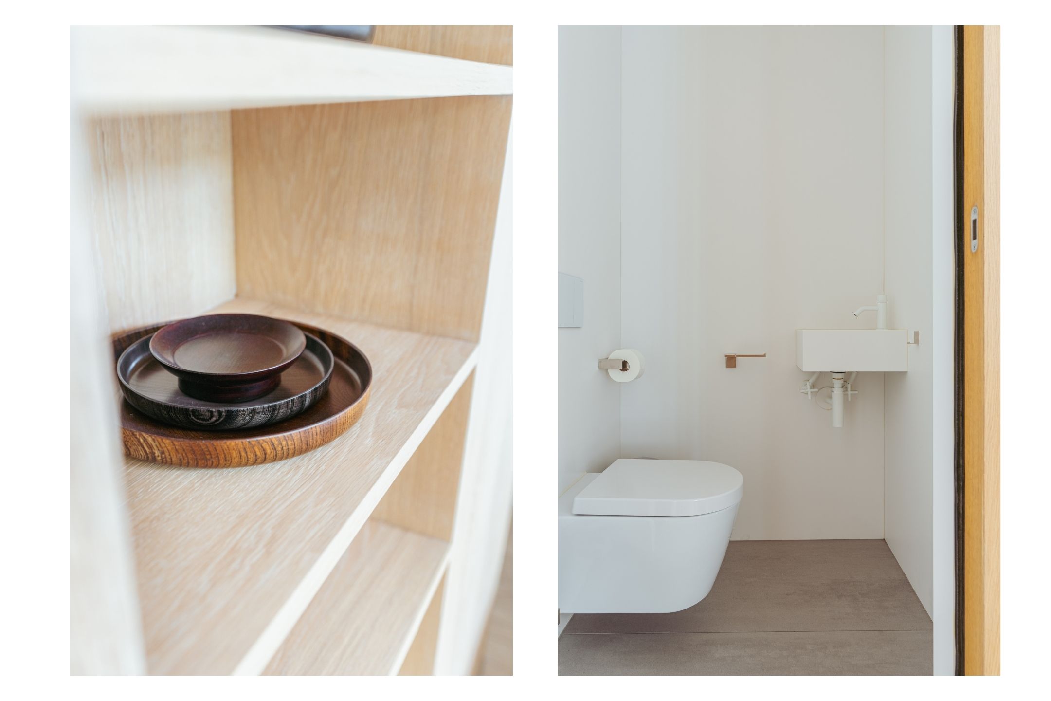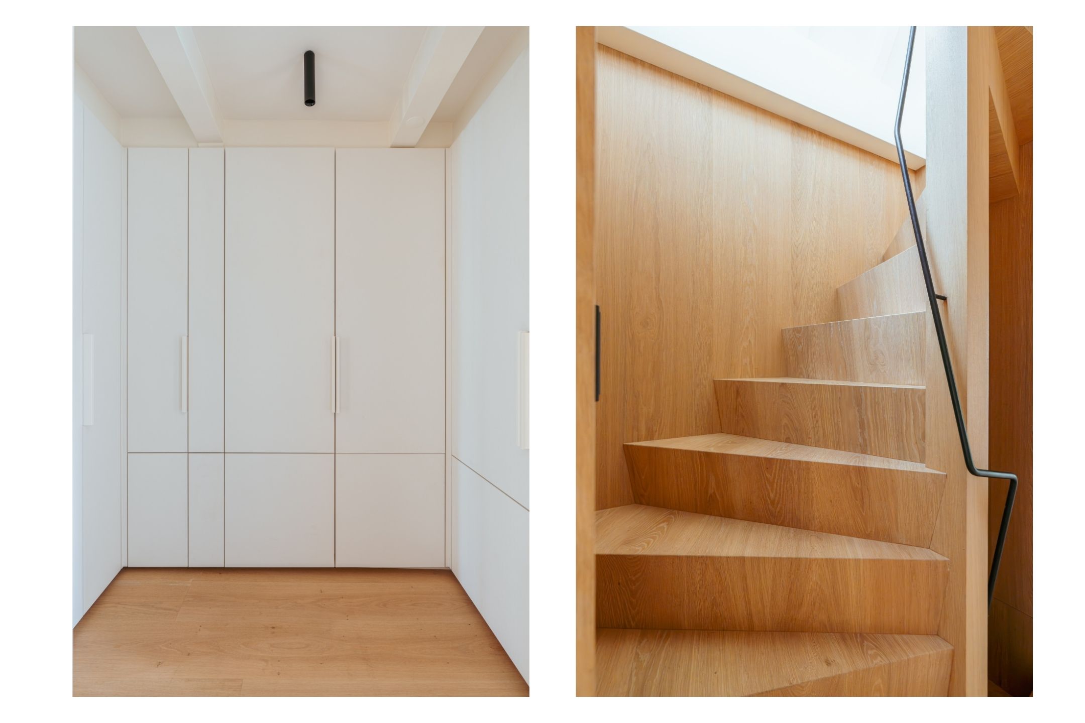 This upper floor is dedicated to a luxurious master suite — a private sanctuary of peace, space, and comfort. A central walk-in closet features custom cabinetry that is both functional and stylish. At the front is the cozy bedroom, where original ceiling beams and impressive ceiling height immediately draw the eye. Tall windows extending into the gable enhance the sense of openness and bring in wonderful natural light. Built-in wardrobes contribute to the clean, elegant look. At the rear lies the spectacular bathroom — a true wellness retreat at home. Here you’ll find a striking freestanding Agape Spoon Woodline bathtub, a double vanity with stylish cabinetry, a spacious walk-in shower, a steam cabin, and a built-in recliner for ultimate relaxation. The space is finished with warm materials and thoughtful design elements, including integrated lighting for a hotel-like atmosphere. Beautiful wooden sliding panels provide both shading and aesthetic appeal, offering privacy without blocking light. The toilet is separate from the bathroom.