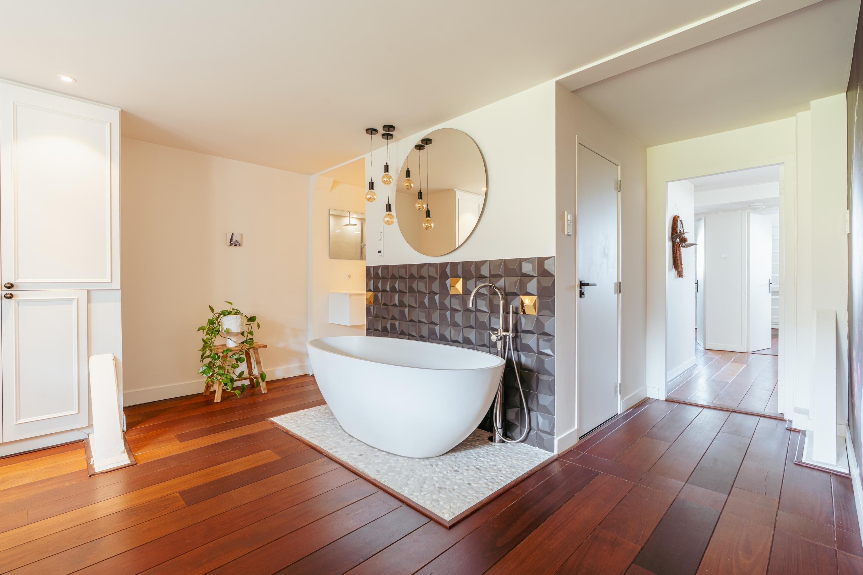 The modern open kitchen, located at the bright rear side of the home, boasts a unique island with a Dekton countertop and a copper backsplash featuring Portuguese 3D tiles. Luxury appliances include an induction cooktop with integrated extractor, (steam) oven with sous-vide and plate-warming functions, large refrigerator and separate freezer, dishwasher, and a Quooker tap with sparkling water function. The expansive dining area spans an impressive 35 m², perfect for unforgettable gatherings with family and friends.