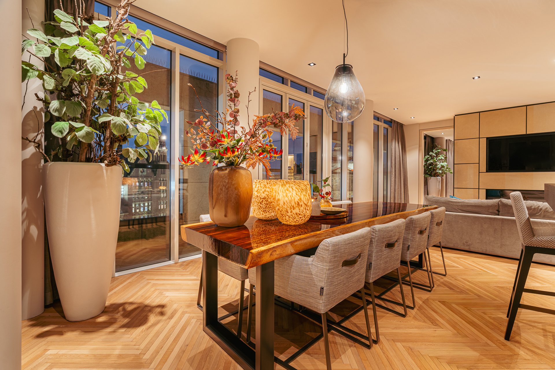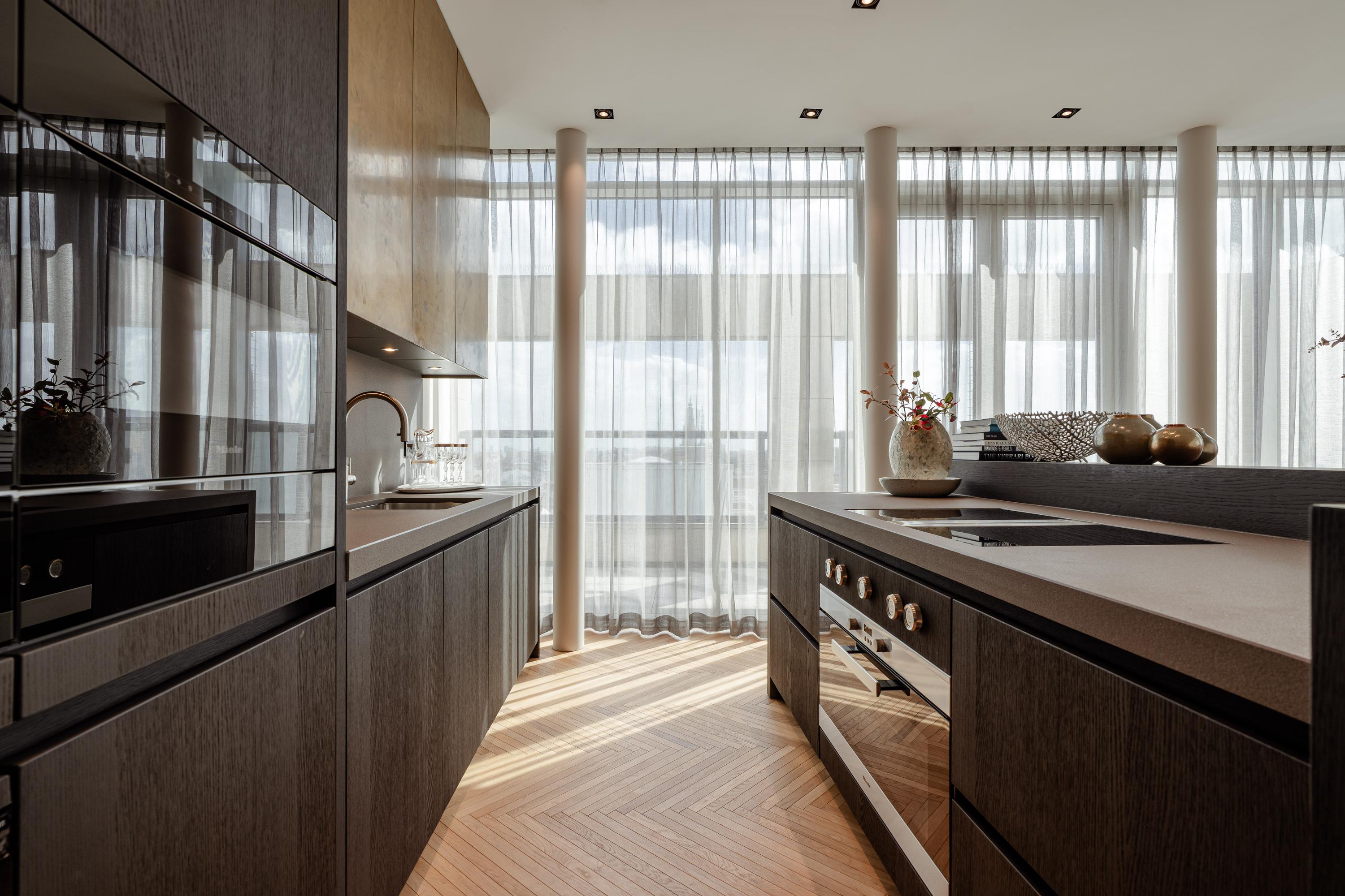 The open-plan kitchen with cooking island forms the heart of the home. Fully equipped with premium Miele appliances, including a wine cooler, steam oven, and coffee machine, it flows into the dining area and the large terrace, where you can enjoy a truly unique view over Dam Square.