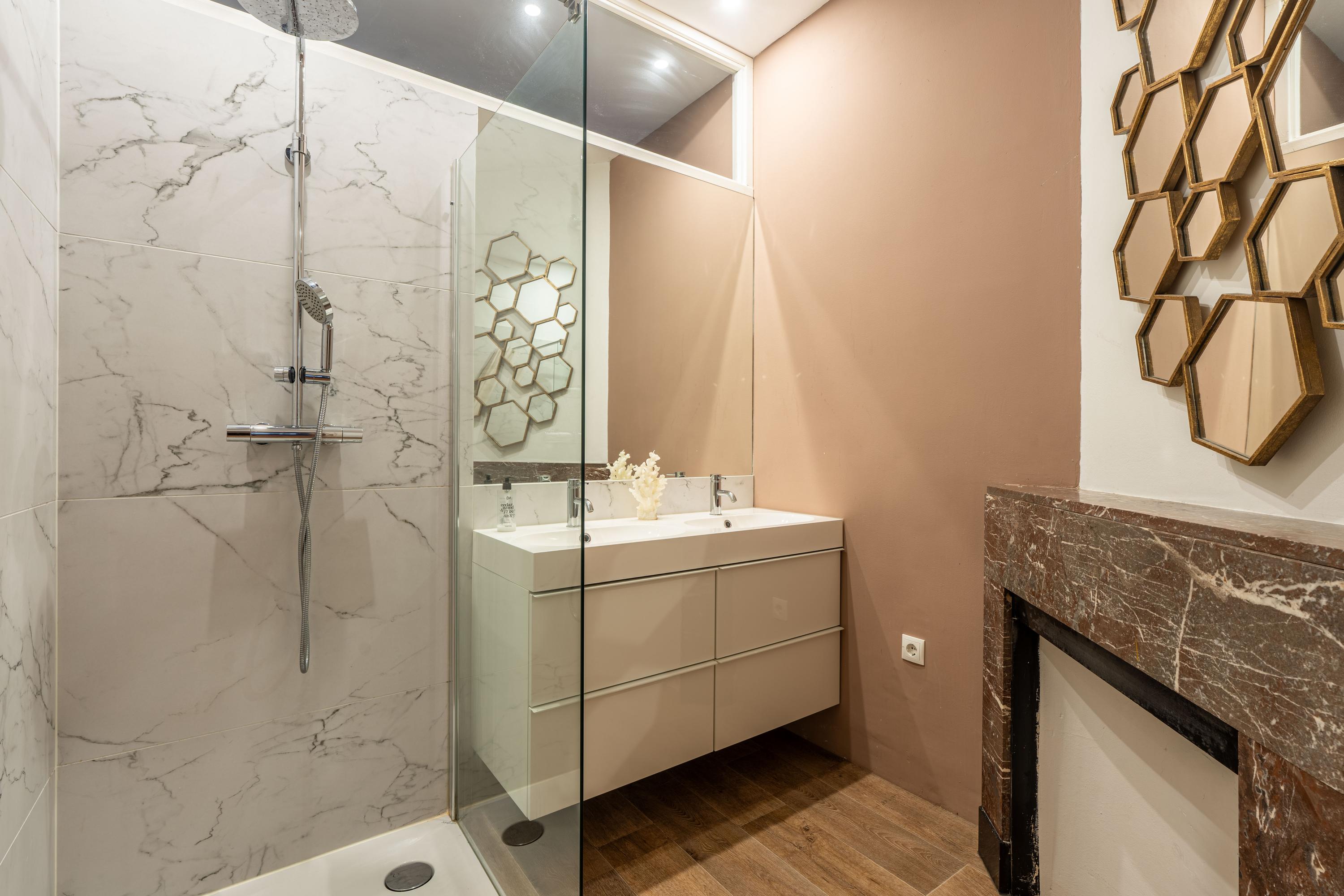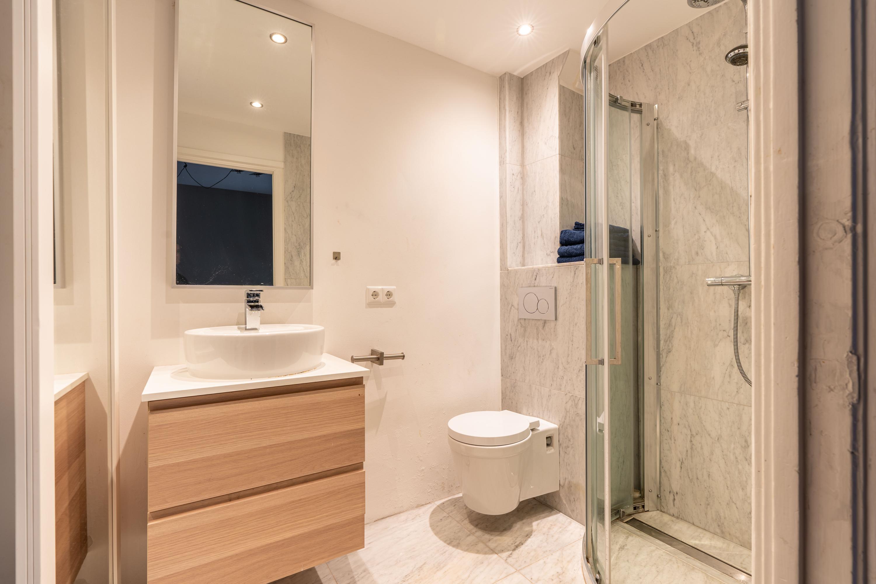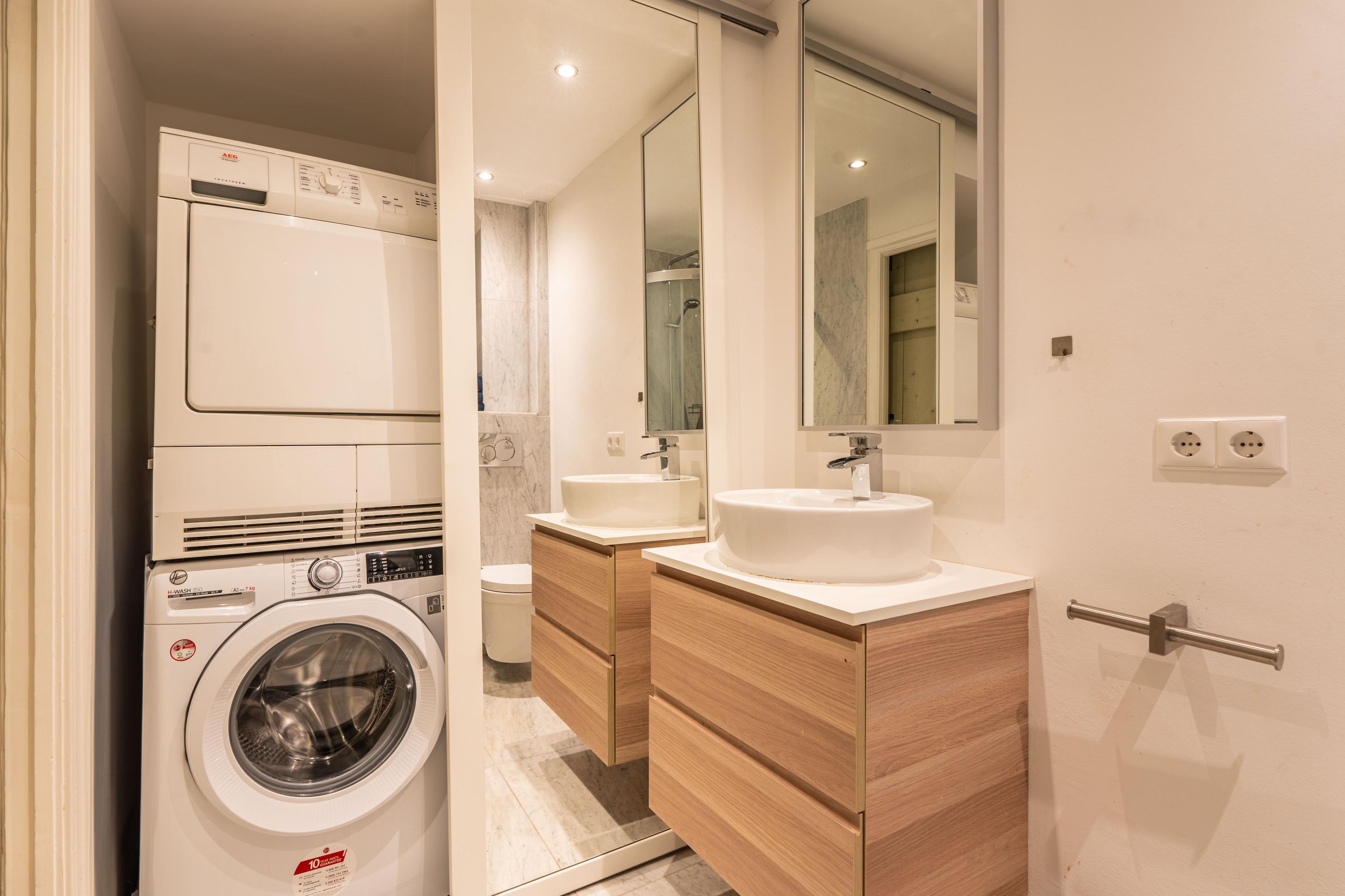Private entrance on the ground floor. The hallway leads to the first living room on the right, with access to the cozy patio at the rear of the property. At the front, you'll find the sleeping area and the kitchen, equipped with a 3-burner gas stove with an extractor hood, a dishwasher, a refrigerator, and a combination oven. A sliding door from the living room provides access to the modern bathroom, featuring a walk-in shower, toilet, and a sink with a vanity. Here, you'll also find the connections for a washing machine and dryer.