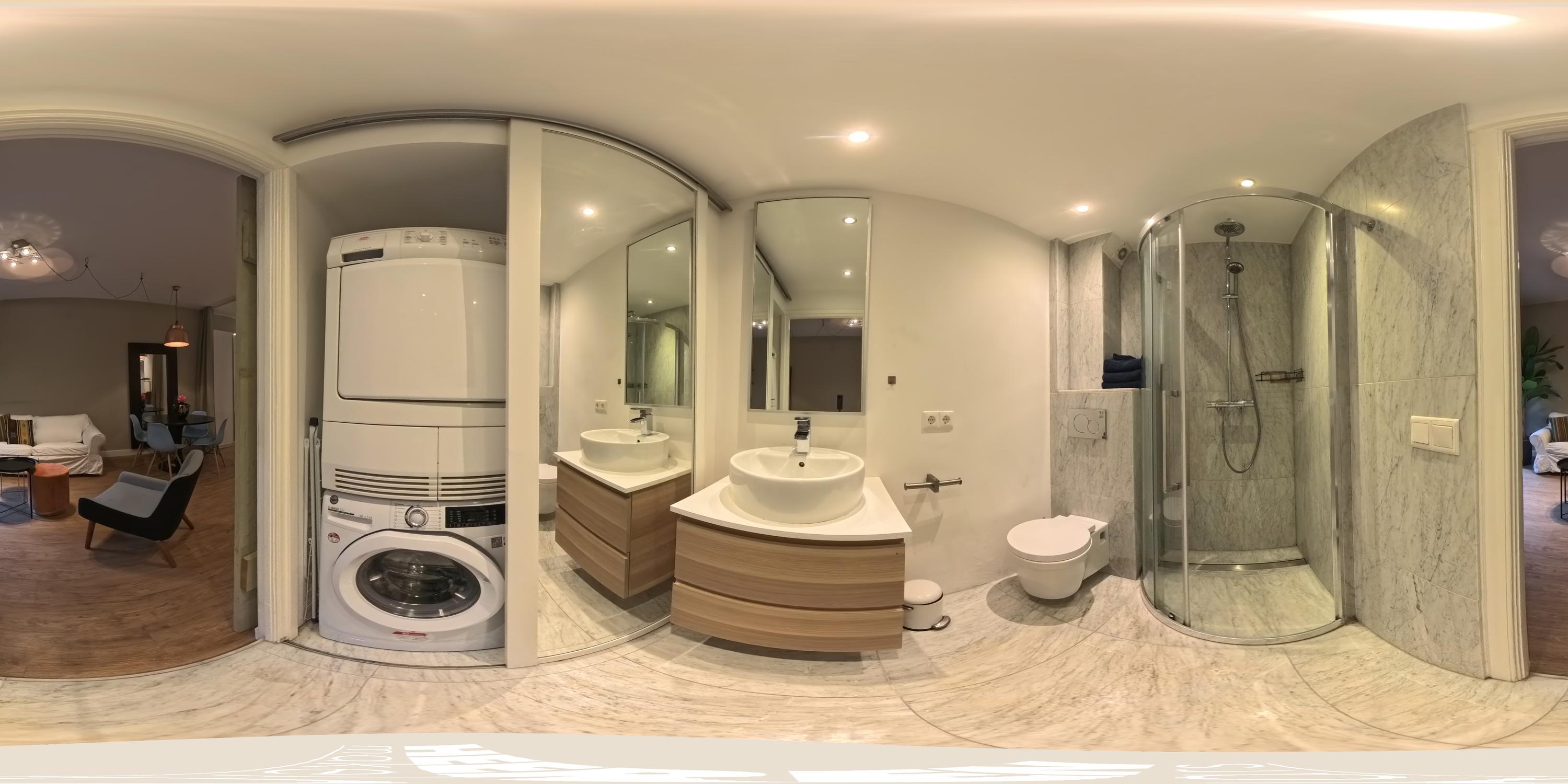 Left wing of the apartment is accessible from the central hallway near the entrance. The hallway also leads to a storage area with washing machine and dryer connections, and at the rear, a separate toilet with a sink. The living room at the front receives ample natural light through large windows and its favorable corner position. A staircase in the living room leads to the well-sized basement bedroom, which is also equipped with plumbing for creating a bathroom. Adjacent to the living room is the dining room en-suite, which can be closed off with beautiful sliding doors featuring built-in cabinets on both sides. At the rear, next to the dining room, is a practical study. The second bathroom, accessible via the hallway, includes a walk-in shower and a double sink with vanity.