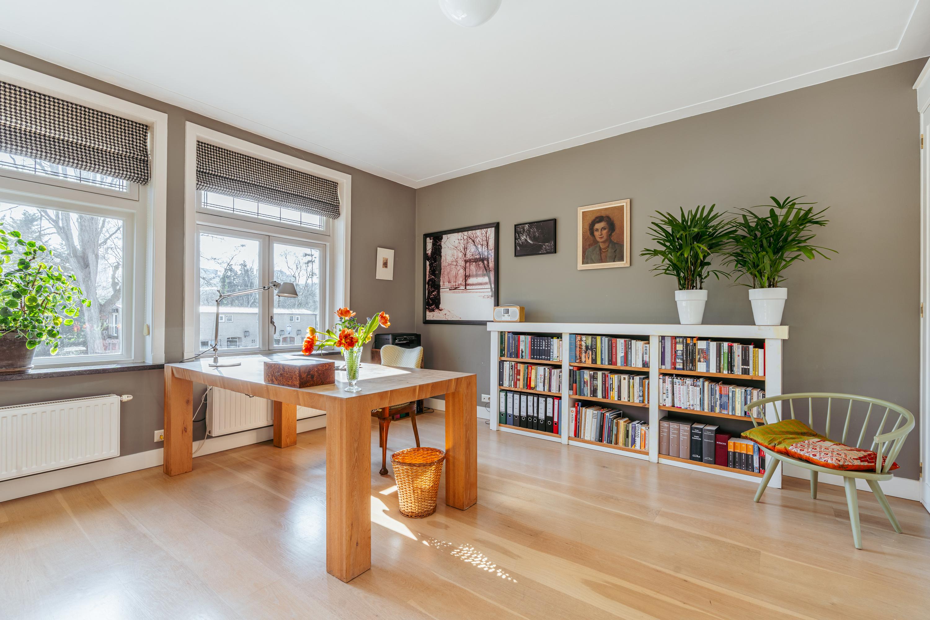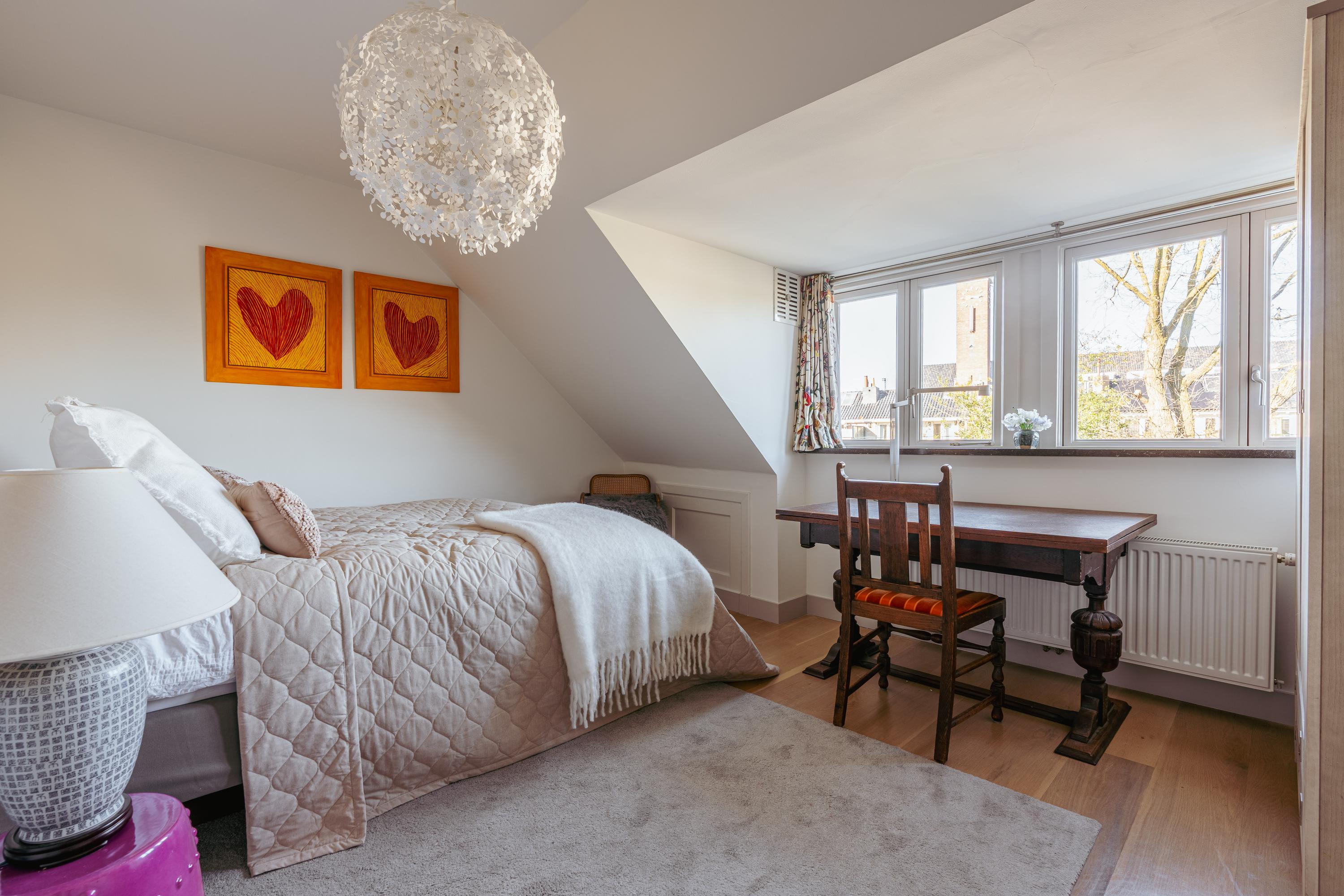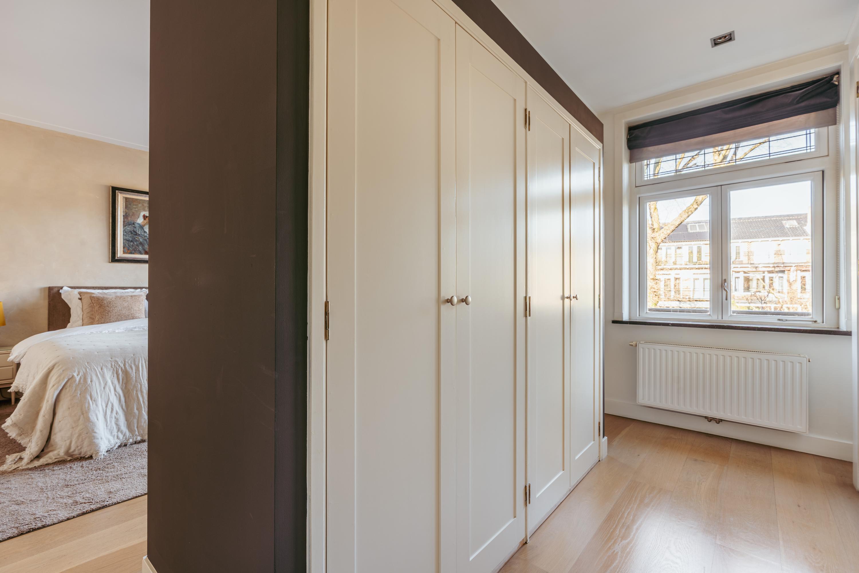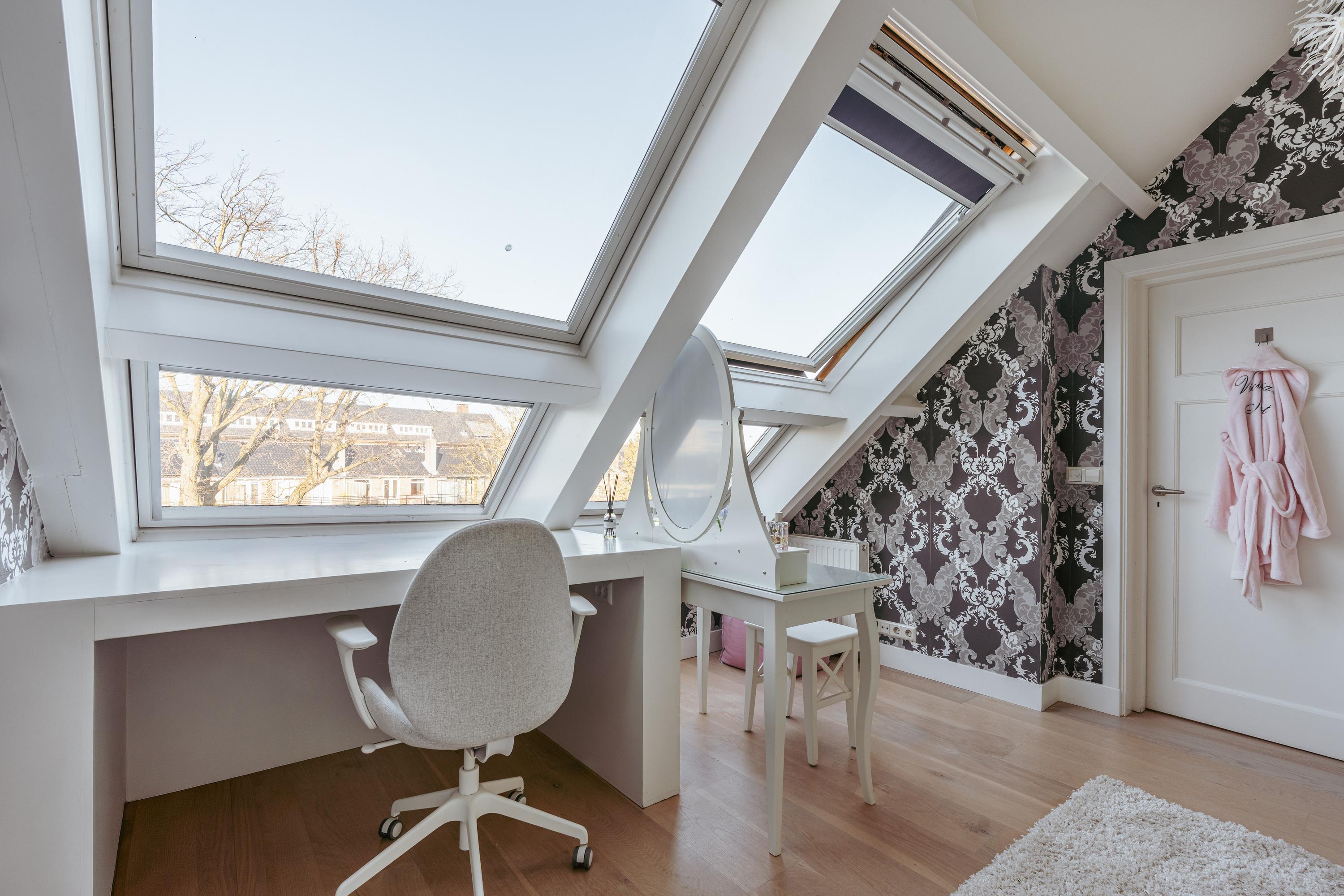 The upper levels host generous bedrooms, including a master suite with custom wardrobes and a secluded balcony. Multiple bathrooms ensure comfort and privacy. The top floor features ample natural light with impressive ceiling height, suitable for working or relaxing. High-quality finishes, dakraam for additional illumination, and insulation measures such as dakisolatie and double glazing contribute to its comfort.