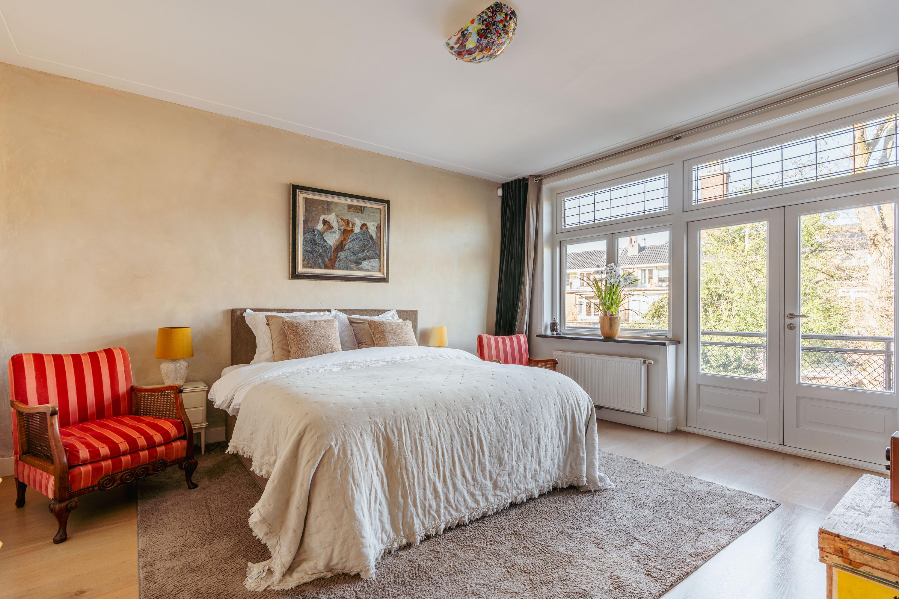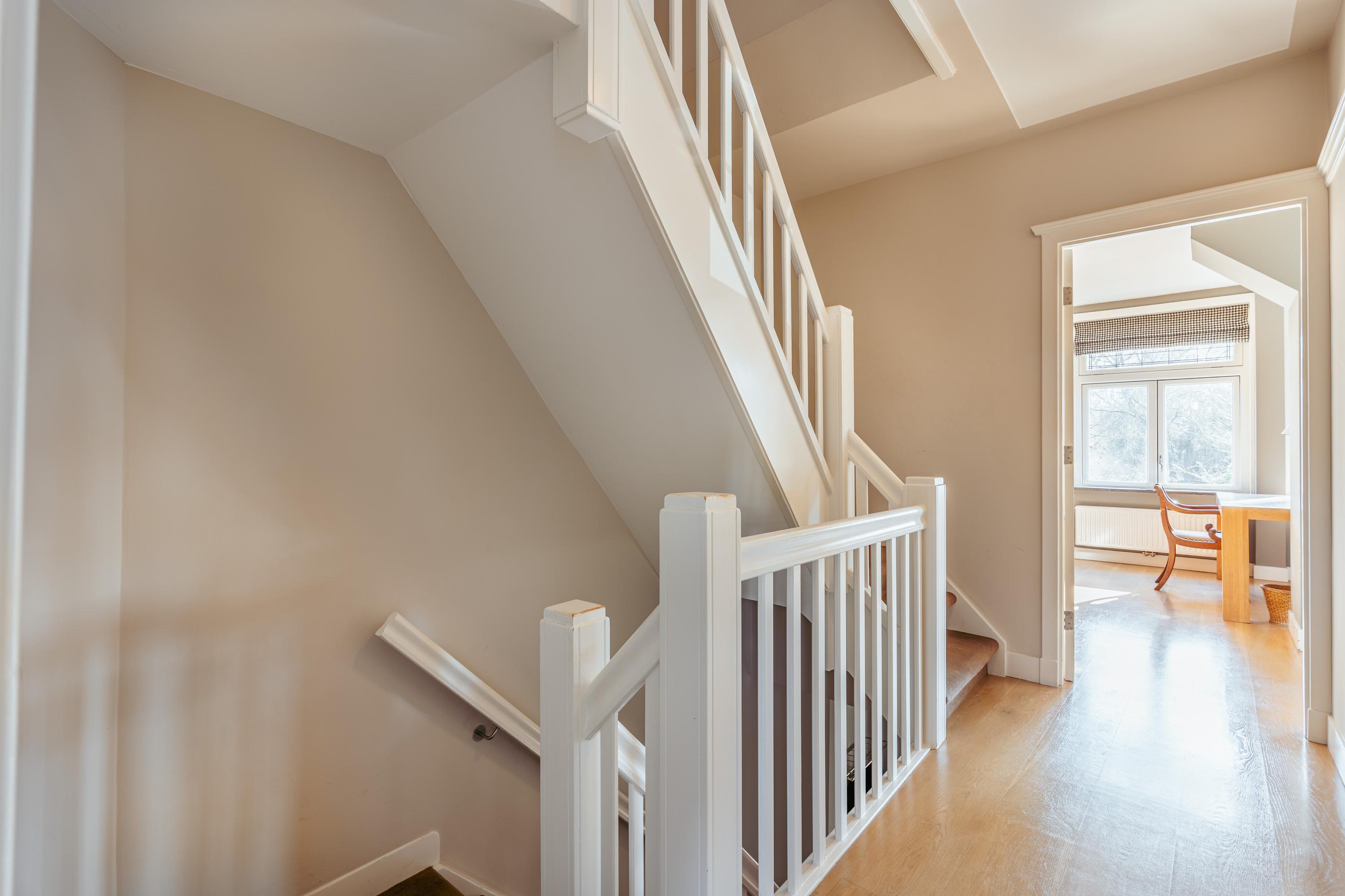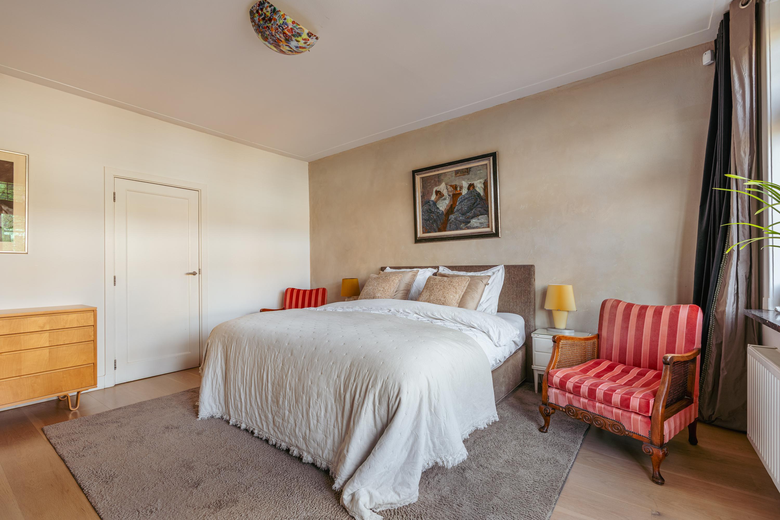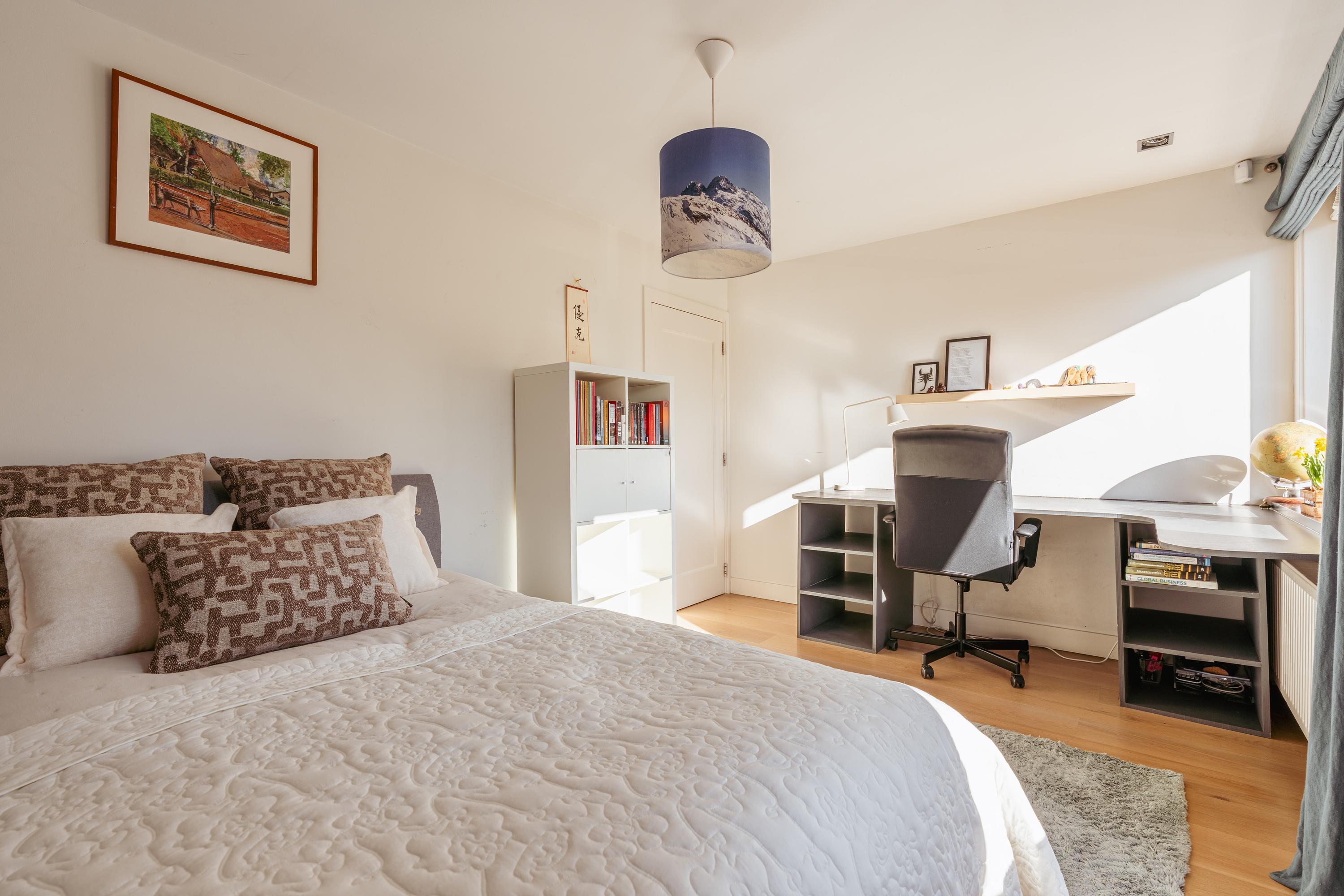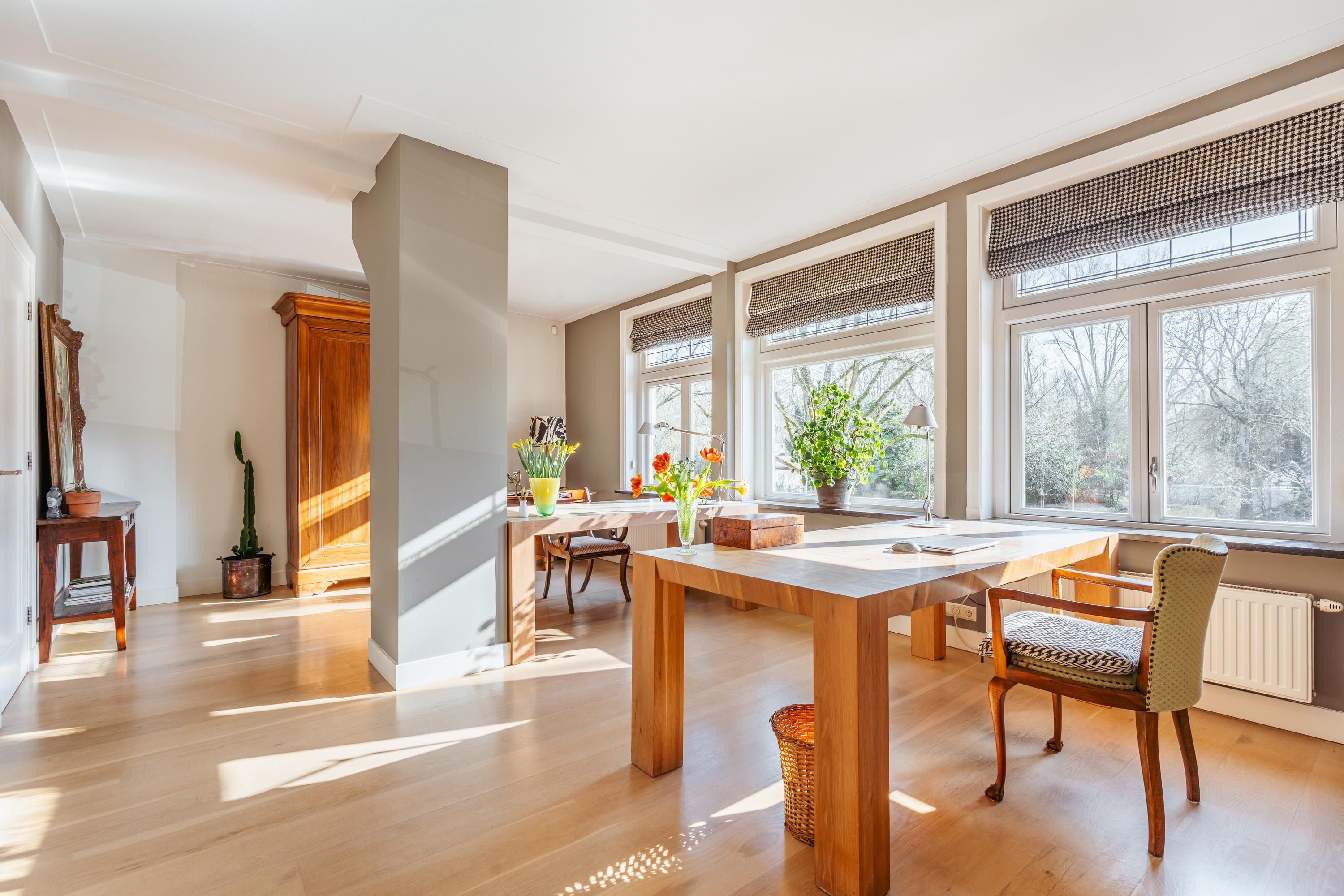 The upper levels host generous bedrooms, including a master suite with custom wardrobes and a secluded balcony. Multiple bathrooms ensure comfort and privacy. The top floor features ample natural light with impressive ceiling height, suitable for working or relaxing. High-quality finishes, dakraam for additional illumination, and insulation measures such as dakisolatie and double glazing contribute to its comfort.