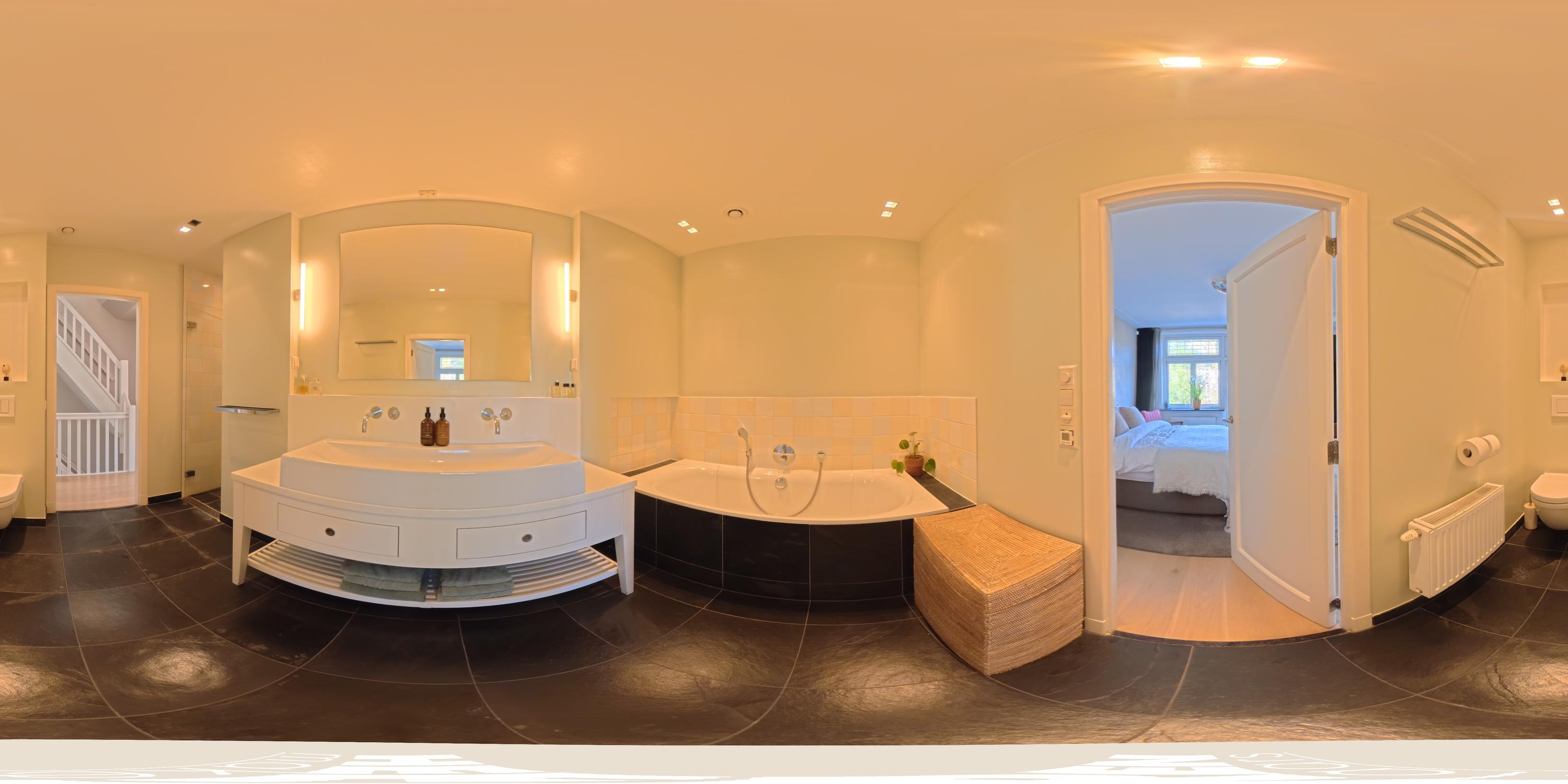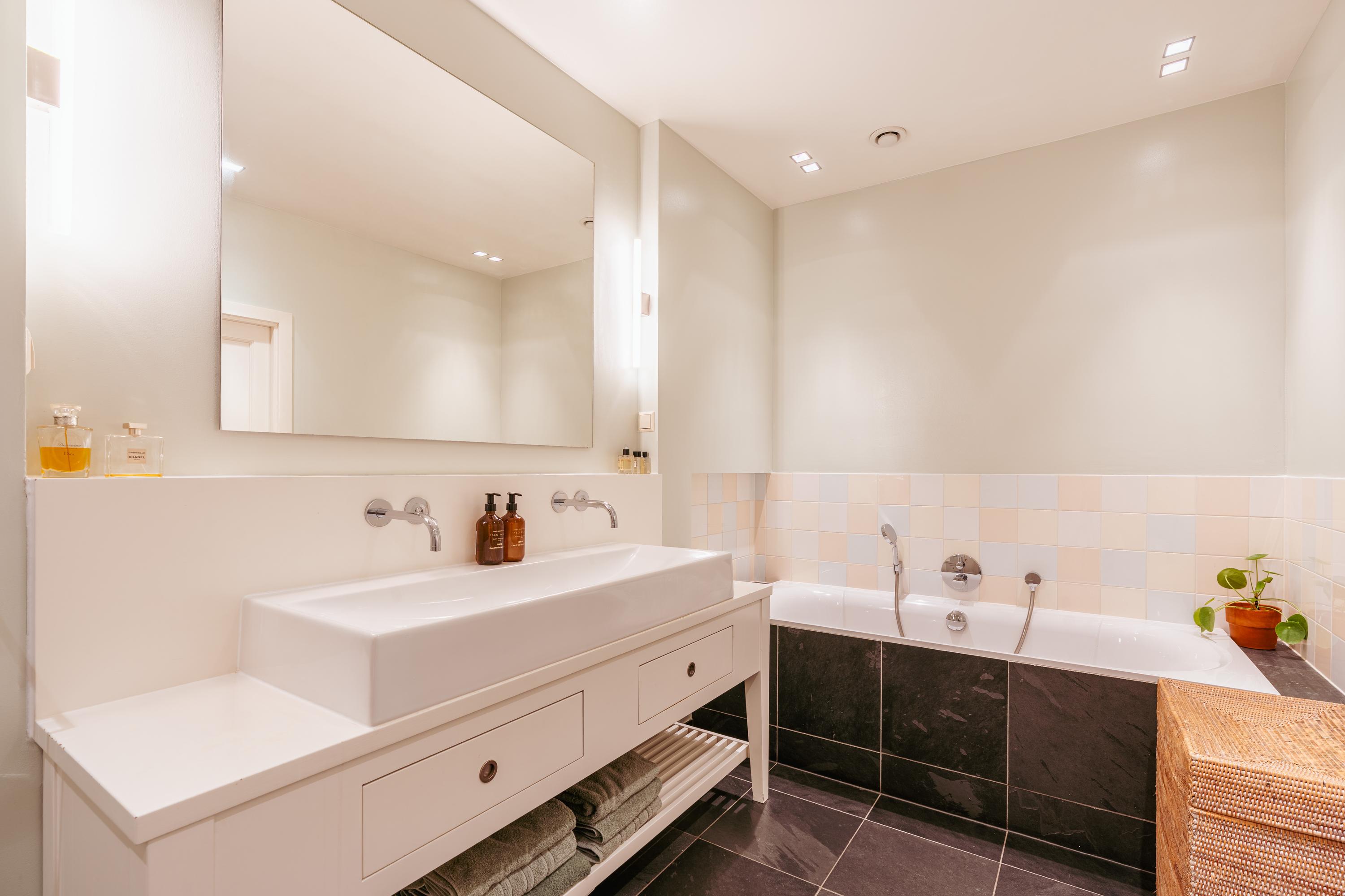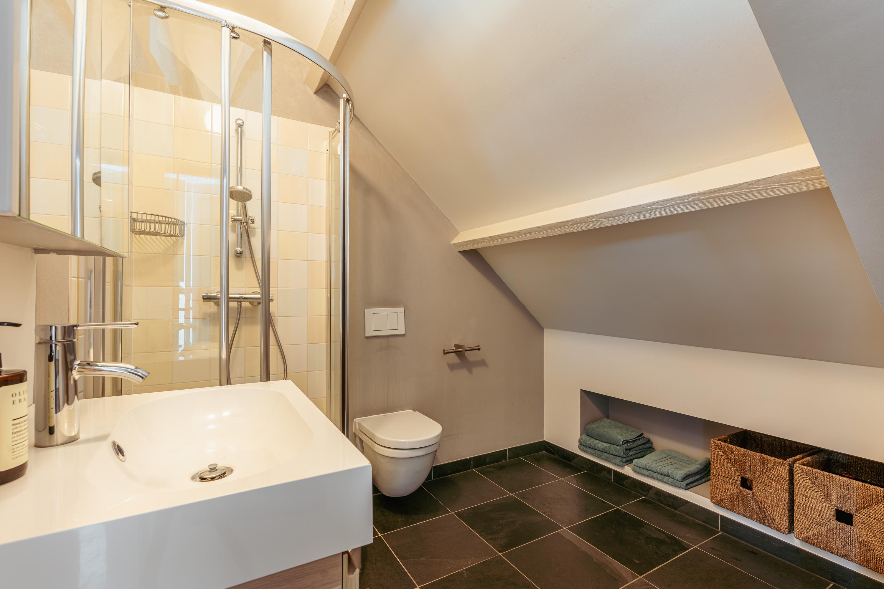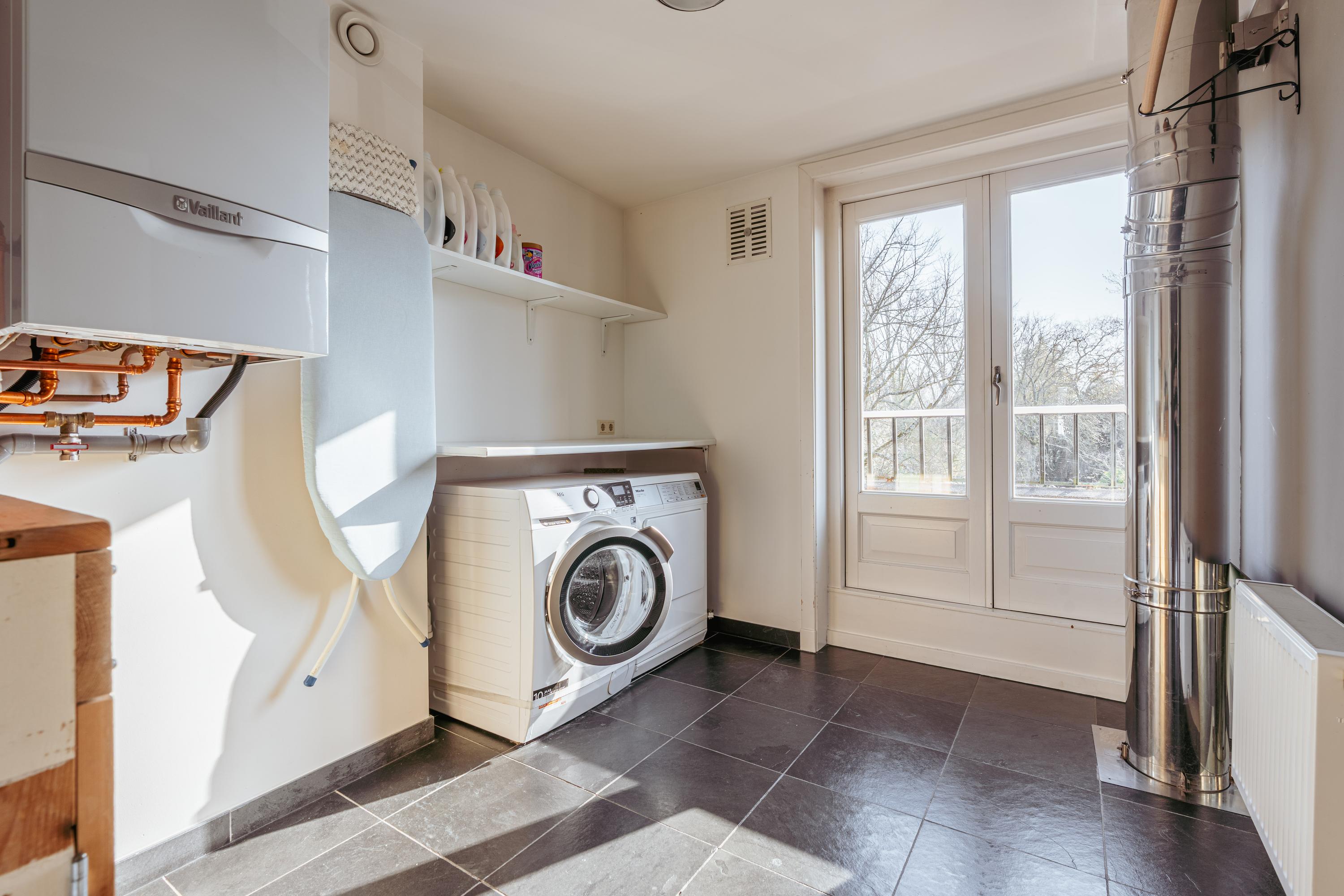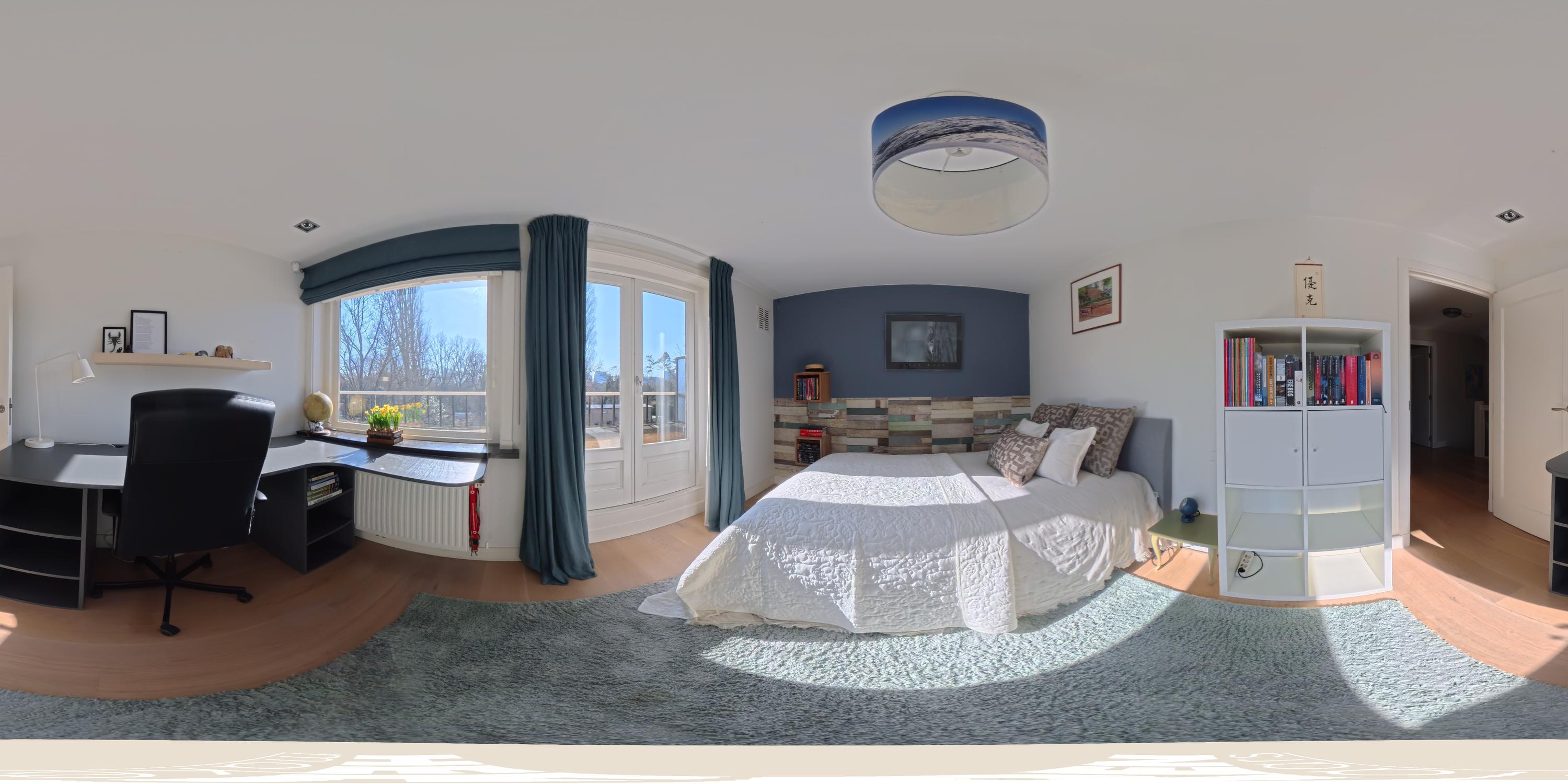 The upper levels host generous bedrooms, including a master suite with custom wardrobes and a secluded balcony. Multiple bathrooms ensure comfort and privacy. The top floor features ample natural light with impressive ceiling height, suitable for working or relaxing. High-quality finishes, dakraam for additional illumination, and insulation measures such as dakisolatie and double glazing contribute to its comfort.