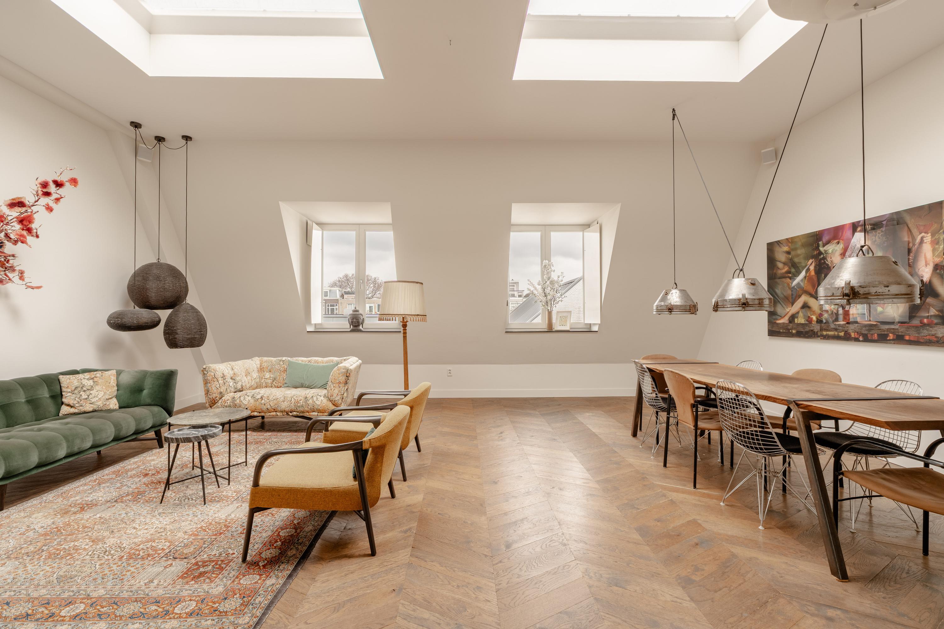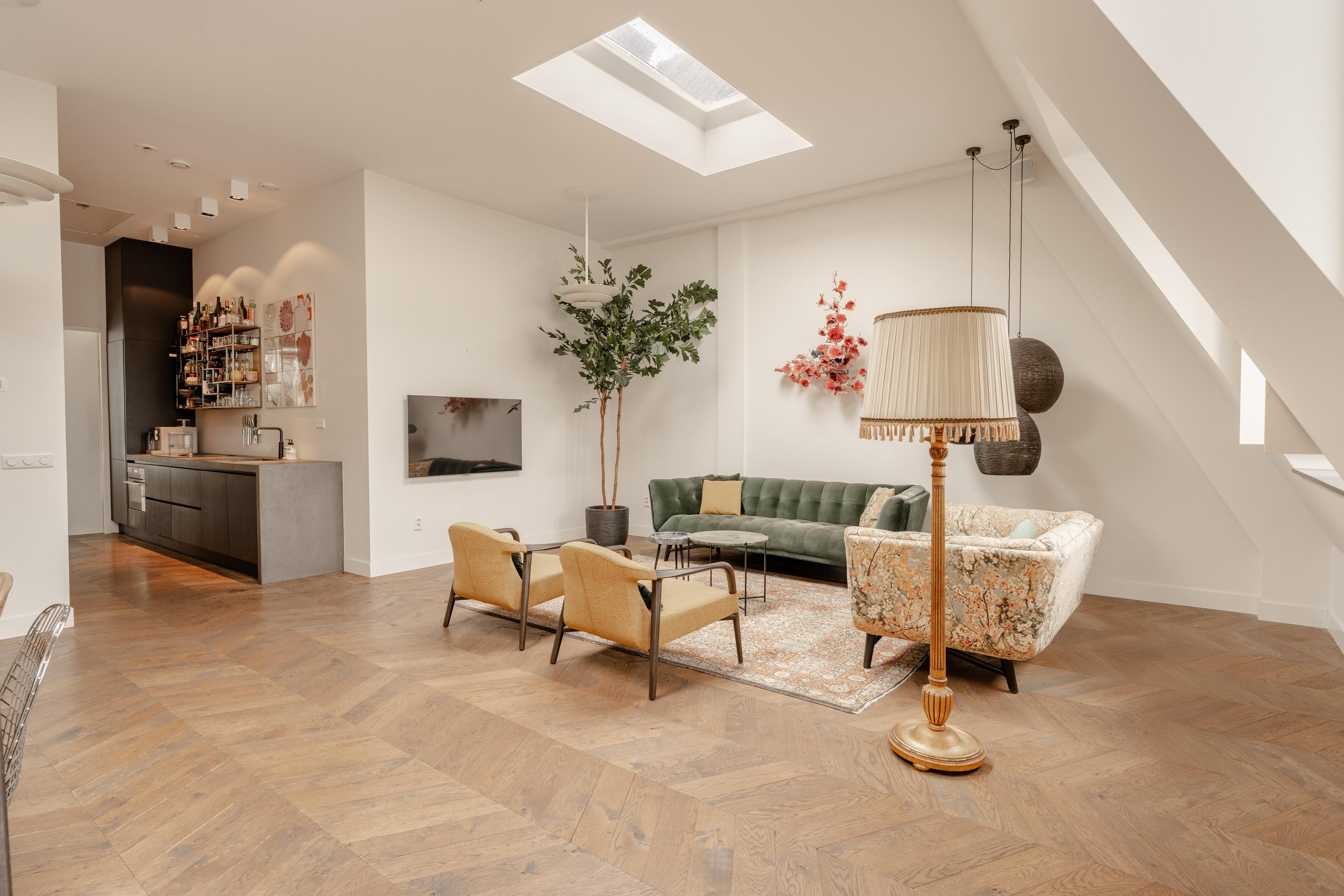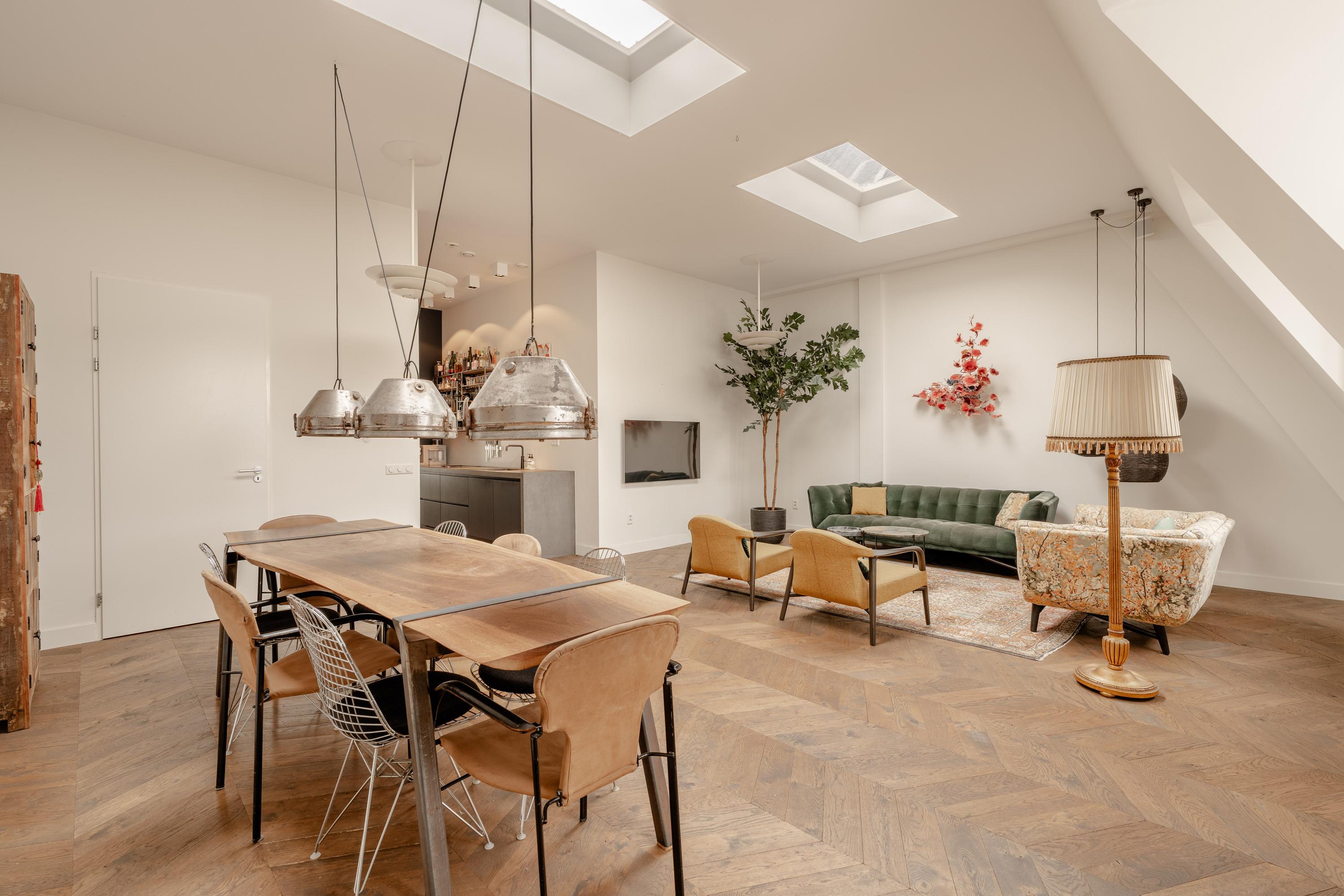In the heart of the highly sought-after Jordaan area, this bright duplex apartment of approximately 108 m² is located within the modern new-build complex “Elandshof”, completed in 2017. The apartment is spread over two floors and features, among other things, two bedrooms, two bathrooms, a spacious living floor with an open kitchen and a roof terrace with views over the rooftops of the Jordaan. Thanks to the high ceilings, skylights and large windows, the apartment benefits from excellent natural light and a wonderful sense of space.