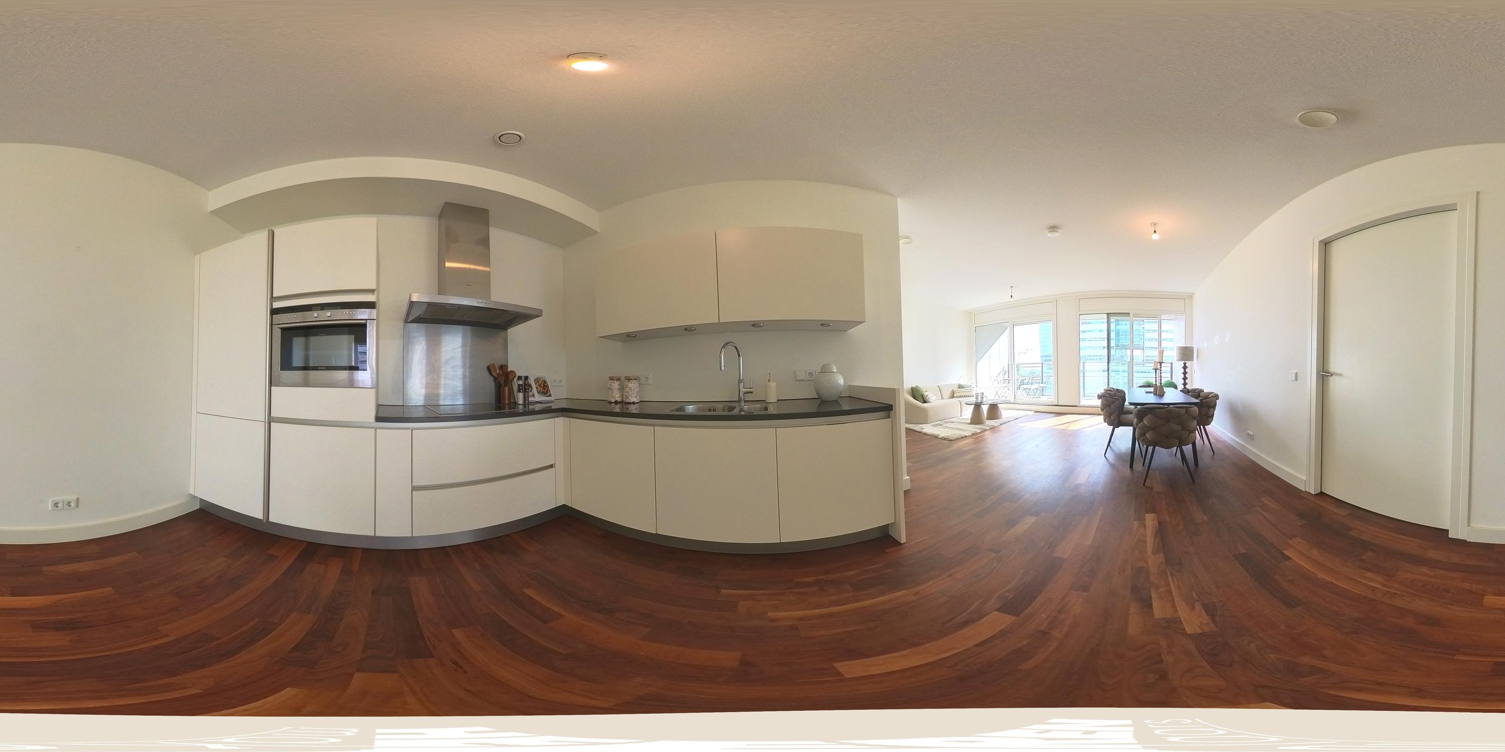 Upon entering the 8th floor, you step into a spacious hallway with a meter cupboard, separate toilet, and room for a wardrobe. From here, you enter the bright and airy living area, where the views immediately catch your eye, creating a sense of openness and calm. At the front, sliding glass doors give access to the generous balcony that spans the full width of the apartment — an ideal spot to relax, enjoy breakfast, or take in the view. The open-plan kitchen is situated at the rear and is equipped with modern built-in appliances, including a fridge, freezer, induction hob, Quooker, and dishwasher.