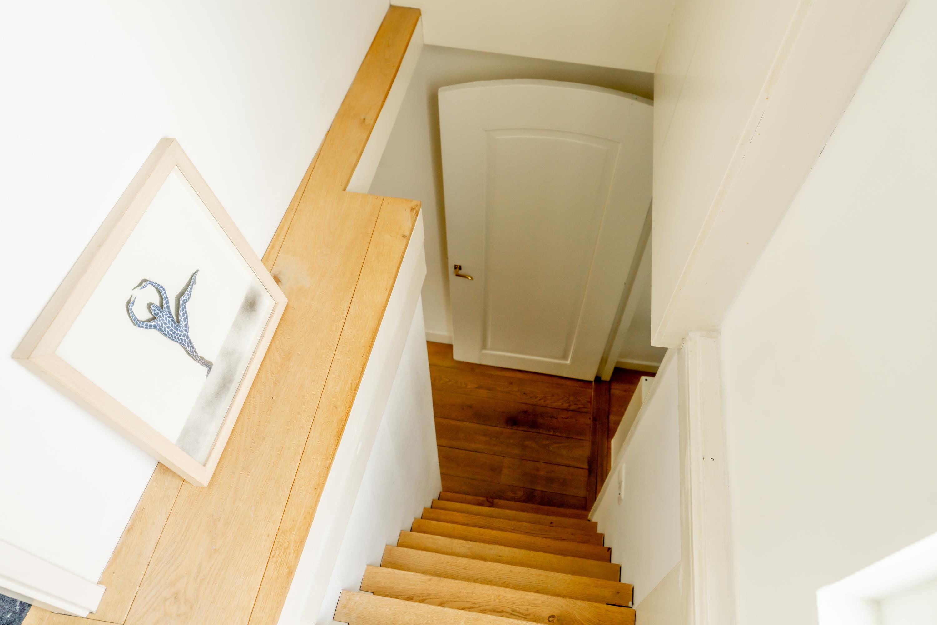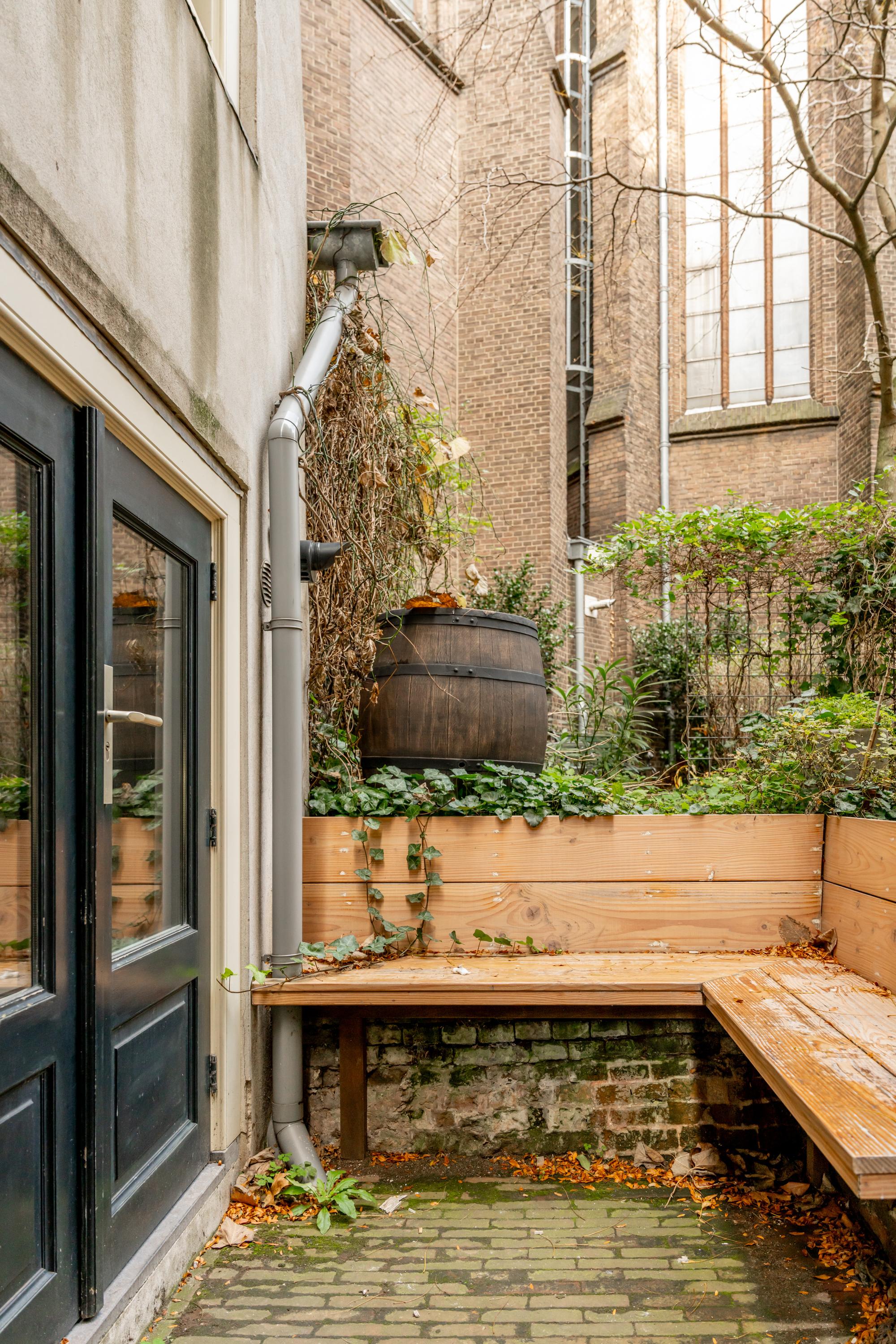 An architectural staircase brings you to the first floor. Here: a spacious bedroom with private bathroom (shower, bath, double sinks, toilet). At the front, an atmospheric second living room with canal views — or a full bedroom — a space that breathes, carries and inspires. From this floor you can also step onto the patio: a hidden peaceful spot in the middle of the city.