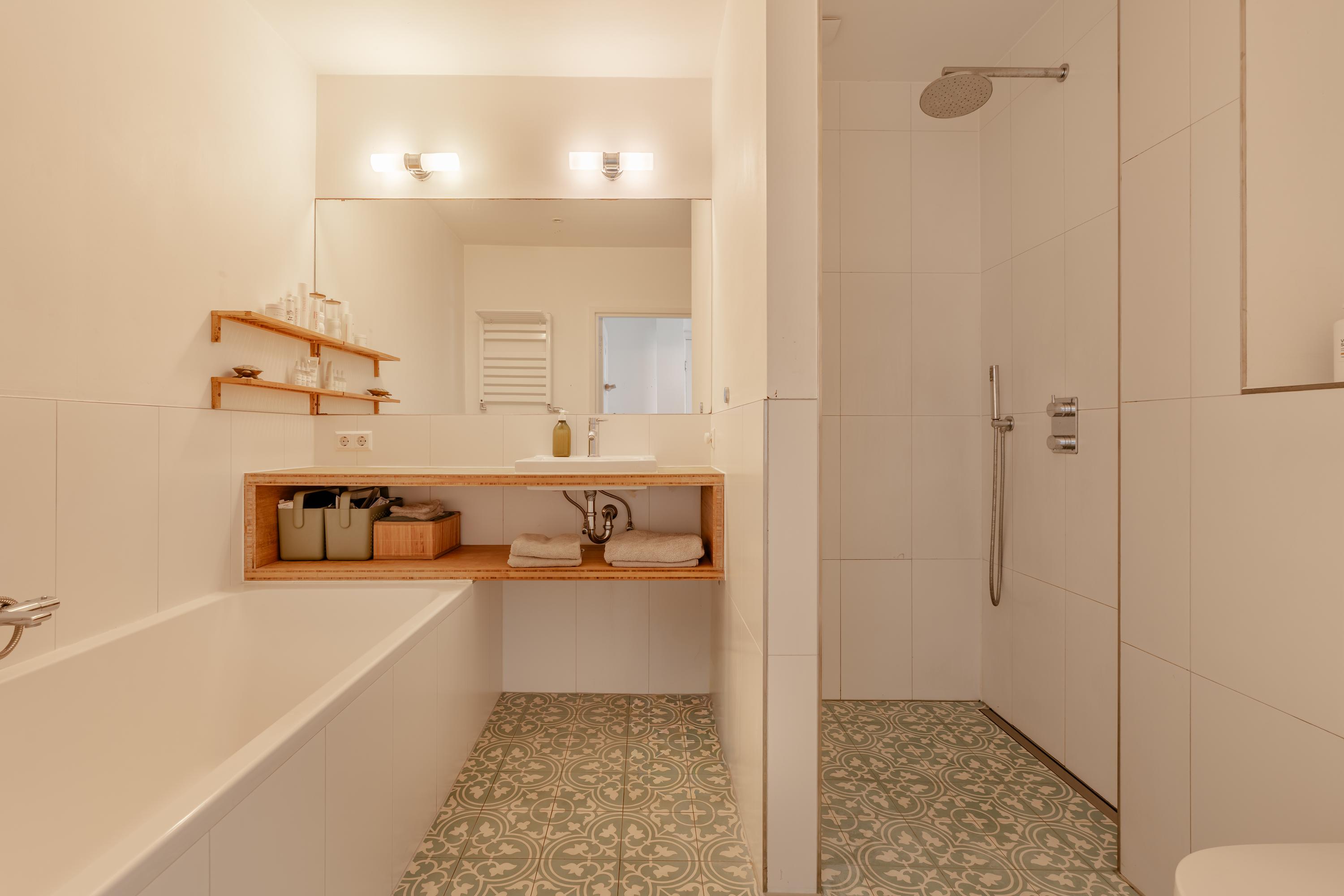 The modern bathroom is located on the landing and is finished in a calm and well-maintained style. It includes a bathtub, walk-in shower, toilet, and a stylish vanity unit with washbasin.