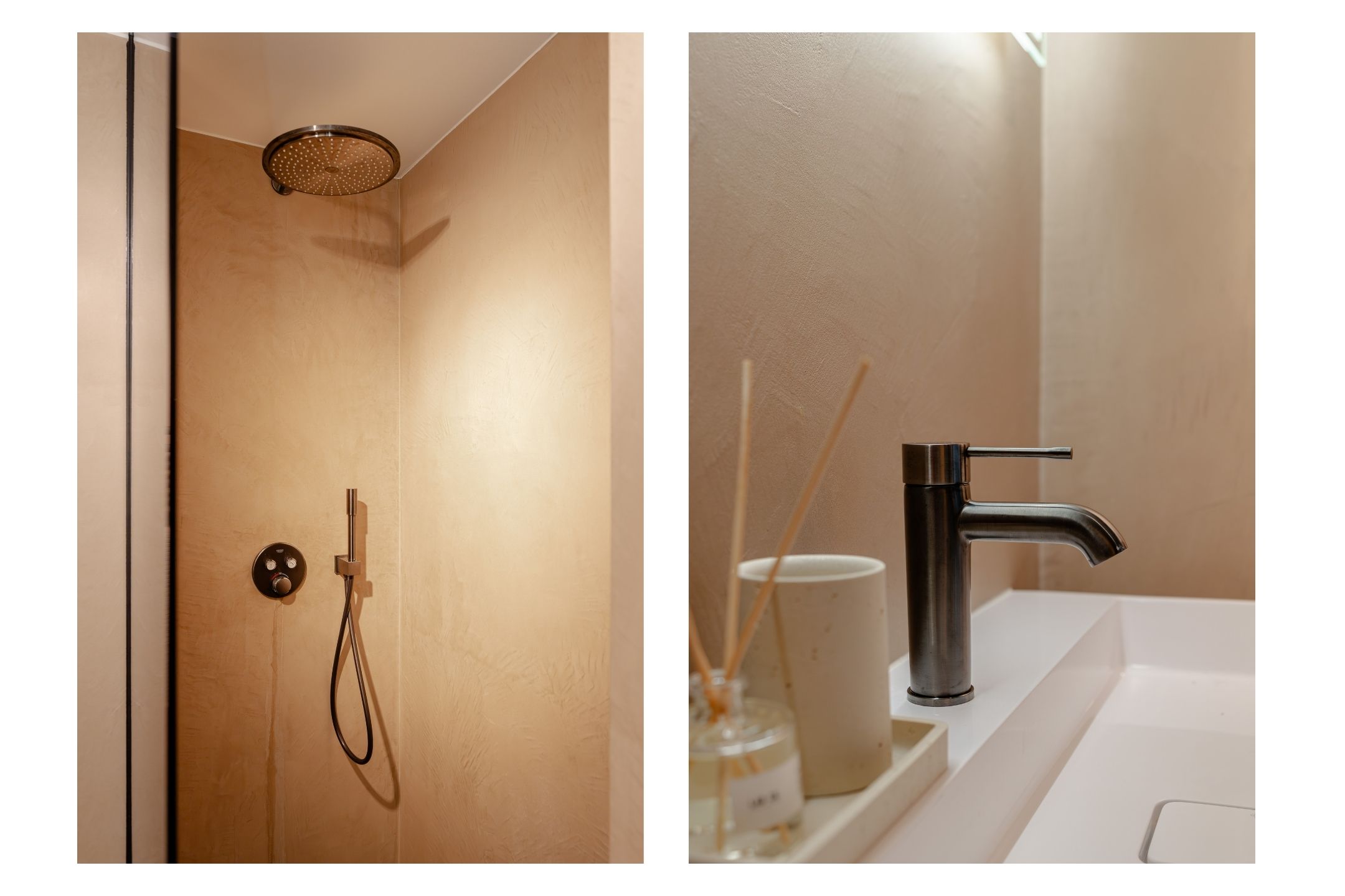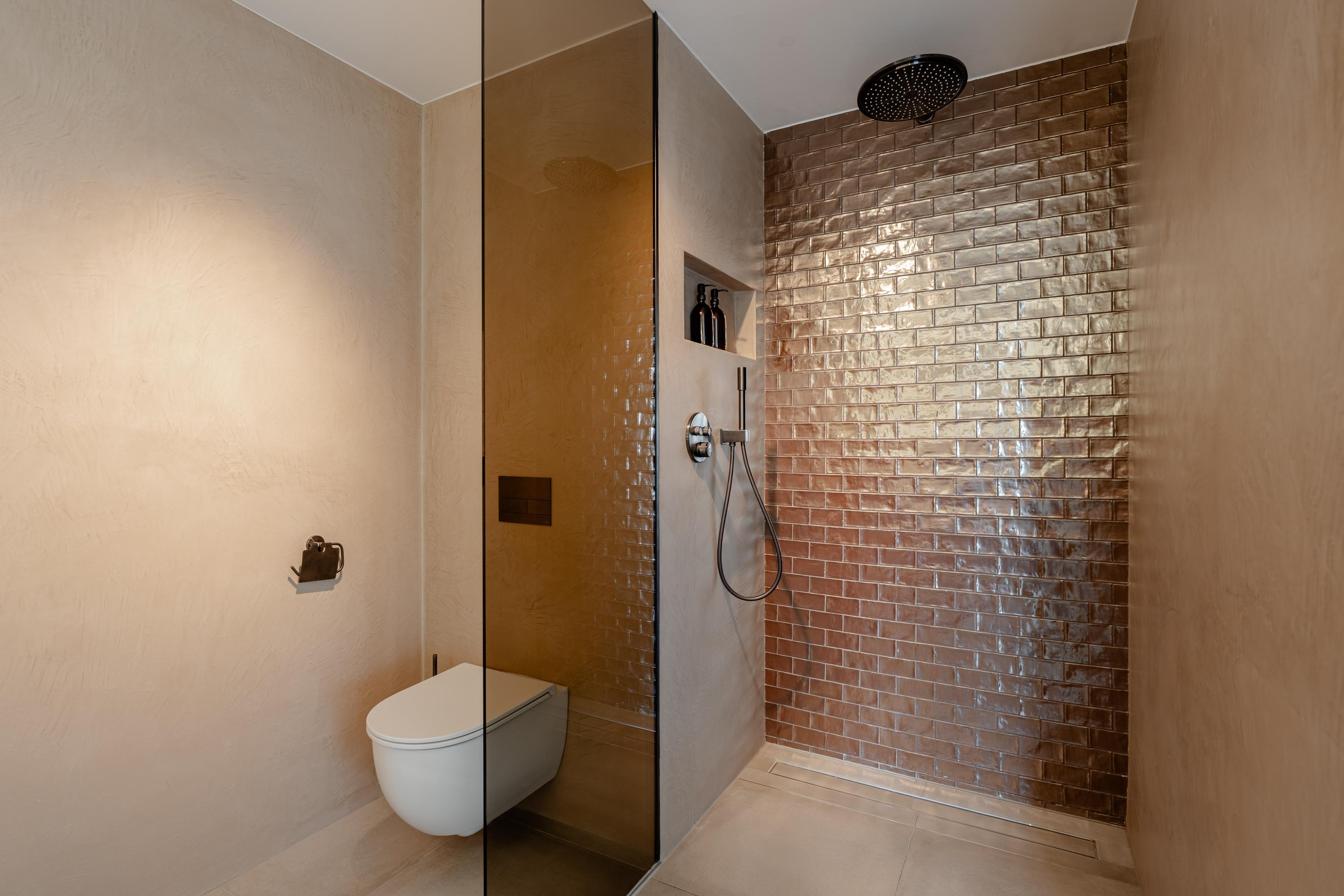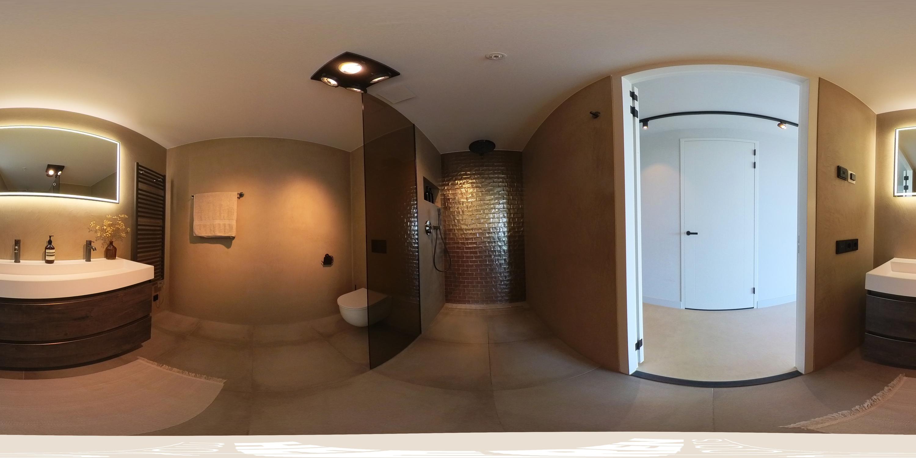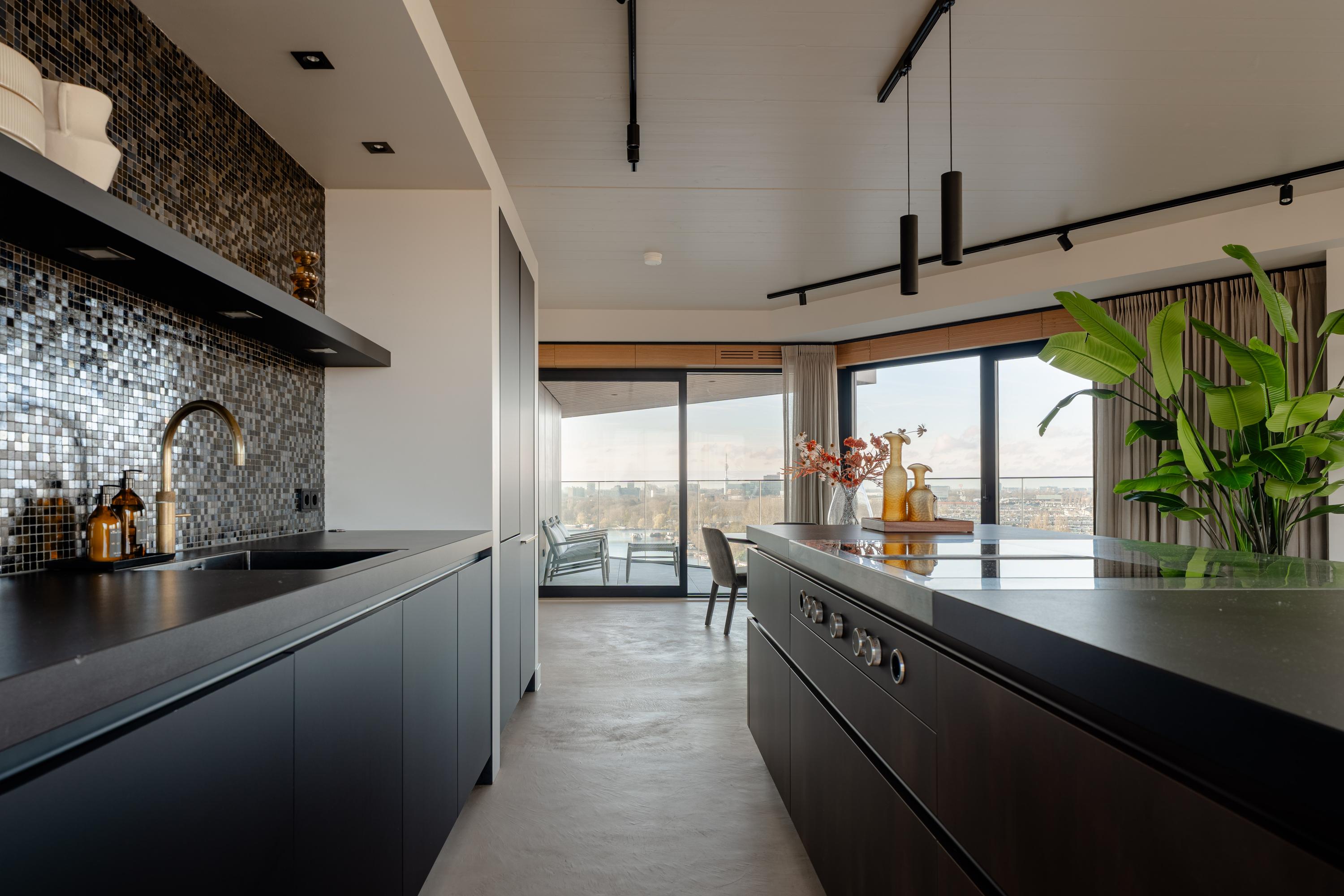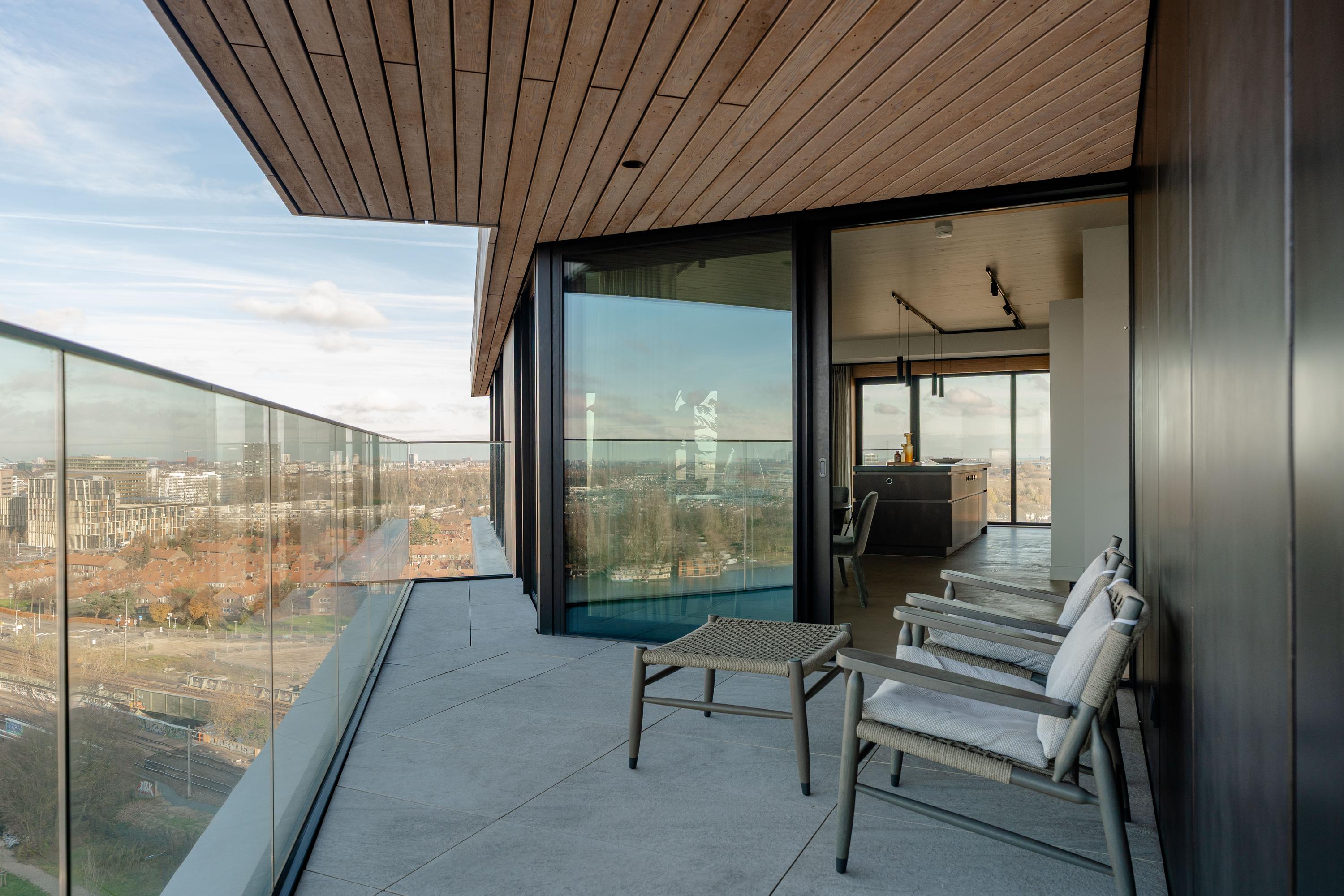 The apartment is accessed via the shared entrance, either by lift or staircase. Upon entering, you arrive in a spacious hallway that provides access to nearly all rooms of the property. From here, you reach the generous living room with open kitchen, three bedrooms, a bathroom, and a separate toilet. The living room is distinguished by its unique triangular layout and the extensive floor-to-ceiling windows along the façade, which ensure excellent natural light and offer unobstructed views towards the River Amstel. The space is generously proportioned and easily accommodates a comfortable seating area and a large dining table. From the living room, there is access to the spacious, covered balconyan inviting outdoor area with beautiful views over the city and the water. The open kitchen is centrally positioned within the living area and designed in a modern, sleek style. It is equipped with high-quality built-in appliances, including an induction cooktop with integrated extraction, a Quooker, a climate-controlled wine cabinet, a fridge/freezer combination, a dishwasher, and two Gaggenau ovens. The apartment features three well-proportioned bedrooms. The largest bedroom benefits from an en-suite bathroom, luxuriously finished with a washbasin and vanity unit, walk-in shower, and toilet. The second bathroom is accessible from the hallway and includes a walk-in shower, double washbasin, and a light, contemporary finish. In addition, there is a separate toilet.