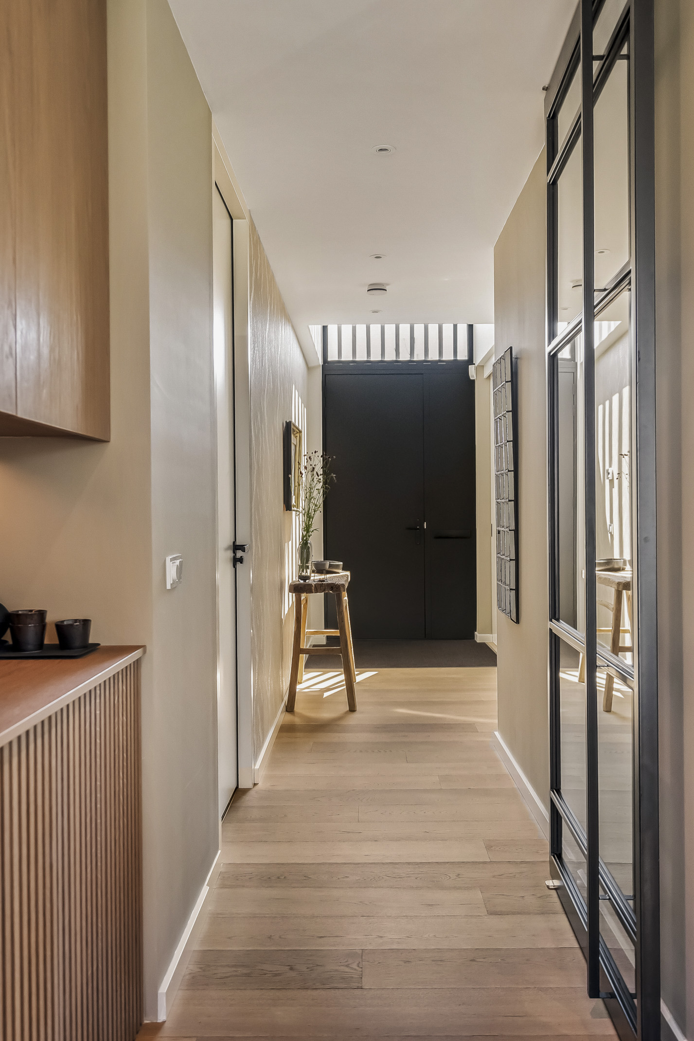 From the spacious hall with high ceilings, you enter the generous living area with large glass windows that immediately offer a beautiful view. The space has an impressive ceiling height and a cozy fireplace. Various sliding doors lead to the carefully landscaped garden with its own dock on the water. The garden features a large hardwood terrace, lawn and green borders.