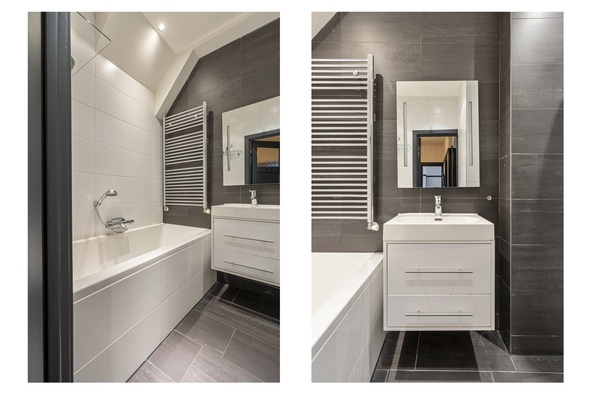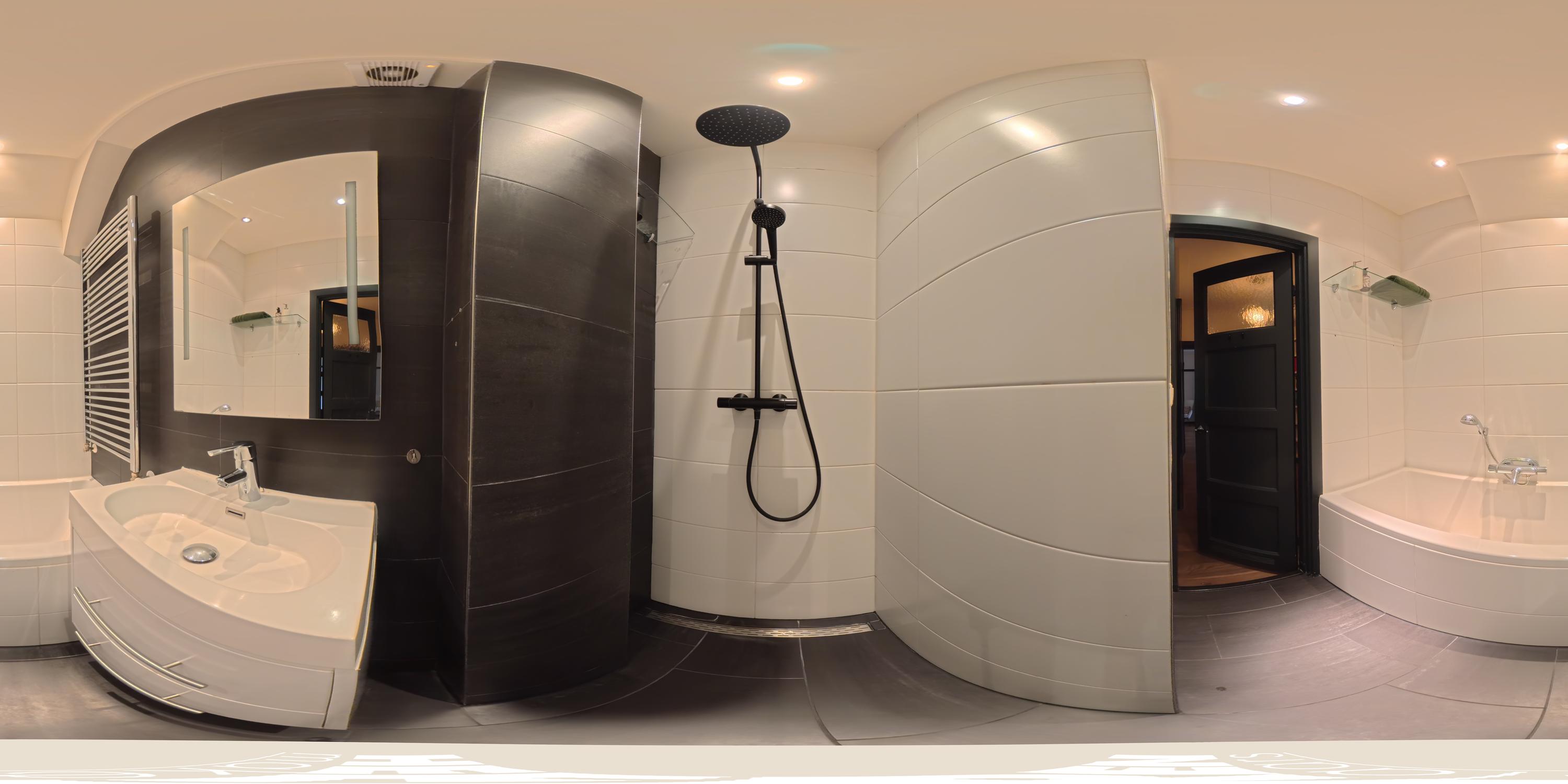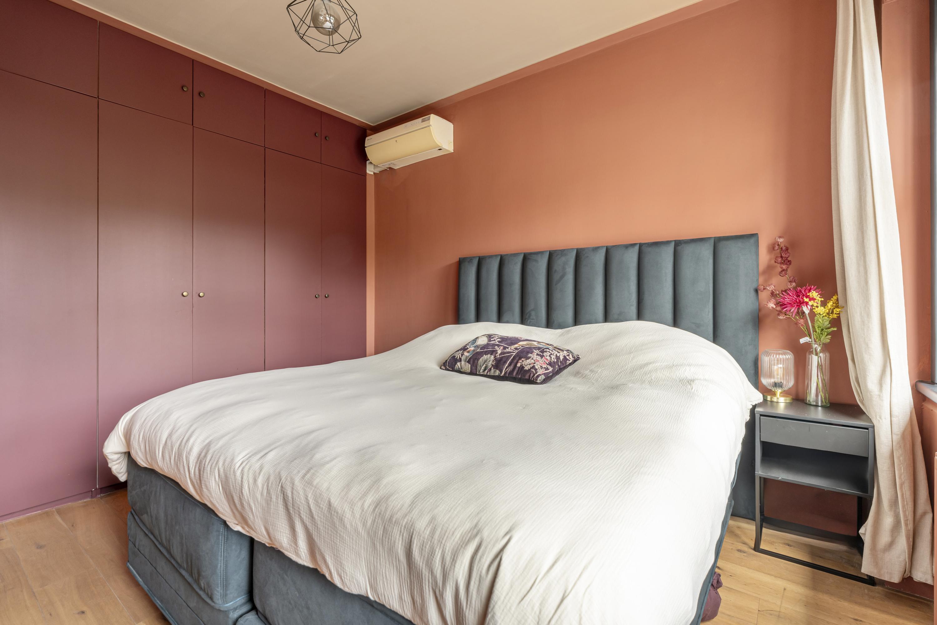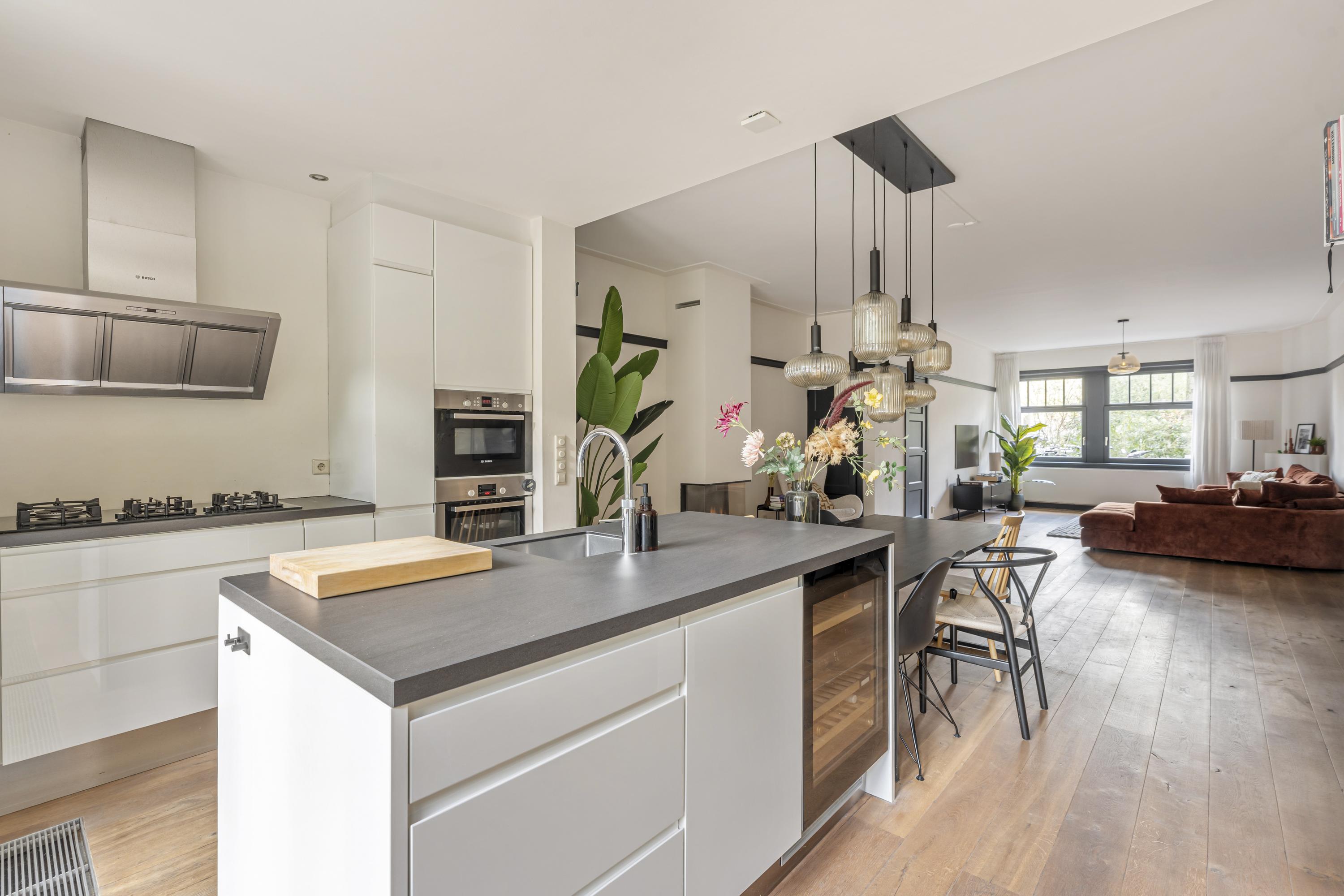 Upon entering through the private entrance, you arrive in the hallway, which provides access to the central hall and the various rooms. To the right, you will find the spacious living room, a bright and inviting space featuring large windows at the front and French doors at the rear. The living room offers ample space for both a comfortable seating and dining area and is equipped with a charming gas fireplace, adding warmth and atmosphere. Adjoining the living room is the open-plan kitchen, which truly forms the heart of the home. The kitchen features a generous island with a Quooker tap and an integrated climate-controlled wine cabinet. The island is perfectly suited for placing a dining table, creating a natural and sociable connection between cooking and dining. The kitchen is further equipped with a five-burner gas stove, combi-oven, separate oven, dishwasher, and extractor hood. Thanks to the French doors and large windows, the kitchen enjoys a direct connection to the garden and offers a pleasant view outside. When the doors are opened, the covered terrace becomes an extension of the kitchen, creating a seamless indoor-outdoor living experience. The property comprises three bedrooms. The master bedroom is generously sized and, like the hallway, is fitted with air conditioning. The additional bedrooms are well-suited as children’s rooms, a home office, or guest rooms. Centrally located within the property is a spacious hall featuring a custom-built wall with open shelving, functioning as a stylish bookcase and offering ample space for books, art, and decorative objects. From this hall, all bedrooms, the bathroom, and the separate toilet are accessible. The bathroom is fitted with a bathtub and washbasin.