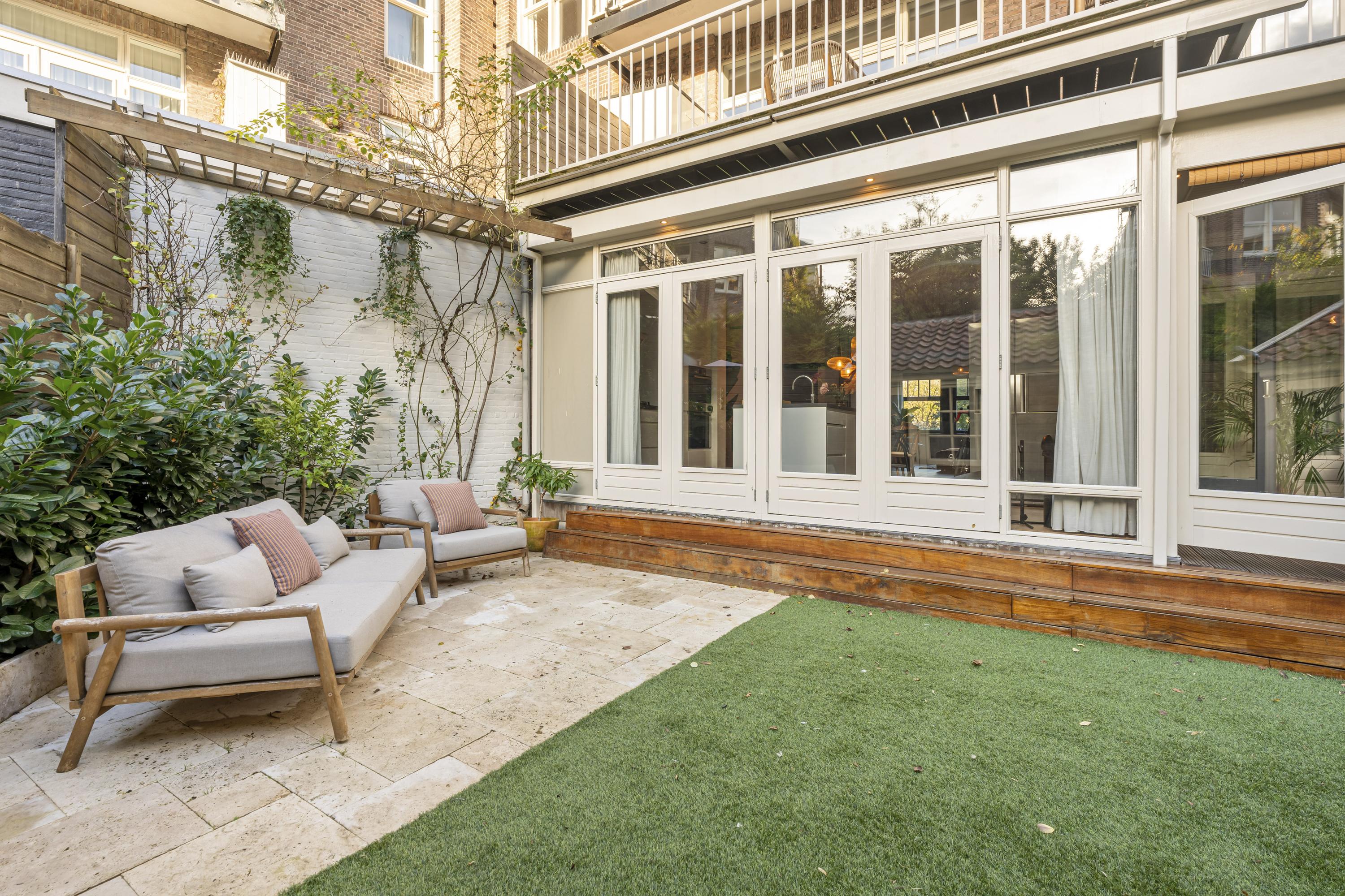 The sunny southwest-facing garden offers a high degree of privacy and features, in addition to the veranda, a detached garden house, ideal for extra storage or bicycle parking.
