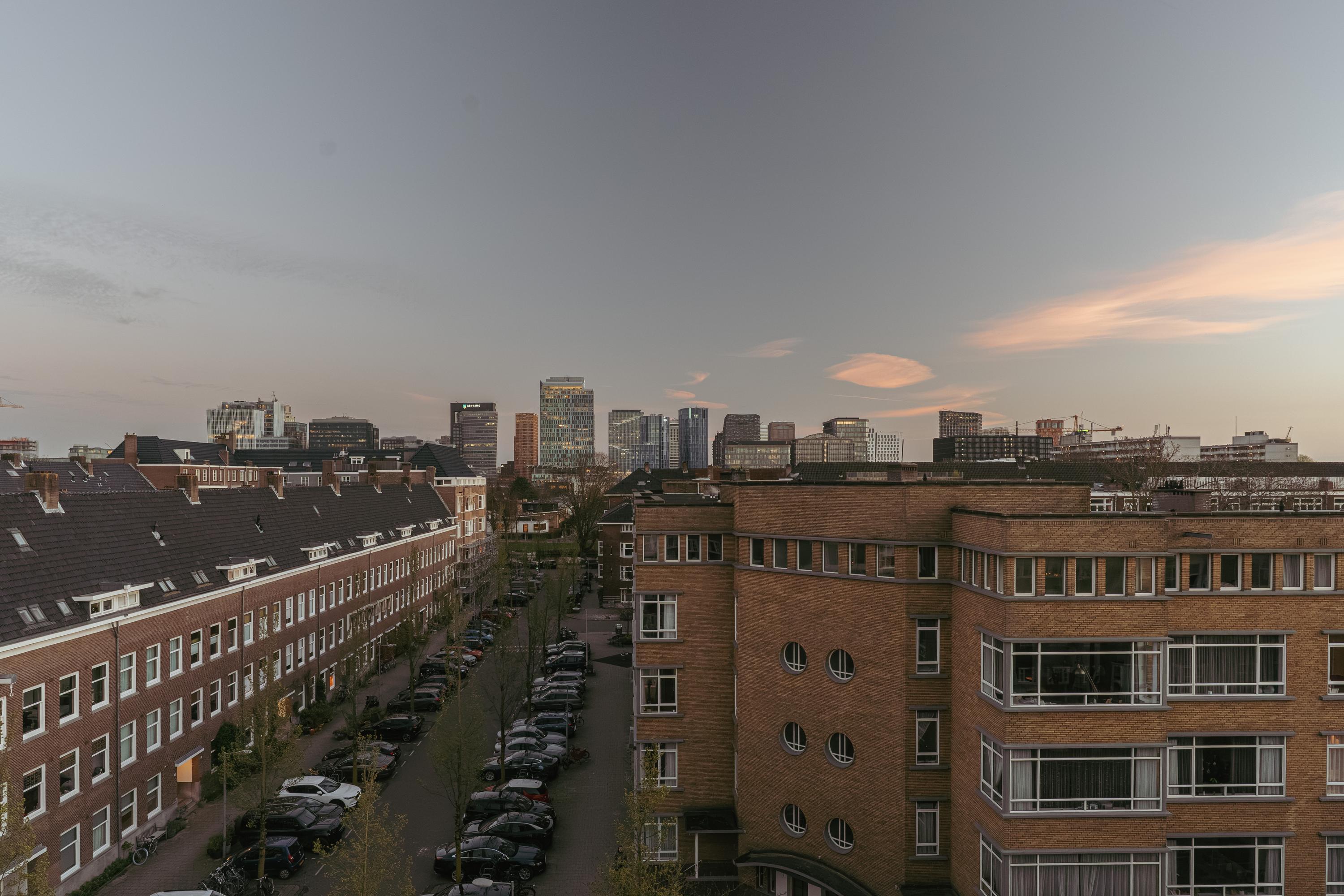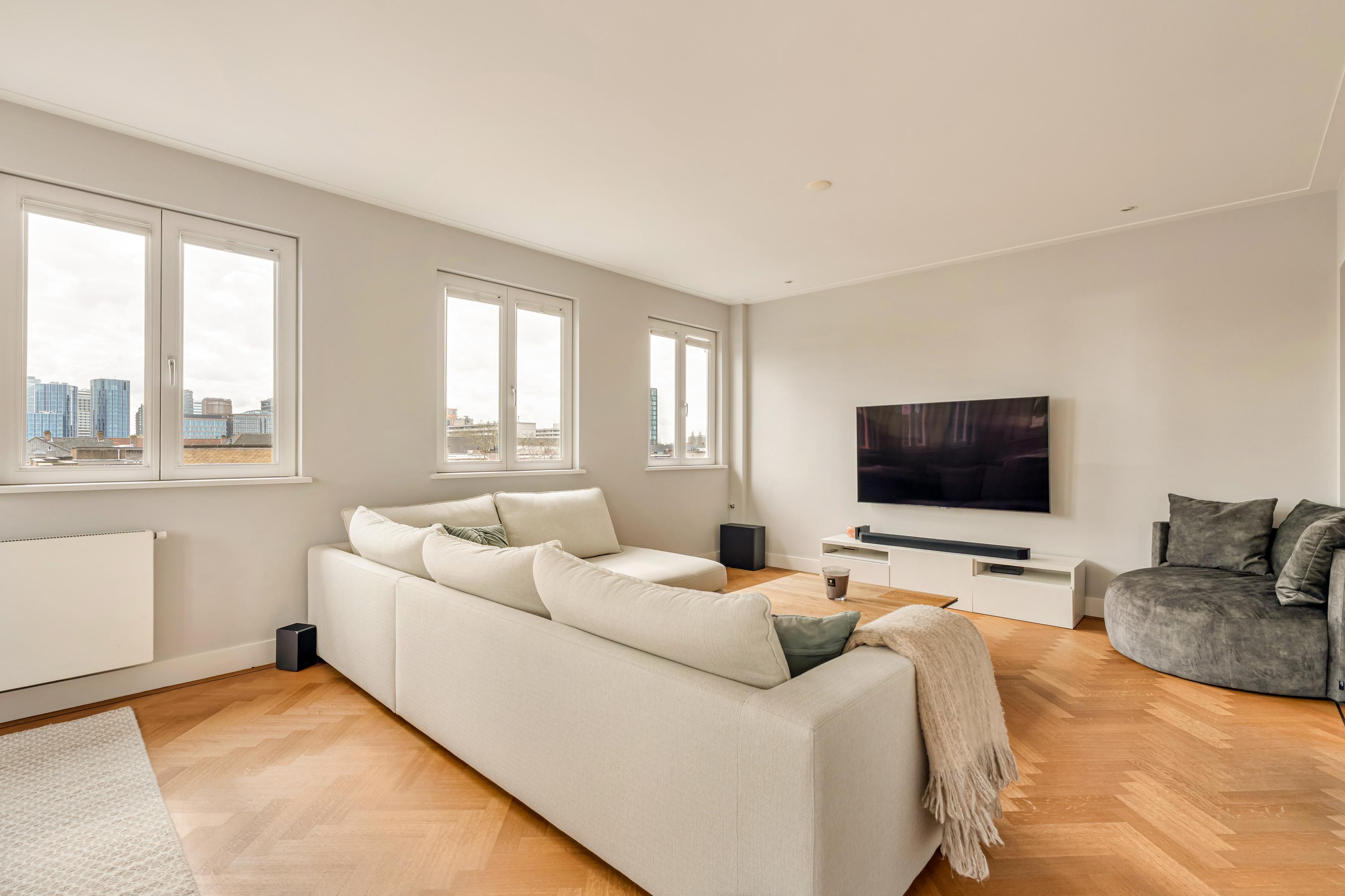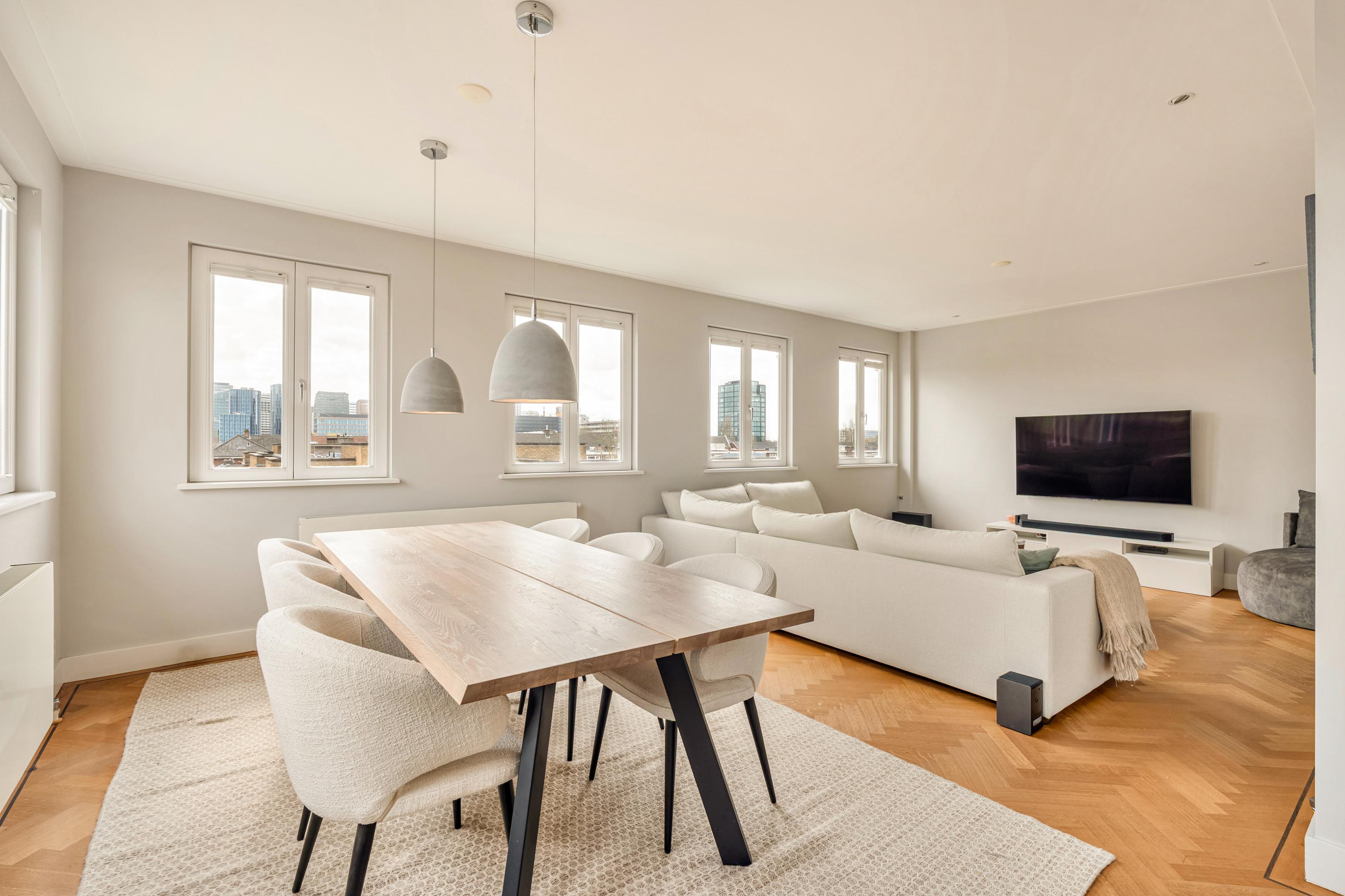 The adjacent living room fully benefits from its corner position and is exceptionally bright thanks to no fewer than eight windows. The unobstructed views over Minervaplein, Michelangelostraat, and the Zuidas skyline are impressive—especially atmospheric in the evening.