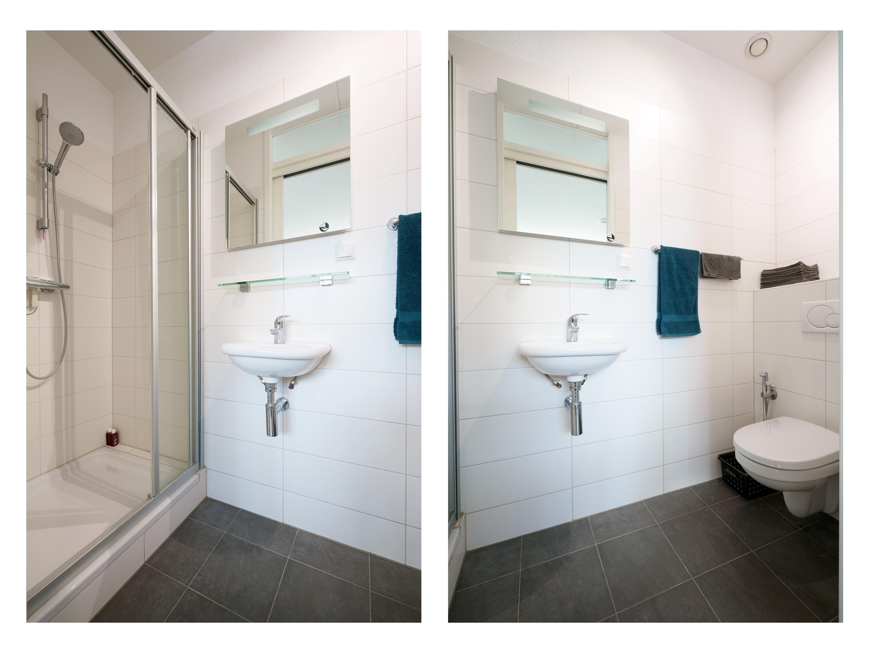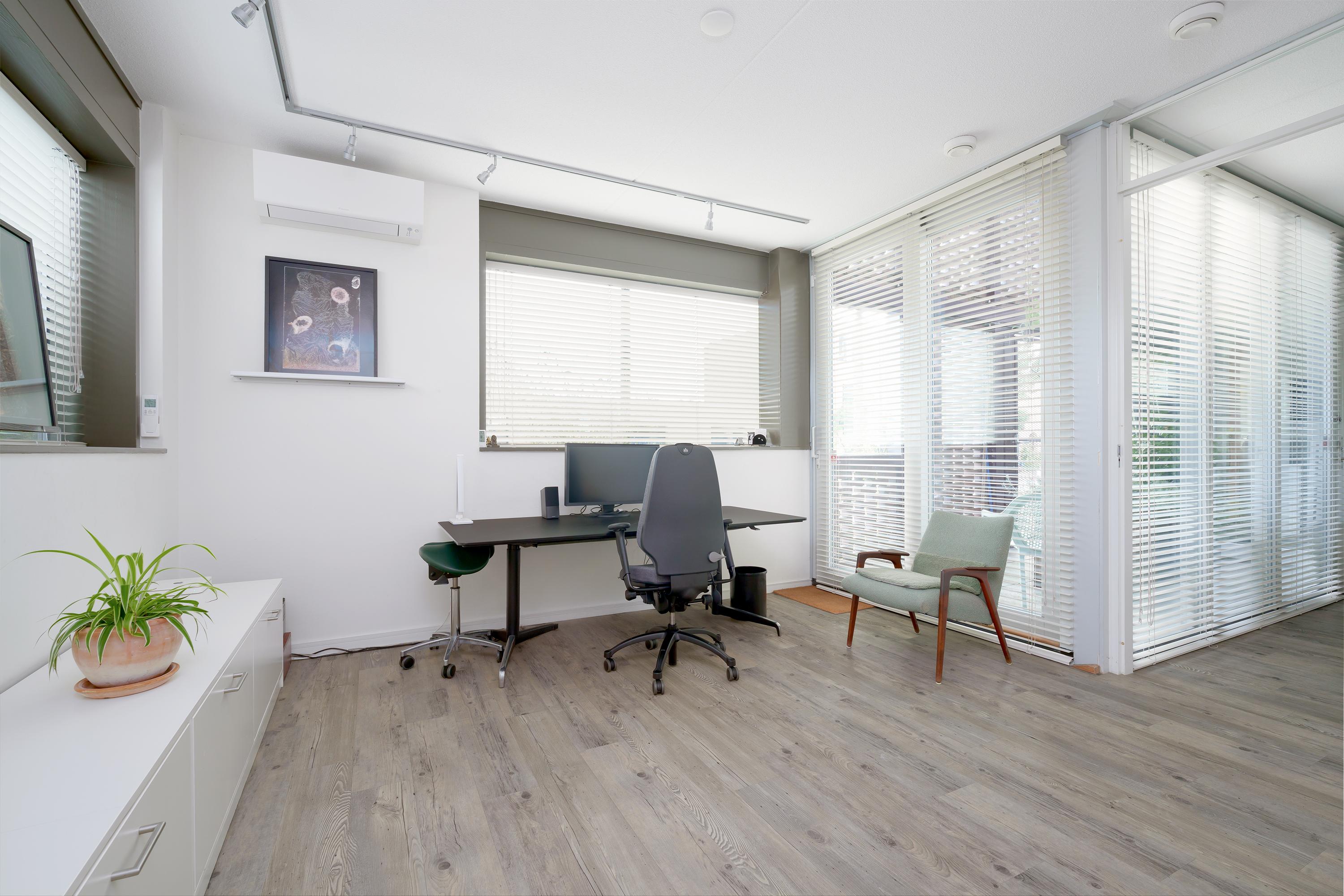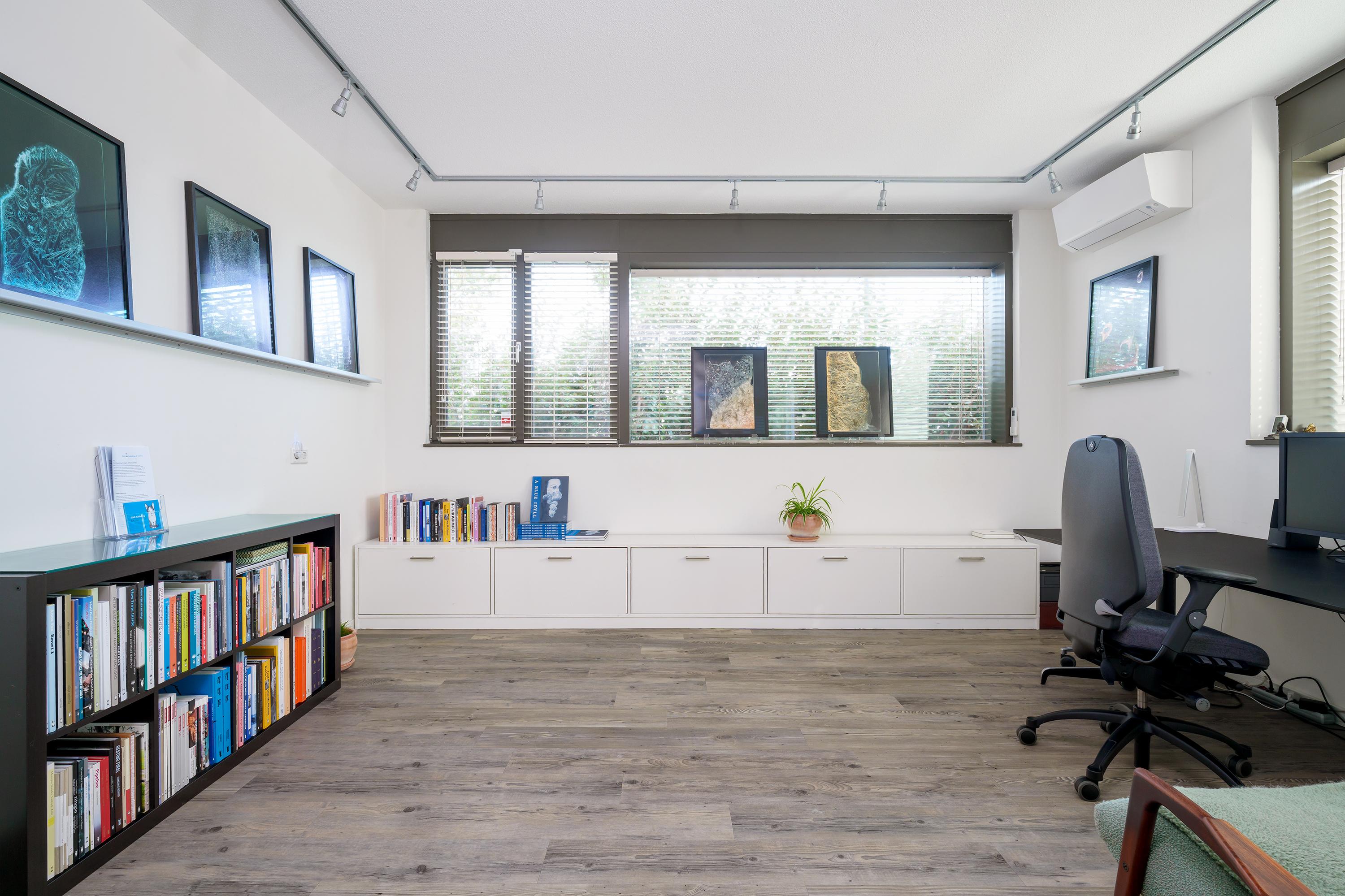 To the left of the hallway is a spacious office/bedroom of over 22 m² with its own shower and toilet. This room is also accessible via the second entrance, which leads to a large and bright storage room – ideal for storage or bicycles.