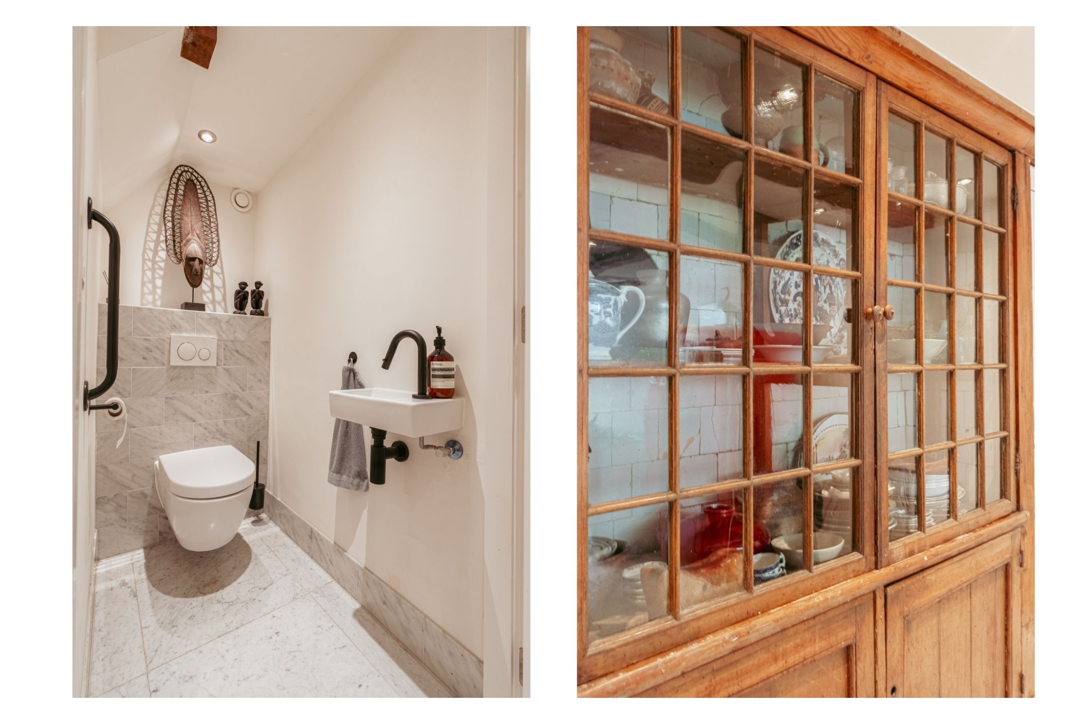 The basement is reached via the internal staircase and is spacious and functionally laid out. At the rear is the dining room with adjoining kitchen. The kitchen is located on the garden side and offers direct access to the deep rear garden, creating a pleasant connection between indoor and outdoor living. The kitchen is equipped with a Quooker, dishwasher, a freestanding gas stove with oven and a fridge-freezer combination. In addition, the kitchen features beautiful built-in wooden cabinets, ideal for extra storage space. From the kitchen there is access to a separate room with connections for a washing machine and dryer.