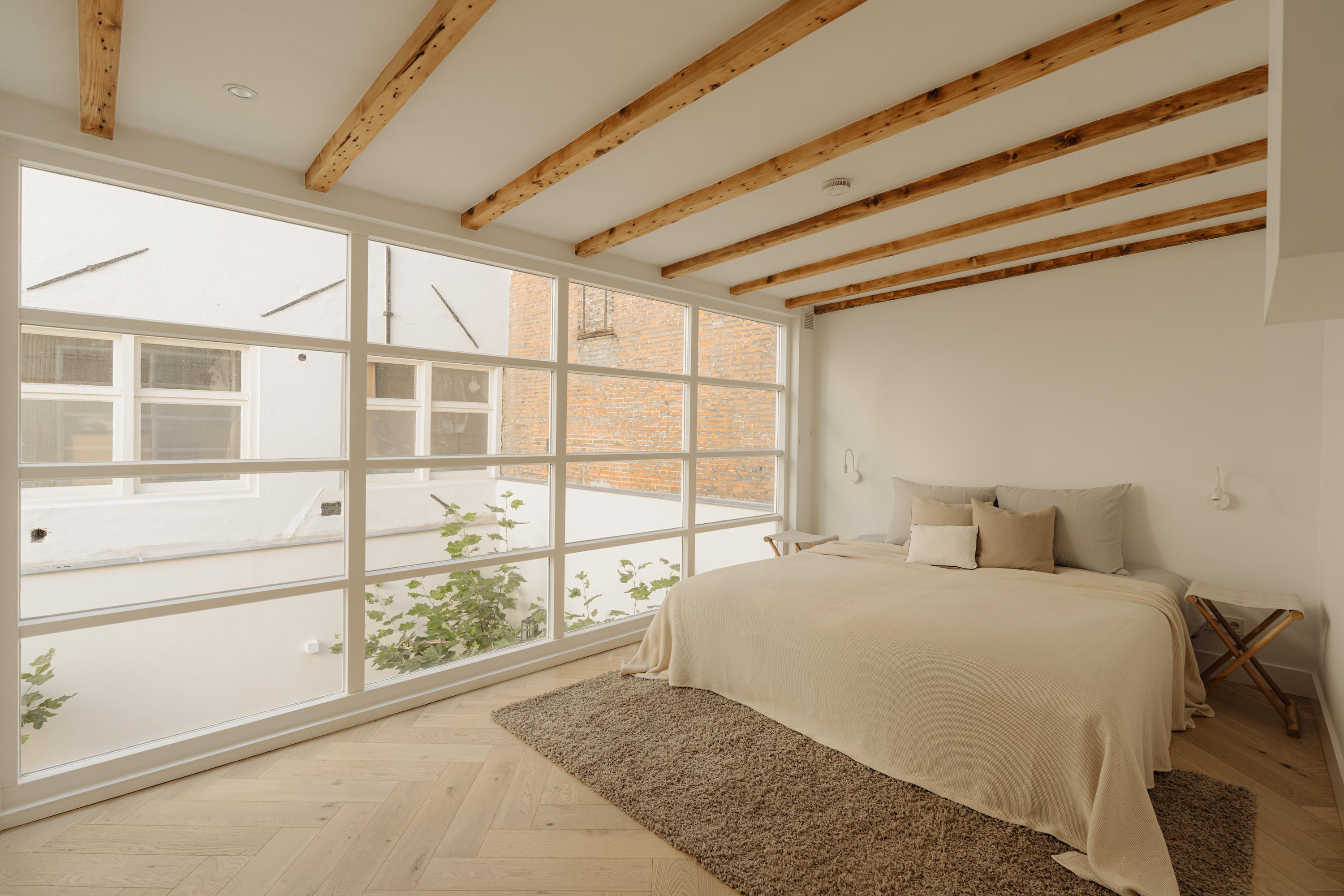 The first floor accommodates the primary bedroom at the front, offering canal views and a warm, natural, and serene ambiance thanks to its large windows. A freestanding bathtub by the window, French balcony and fireplace give the space a luxurious and intimate feel.