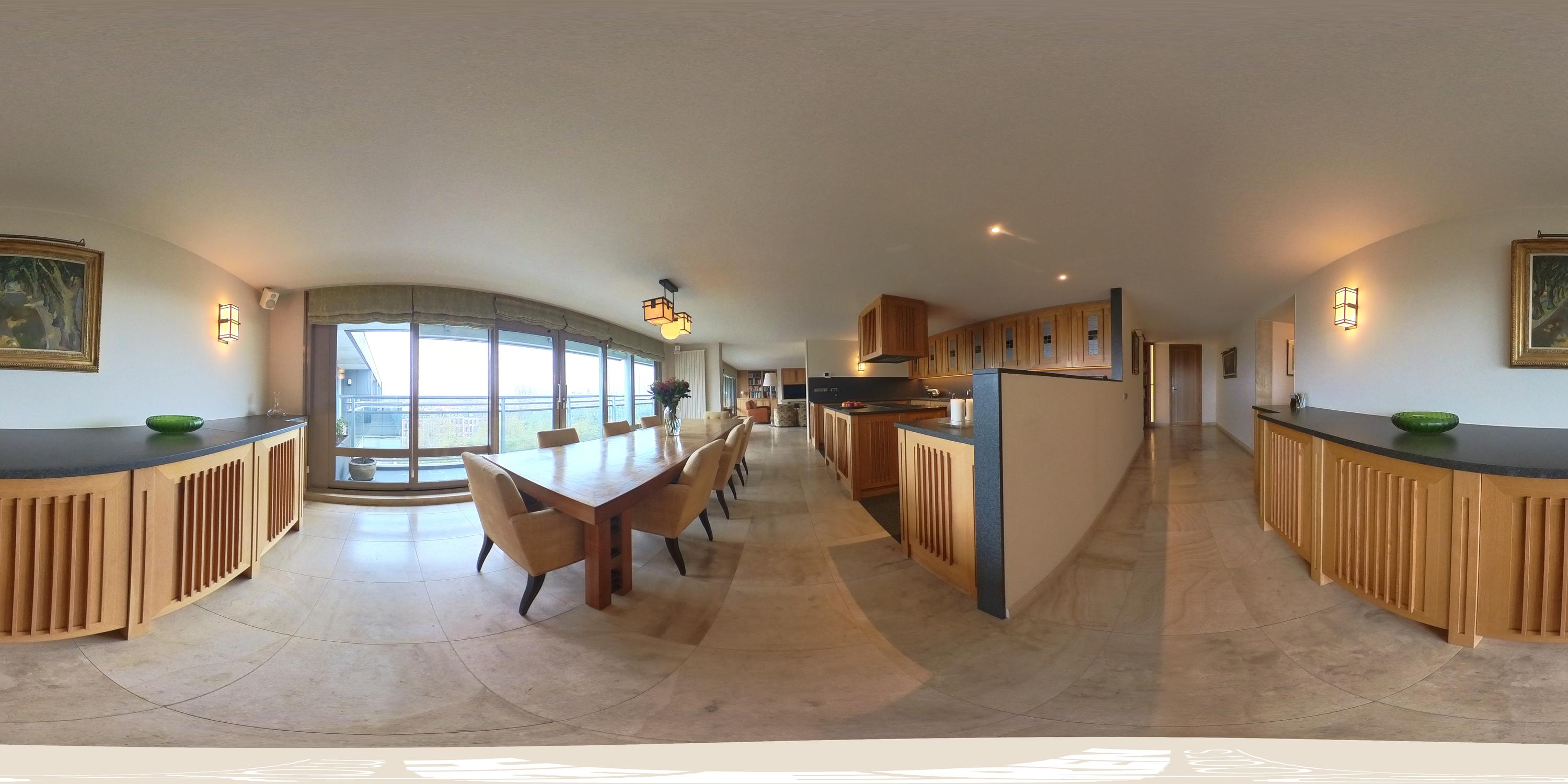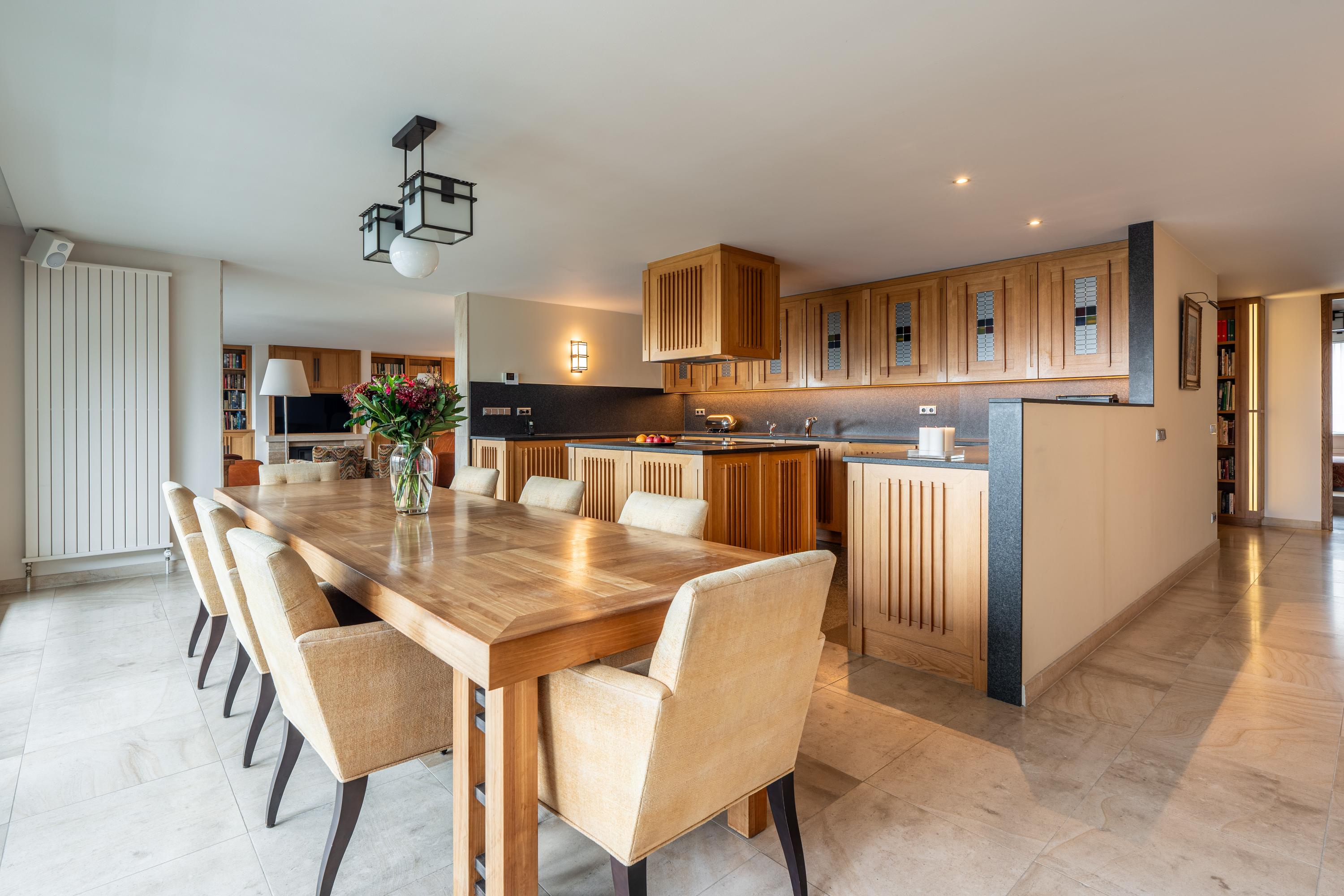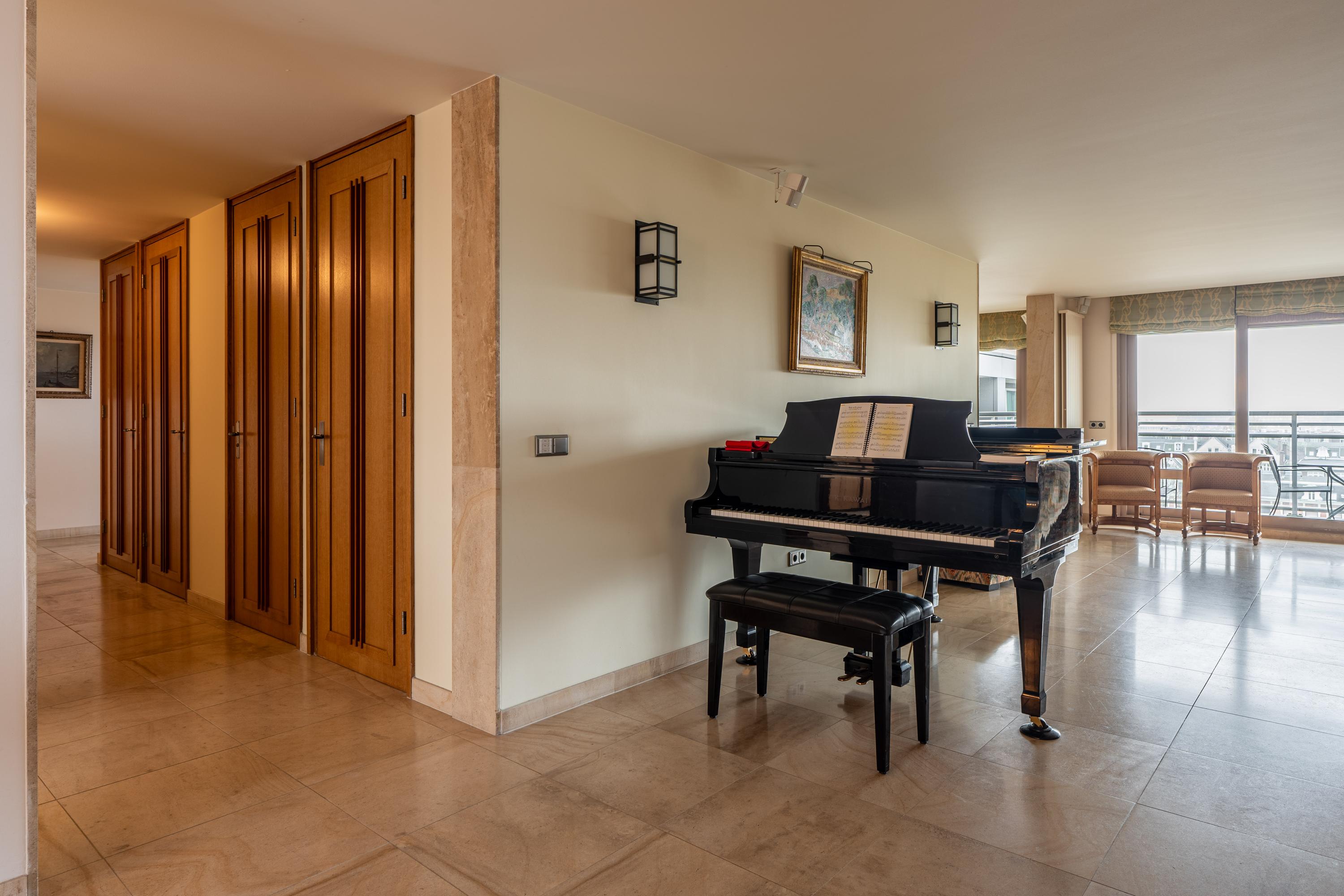 Upon entering, you are greeted by a spacious entrance hall with ample wardrobe storage on the left. From the hall, you proceed to the open-plan kitchen with a dining area. The kitchen features a cooking island with a six-burner induction hob, extractor fan, oven, three refrigerators, microwave, dishwasher, Quooker, and plenty of storage. Floor-to-ceiling glass sliding doors open onto the 25 m² balcony, which is about two meters deep, equipped with electric sunshades, and offers stunning views.